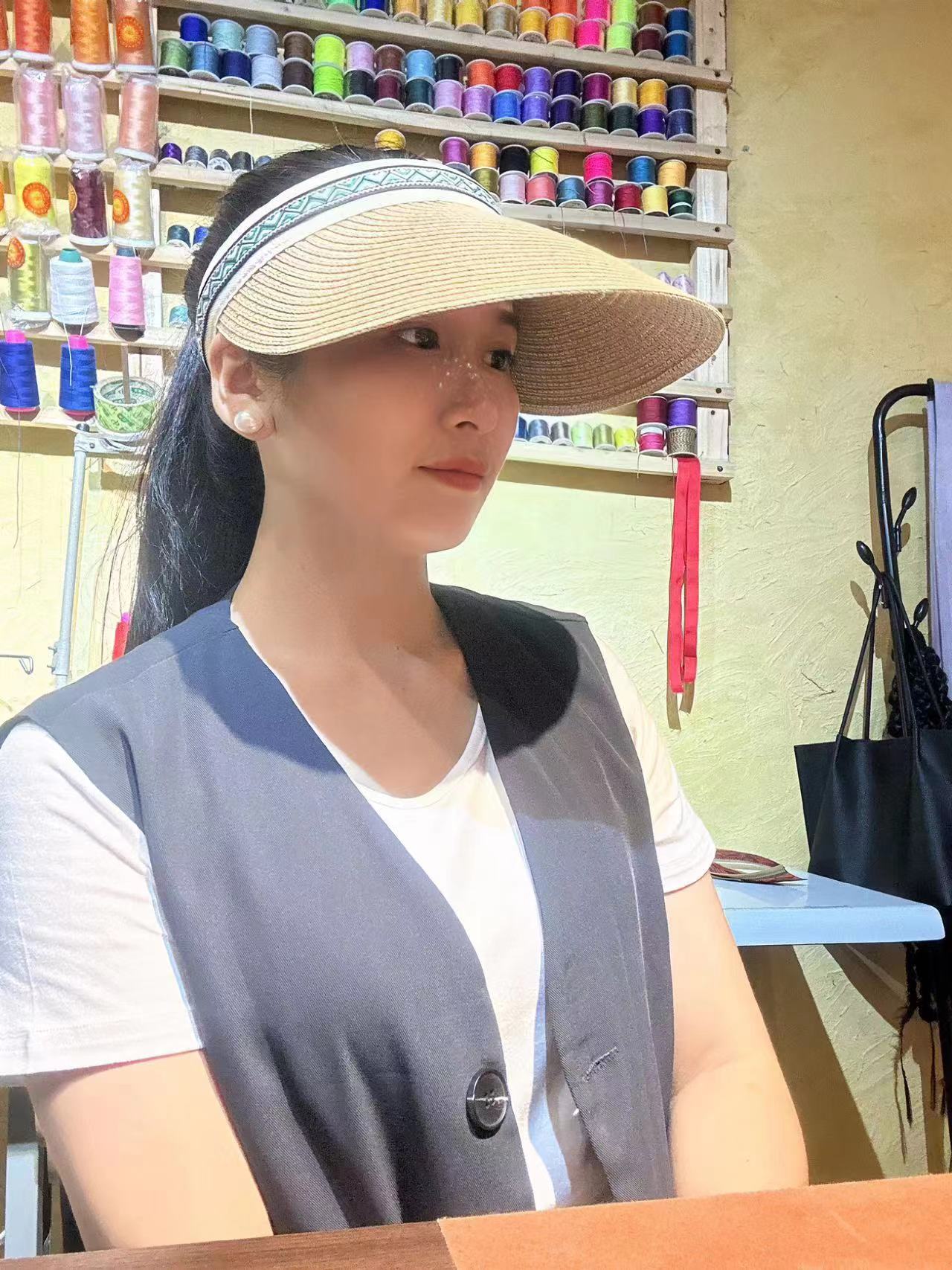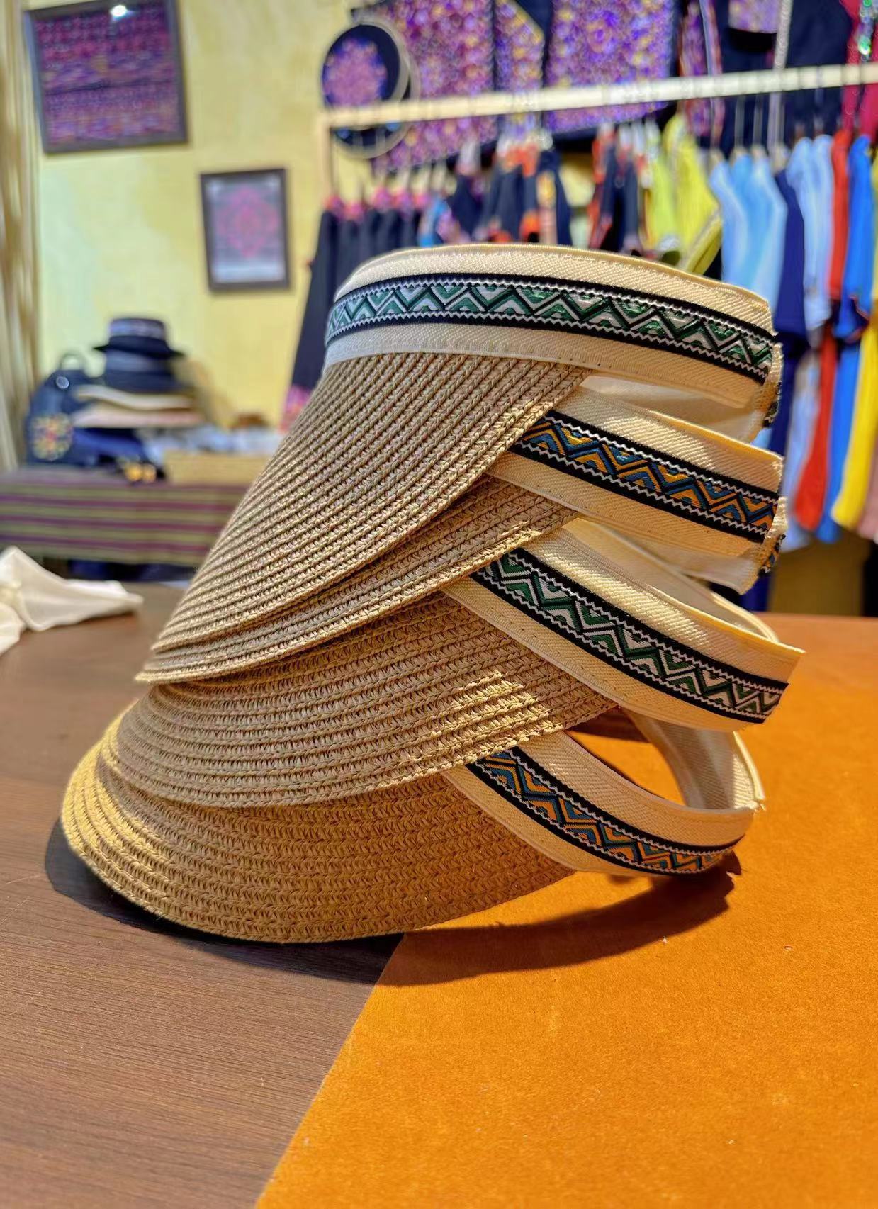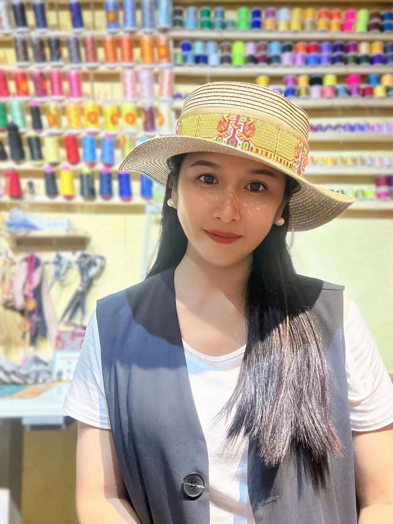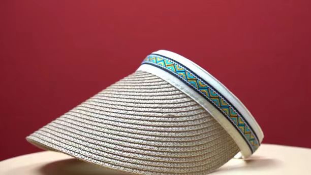 黎锦花边帽子使用的是现代化机械生产的黎锦作为边框镶嵌于帽子之上,黎锦纹样色彩鲜艳、价格实惠、佩戴时尚。
