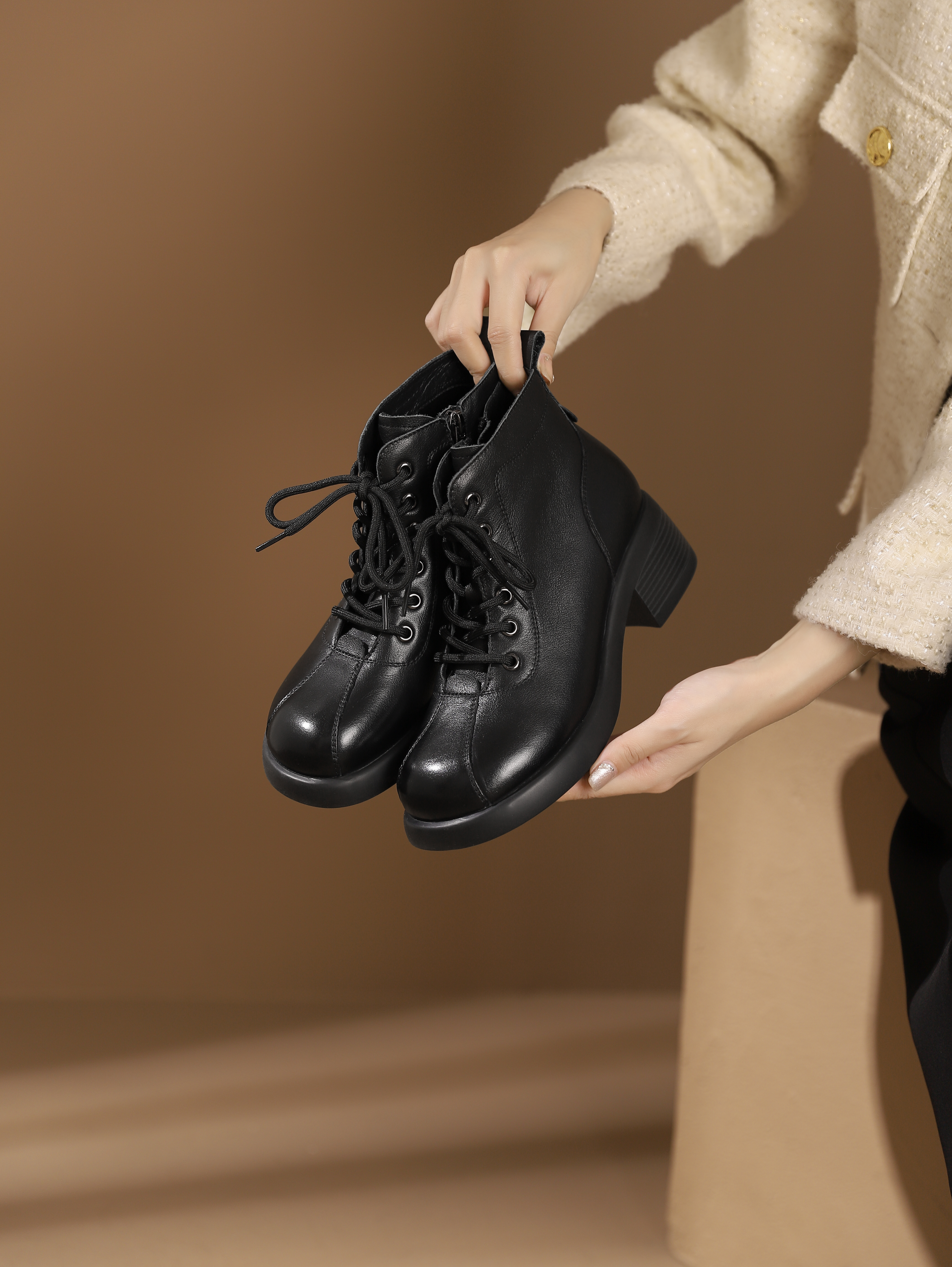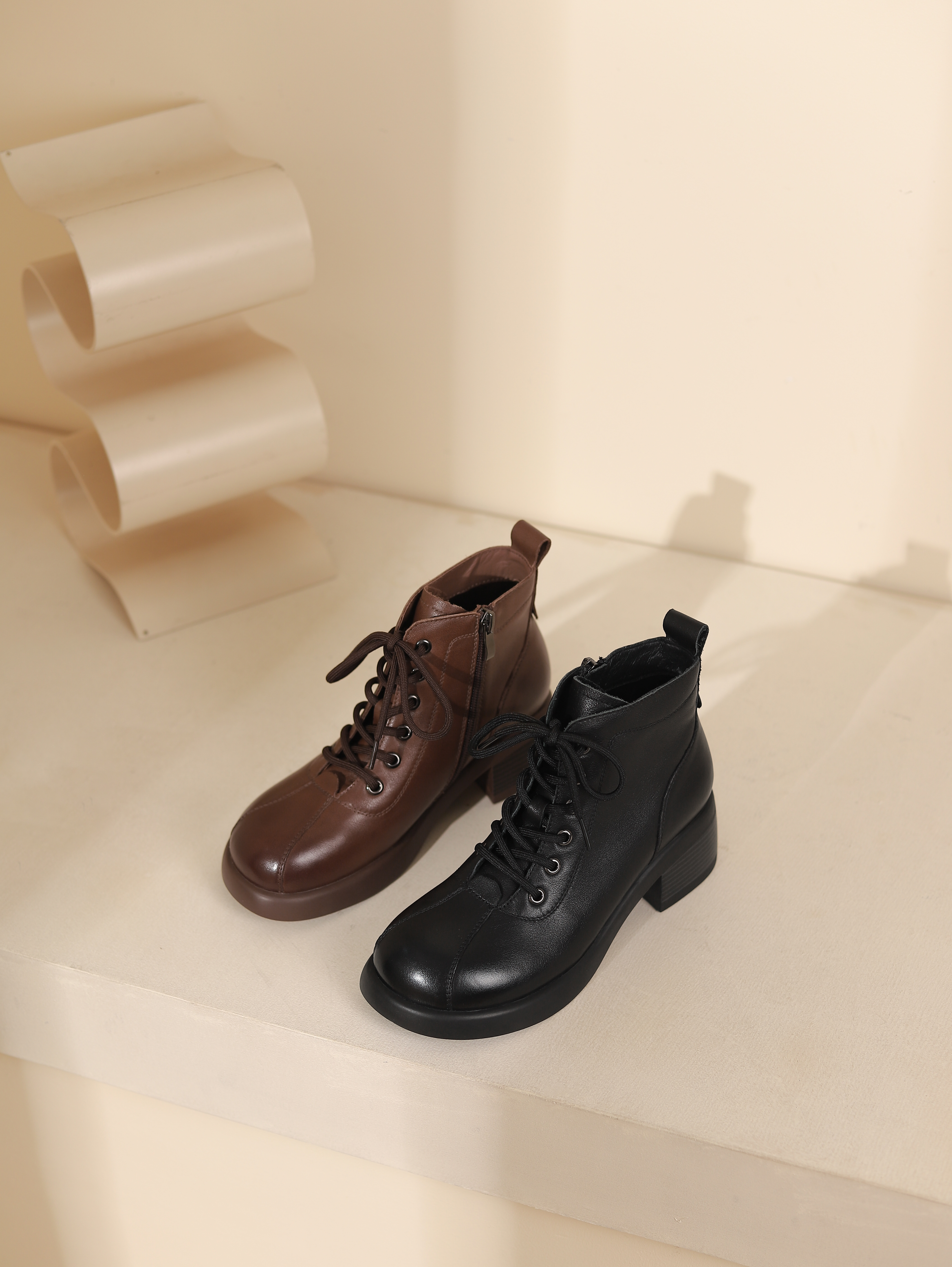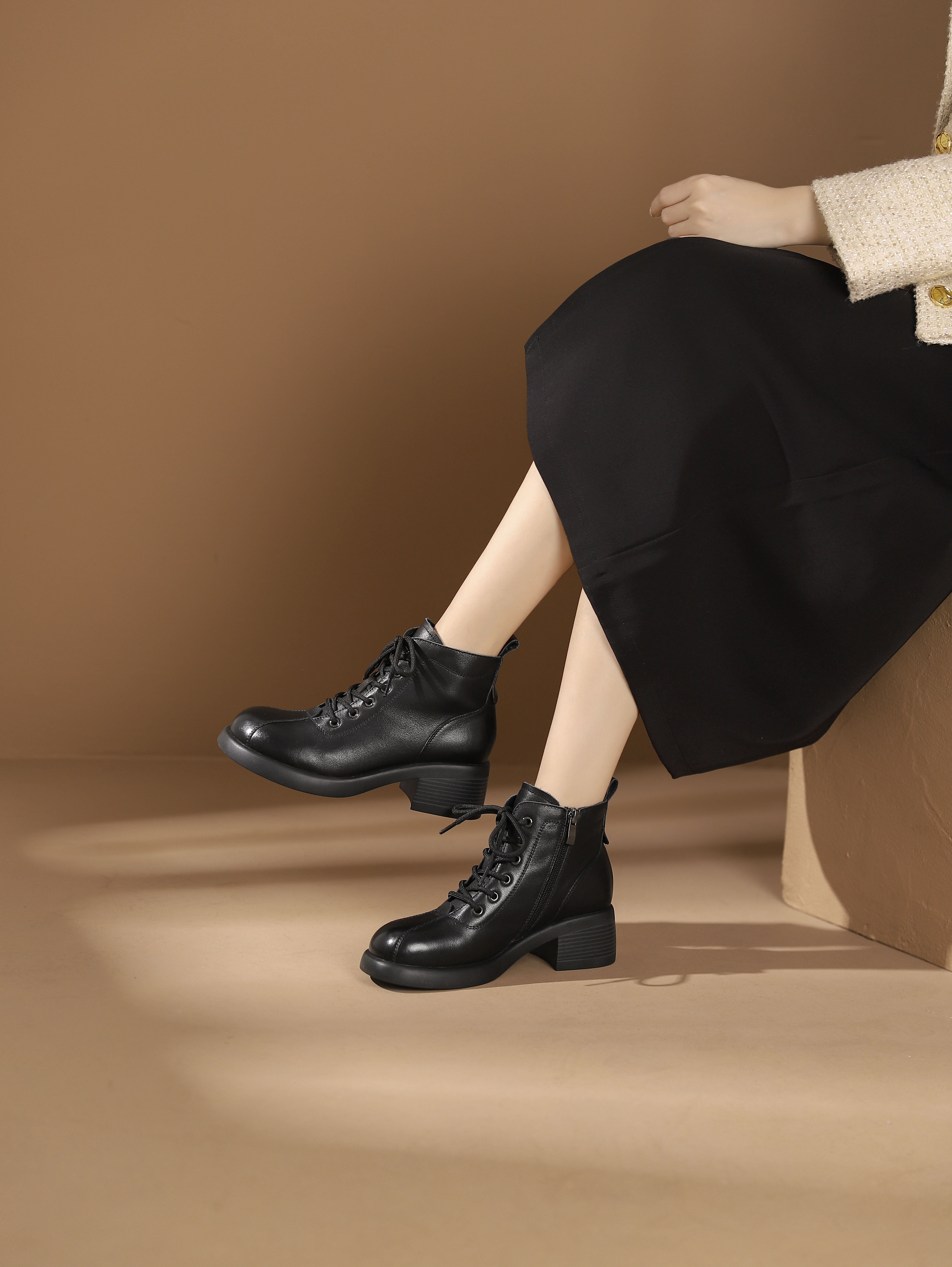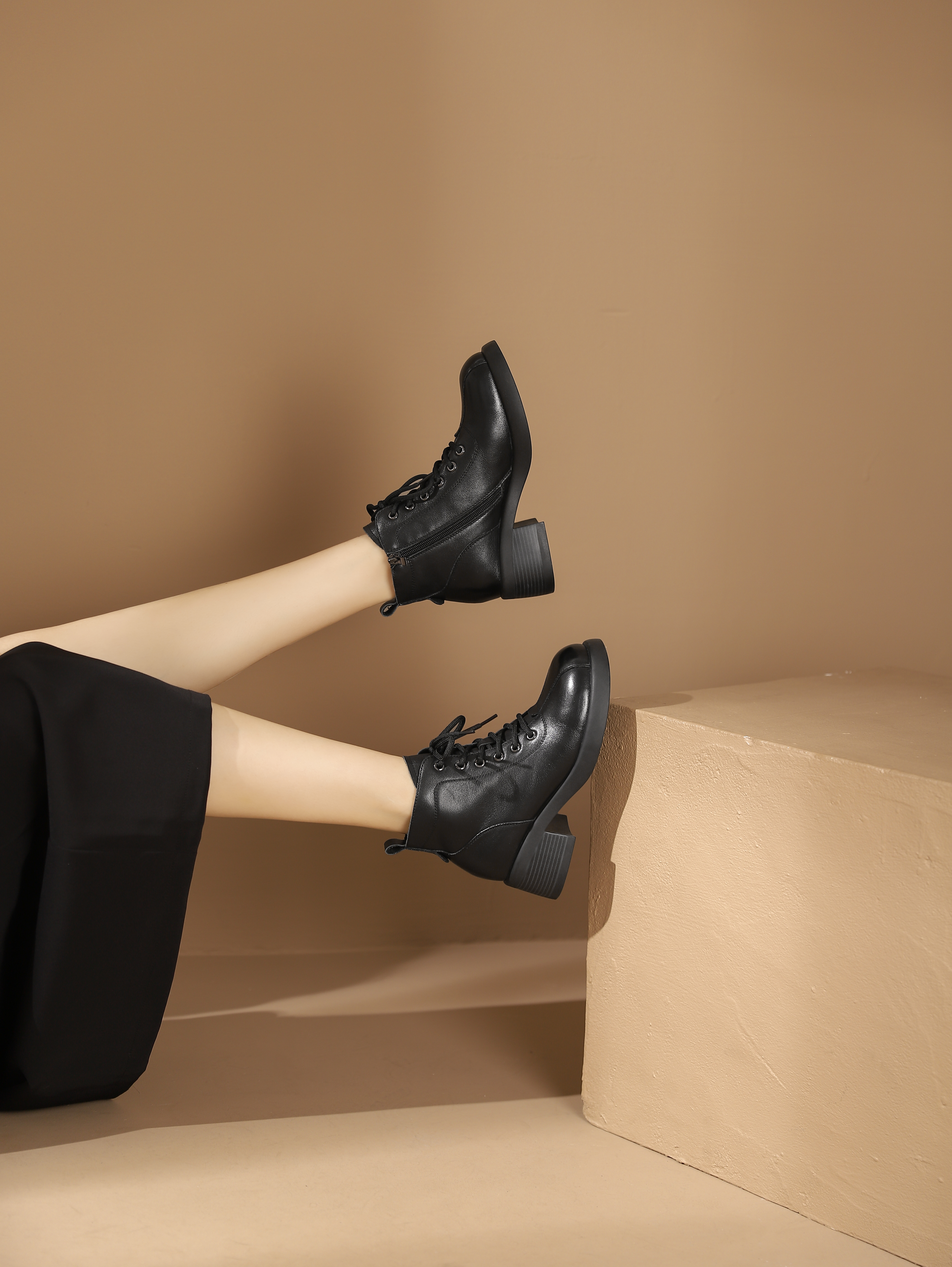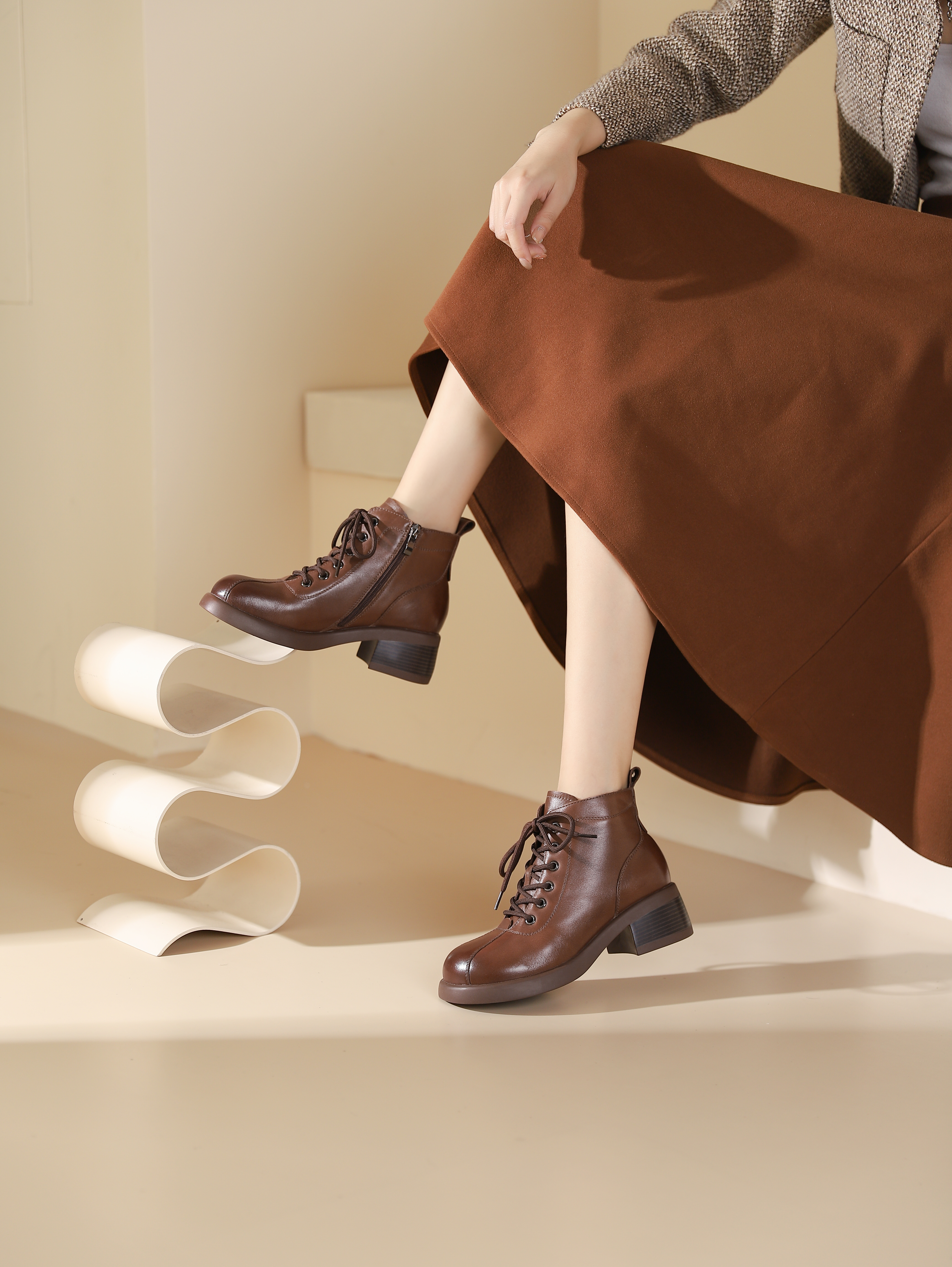 西村名物2023秋季新品复古圆头粗跟裸靴系带短靴马丁靴X23DS46511