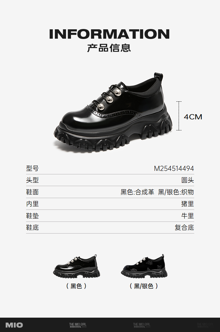 MIO米奥牛津鞋女深口单鞋中性运动厚底增高德比鞋M254514494