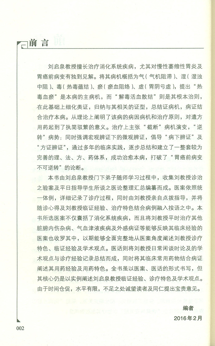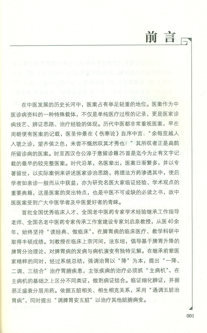 本书以医案、医话的形式总结阐述刘启泉教授诊疗脾胃病及相关疾病的临证经验。全书分为学术思想篇、医案篇、医话篇三部分。学术思想篇概述了刘教授辨治脾胃病及内科杂病的临证诊疗思路;医案篇则整理了刘教授丰富的临床验案,涵盖了消化系统常见病及其他部分外感、内科病证,涉及中医脾胃病、肝胆病、肺系疾病、心系疾病及肿瘤;医话篇则总结了刘教授与学生平日交谈中传授的临证心得及临床经验。本书系统全面地反映了刘教授“一降、二调、三结合”“通调五脏治脾胃”“病下辨证”“调脾胃安五脏”的诊疗思路及腹诊和临床特色用药。