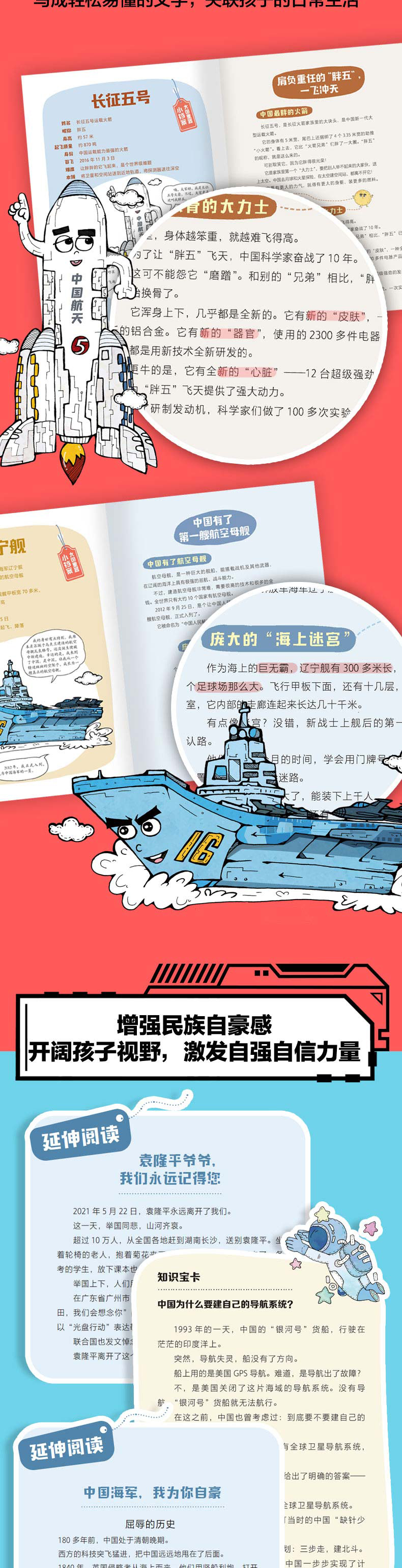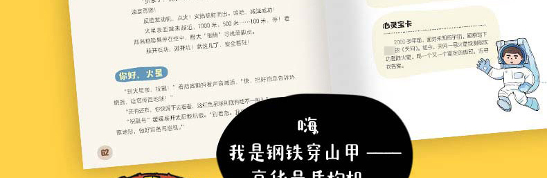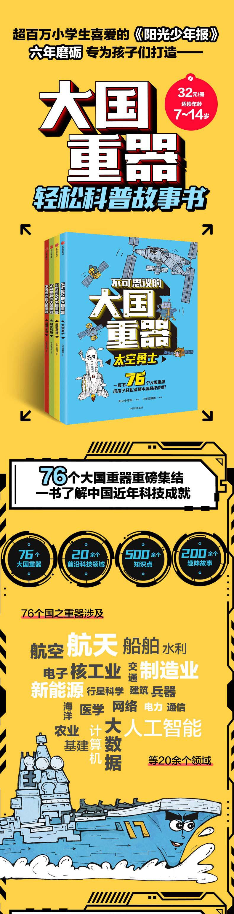 《不可思议的大国重器》是一套适合于7-14岁儿童阅读的科普故事书。本套系包含4个分册,分别为《太空勇士》《超能英雄》《民生科技》《超级工程》,共收录我国22个领域、76个“大国重器”科技成就及其背后的发展故事。每册书通过拟人化的角色塑造,向小读者们趣味讲述我国“海陆空”领域的很好设备、领先全球的技术手段以及超大型工程项目。让孩子真正了解祖国的繁荣富强和中国制造的高光时刻,培养孩子们的科技素养的同时,从小培养大国自信。