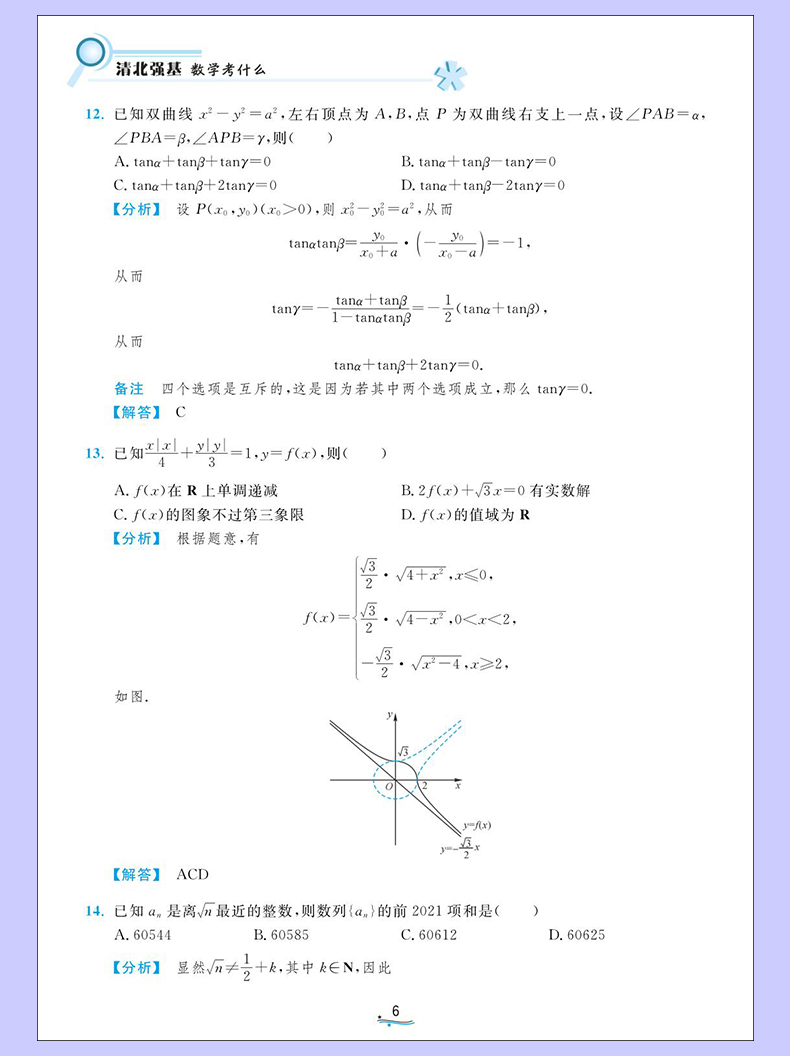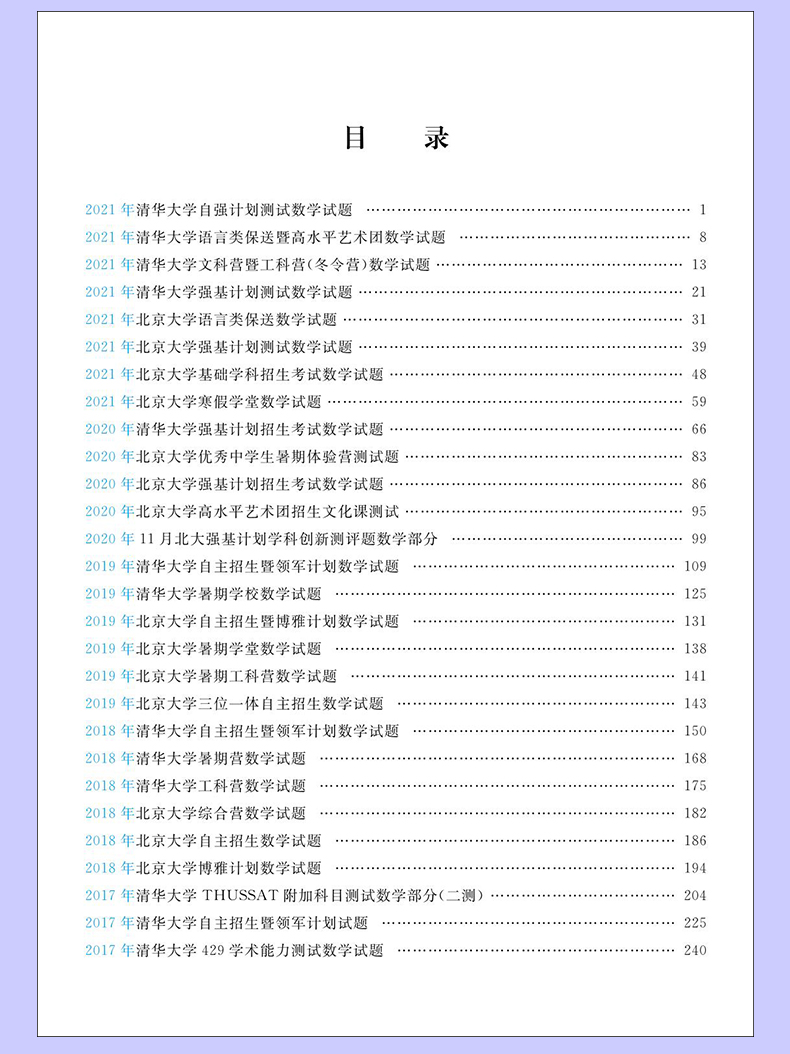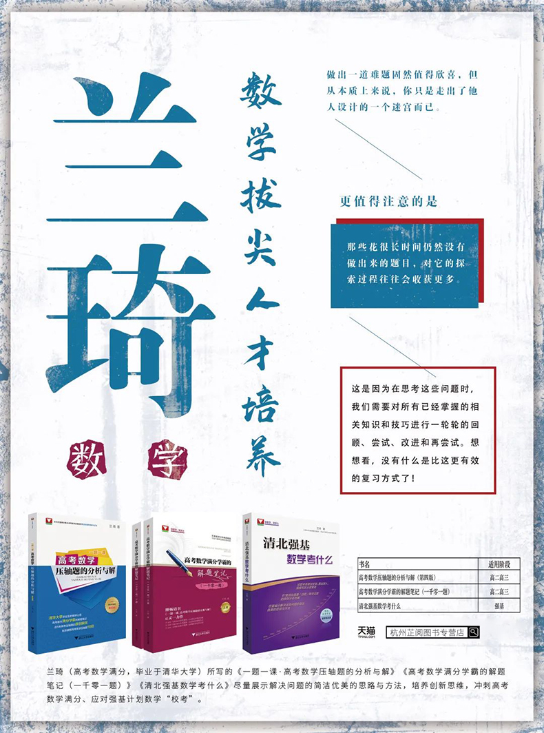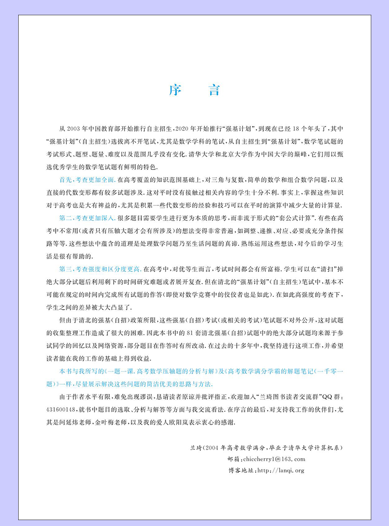 从2003年中国教育部开始推行自主招生(2020年开始是强基计划)到现在已经18个年头了,其中自主招生(强基计划)选拔离不开笔试,尤其是数学学科的笔试。清华大学和北京大学作为中国大学的巅峰,它们用以甄选优秀学生的数学笔试题有鲜明的特色。本书中的绝大部分试题均来源于参试同学的回忆以及网络资源,部分题目在作答时有所改动。在过去的十多年中,兰琦老师坚持进行这项工作,本书与他所写的《一题一课:高考数学压轴题的分析与解》及《高考数学满分学霸的解题笔记(一千零一题)》一样,尽量展示解决这些问题的简洁优美的思路与方法。