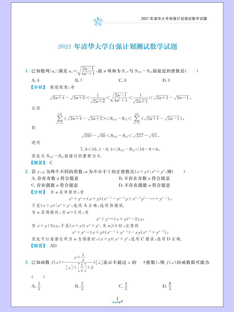 2021年清华大学语言类保送暨高水平艺术团数学试题