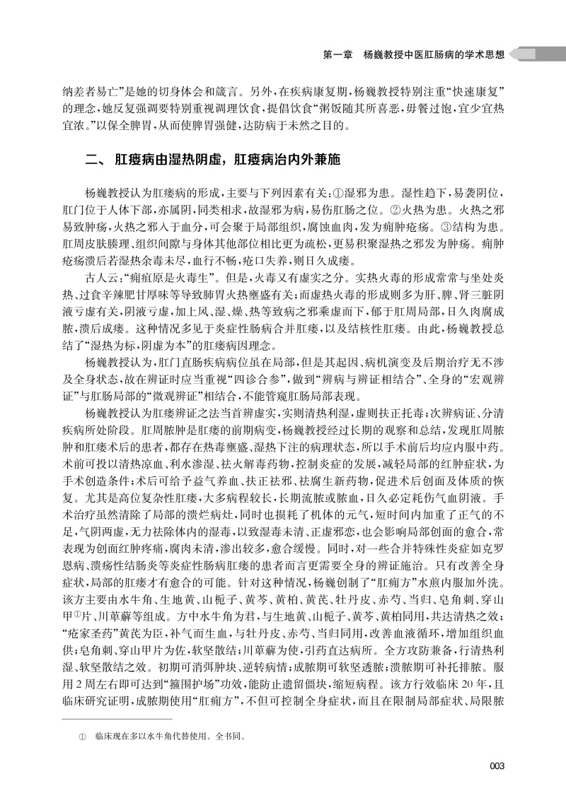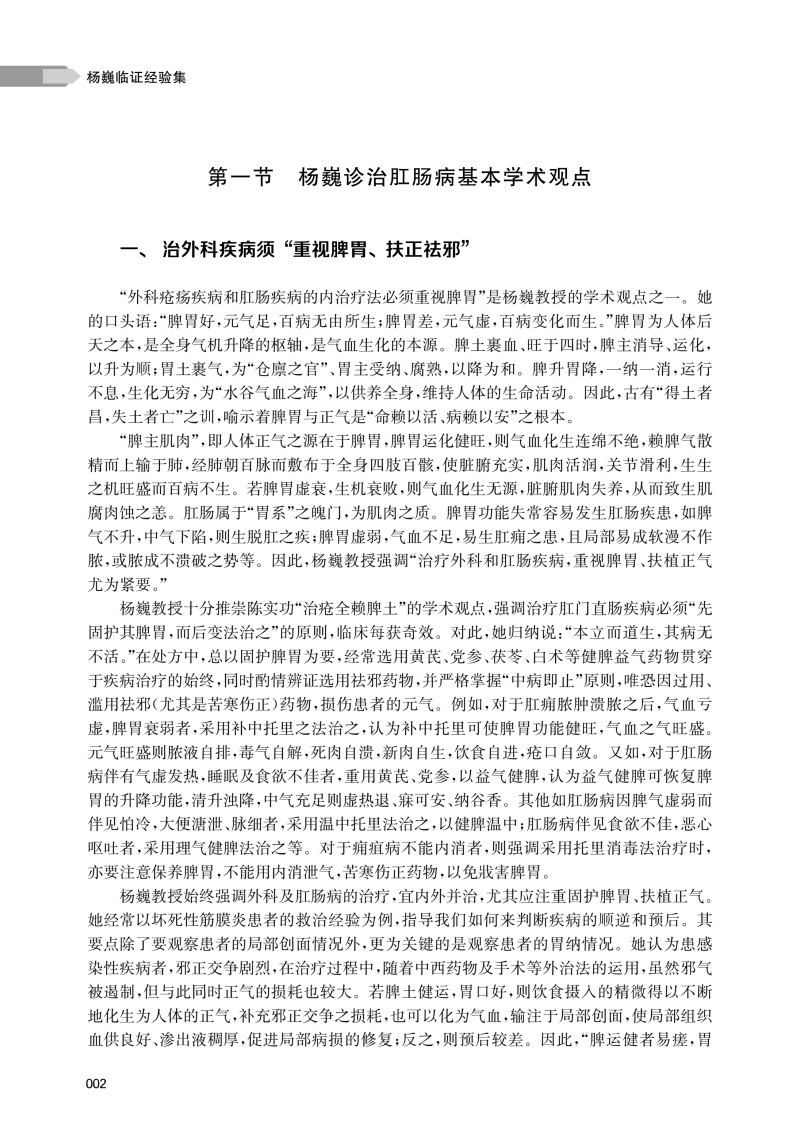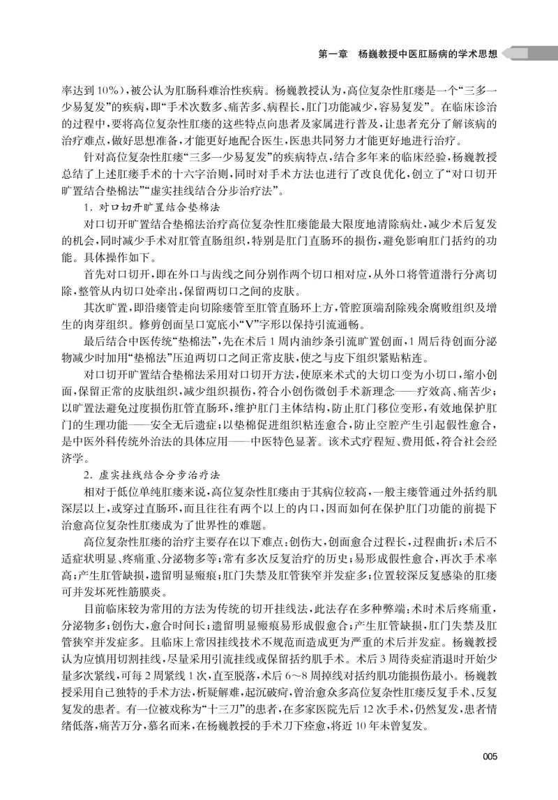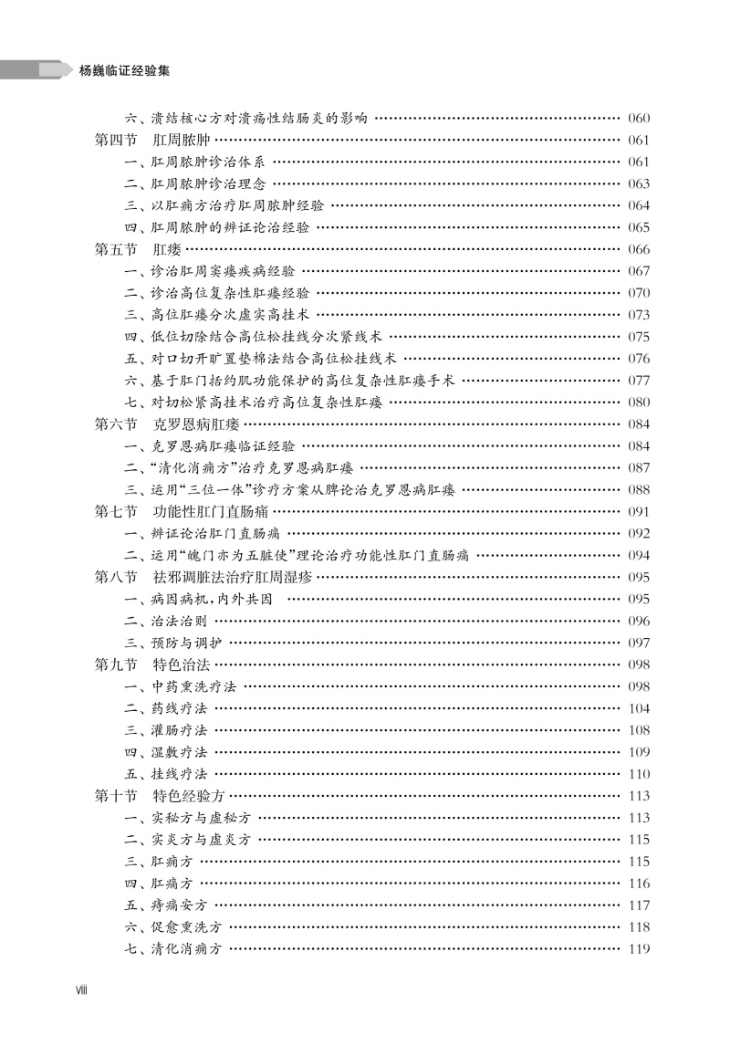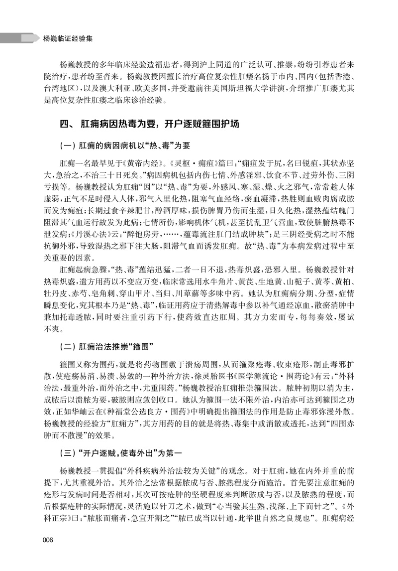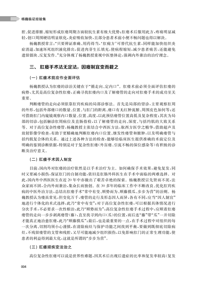 本书共分四章,系统总结了作为第四批上海市名中医、全国老中医药专家学术经验继承工作指导老师的上海中医药大学附属曙光医院肛肠科杨巍教授40余年的中医学术思想与临床实践精华。本书对杨巍教授诊治肛肠疾病的学术思想、临床经验做了系统的介绍,通过精选常见肛肠疾病诊治理念的归纳、总结和相应疑难肛肠疾病临床医案的深度剖析,以展现杨巍教授“中西结合、疗效为先”“整体观念、内外同治”的肛肠学术思想。具体内容包括诊断、辨证分析、内治法、外治法、手术方法等各方面内容。其中内容最丰富的临床经验部分全面阐述杨巍教授对各类肛肠疾病的临诊经验,并专门对经验方、协定方、特色诊疗技术和中西医结合临床科研成果做了详细介绍。本书最后简单介绍其学术经验继承团队和名中医工作室成员的个人简历,构建起“临床-理论-传承”三位一体的体系。杨巍教授将中医整体观与精准治疗结合,其临证经验集不仅仅是个人学术集大成之作,更彰显了中医药守正创新的时代价值。