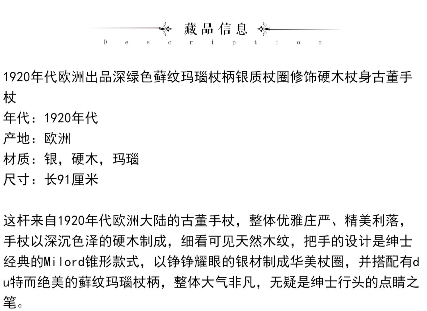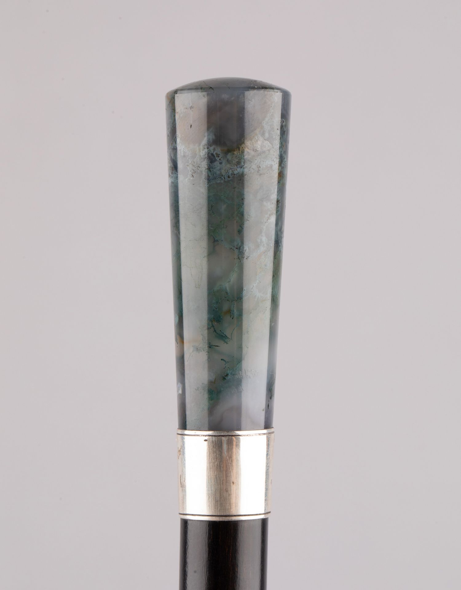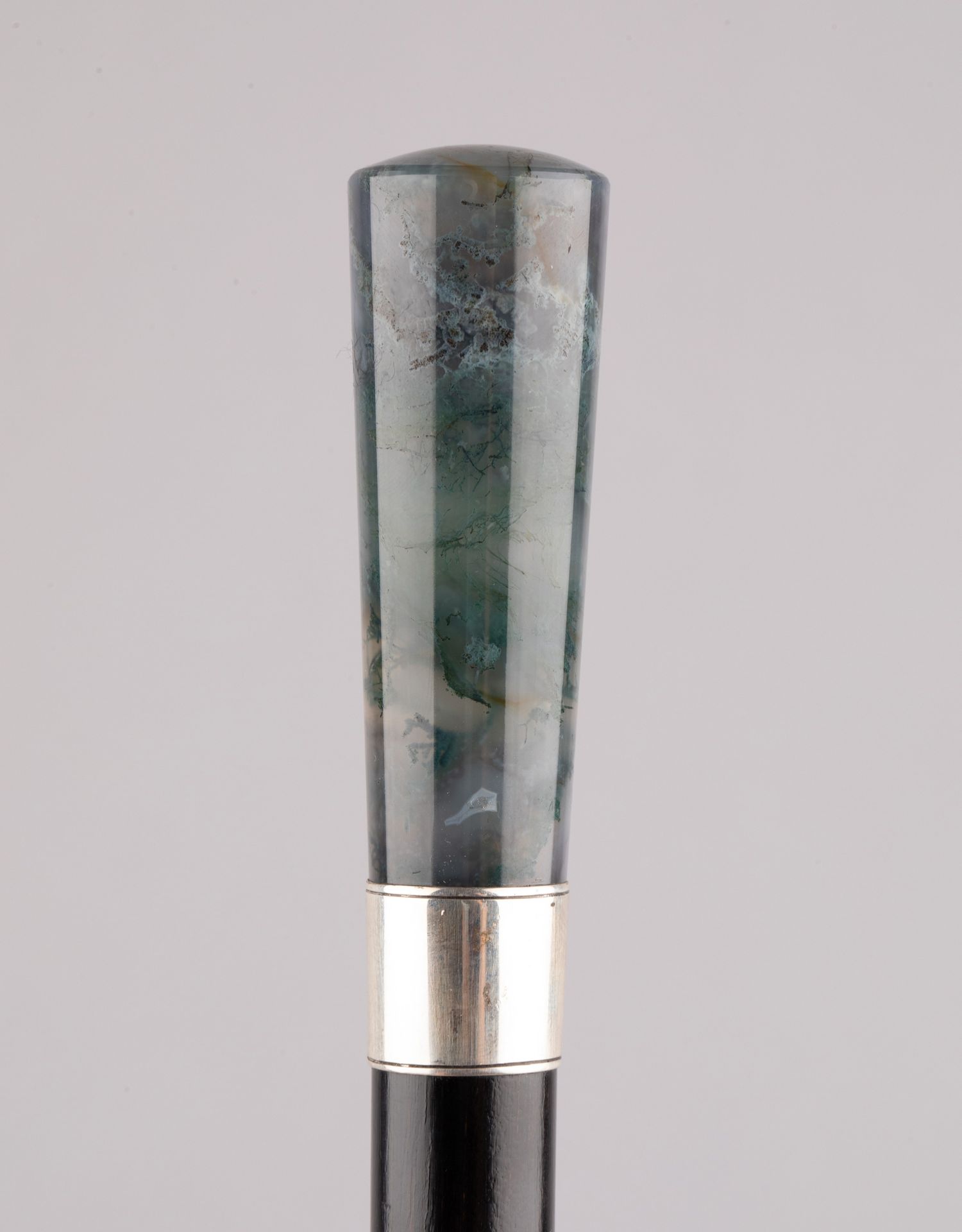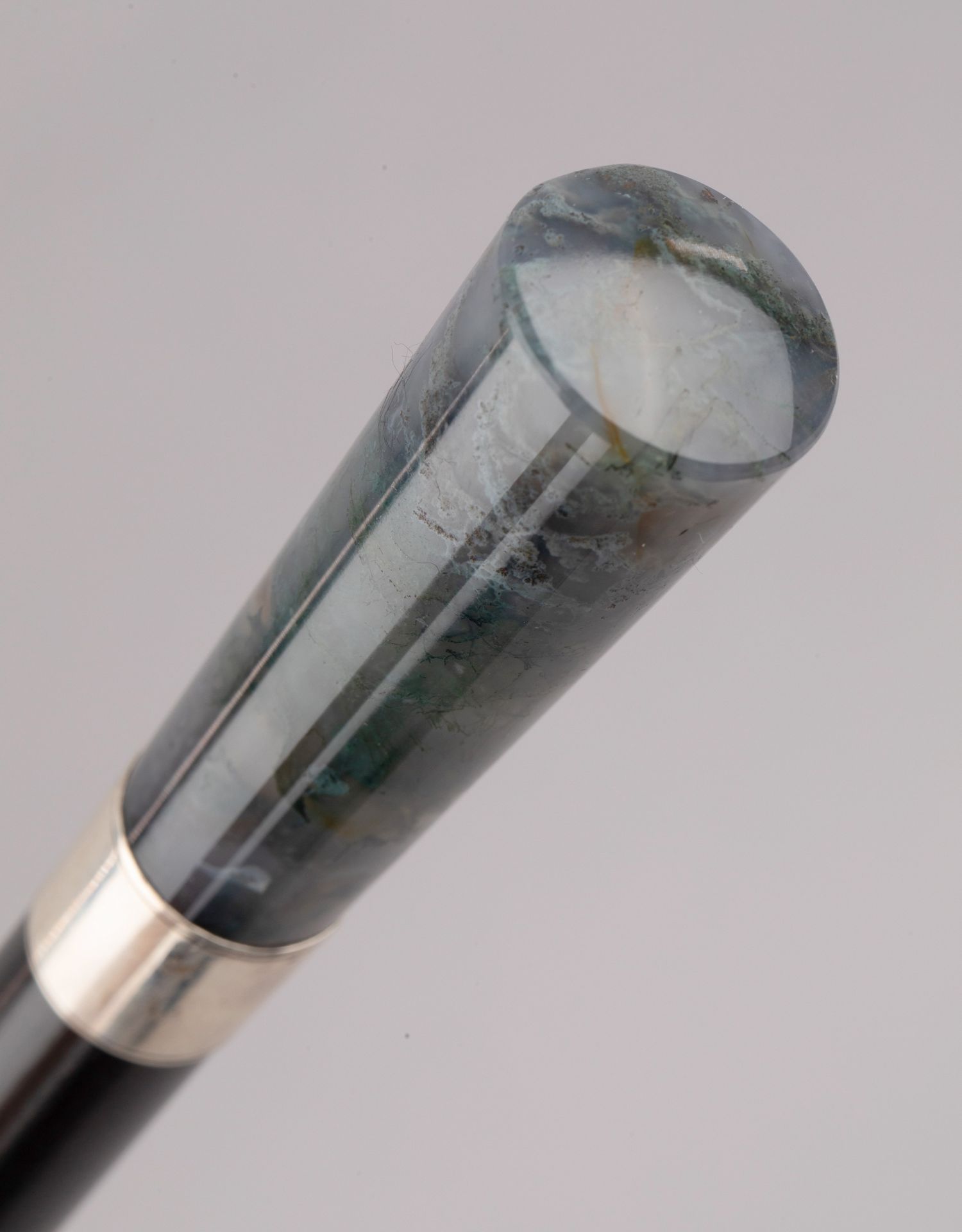 独角鹿西洋古董欧洲深绿色藓纹玛瑙杖柄银质杖圈硬木杖身古董手杖