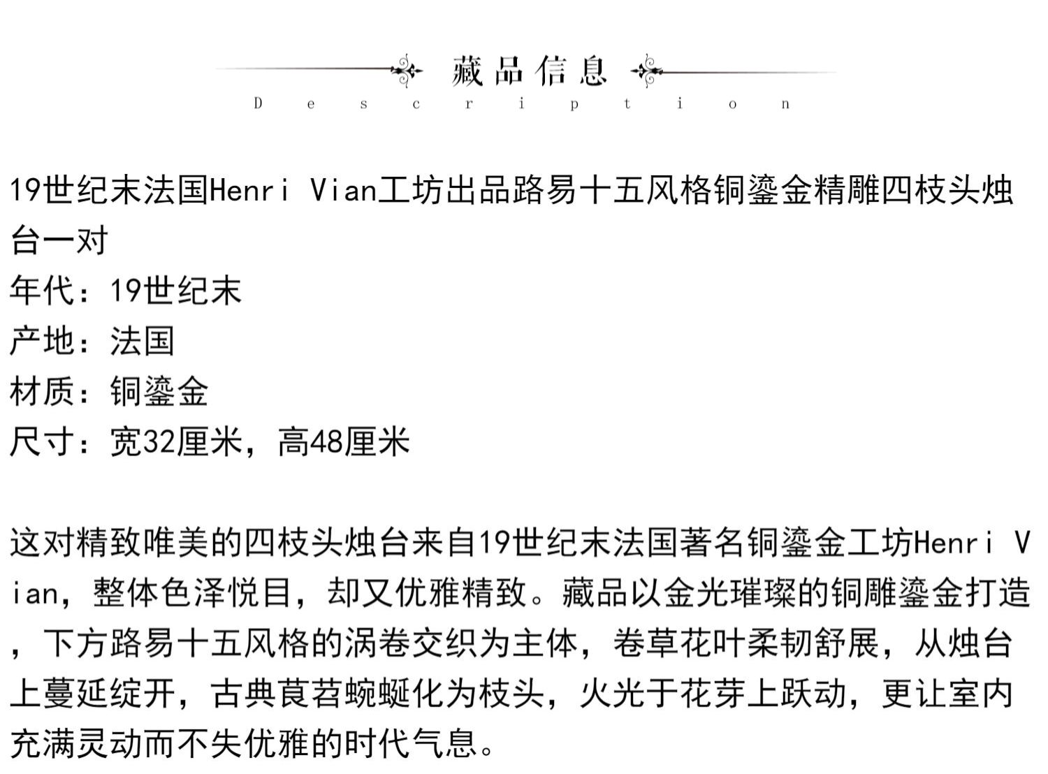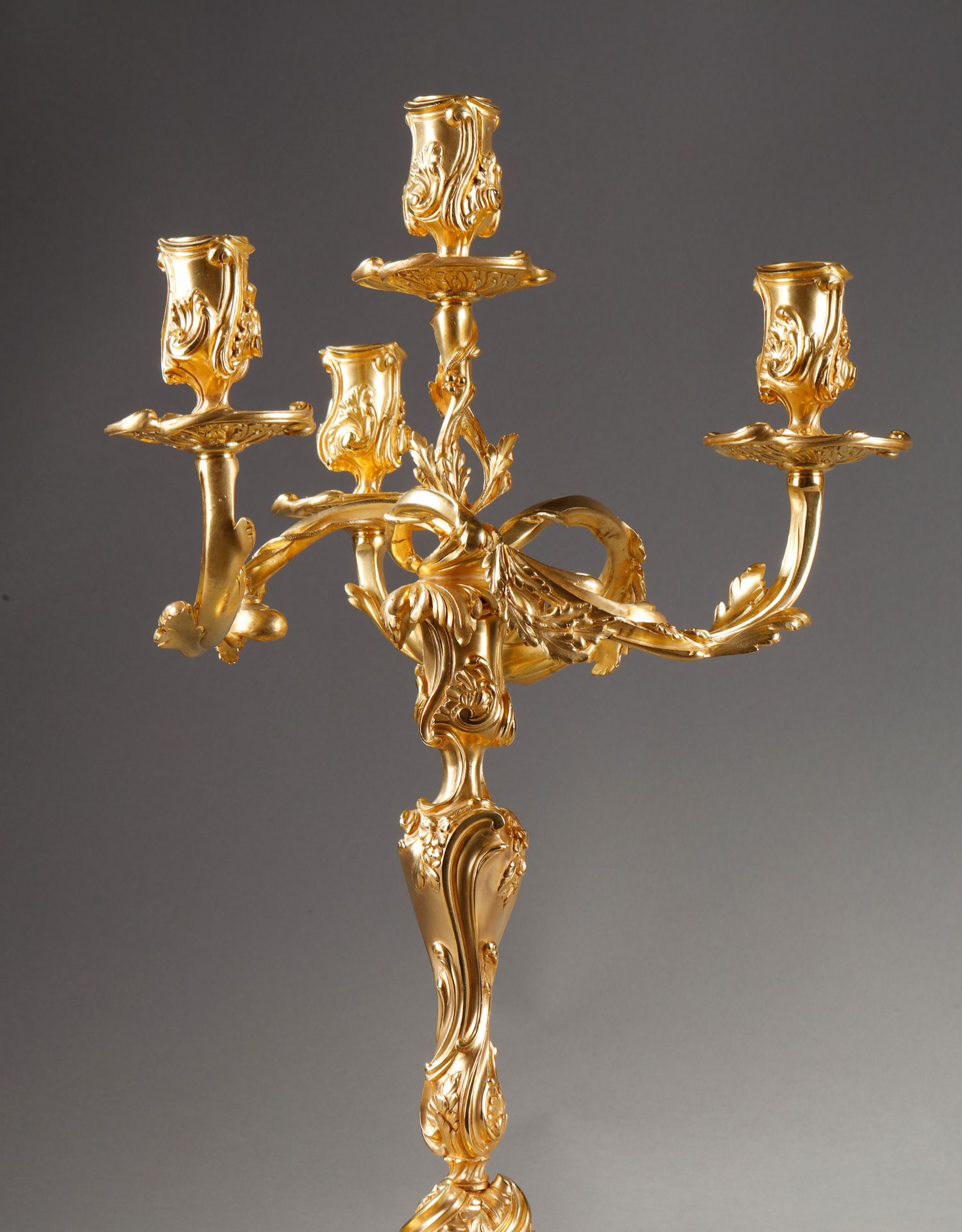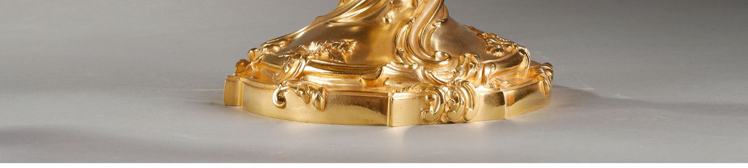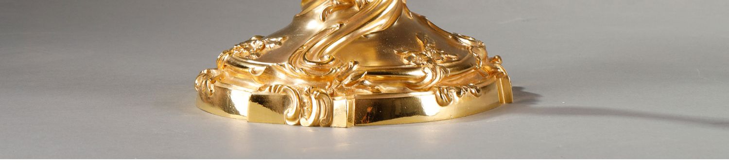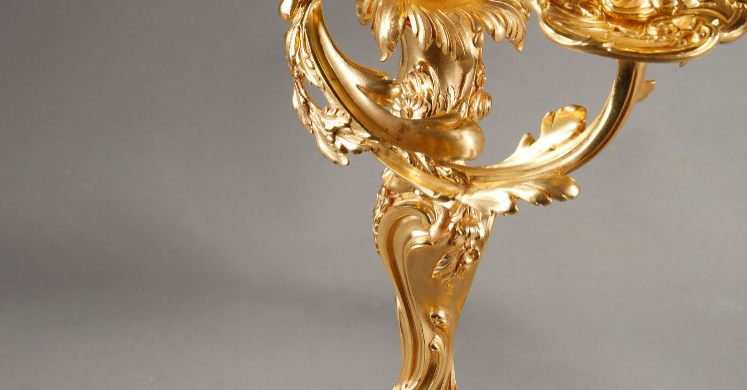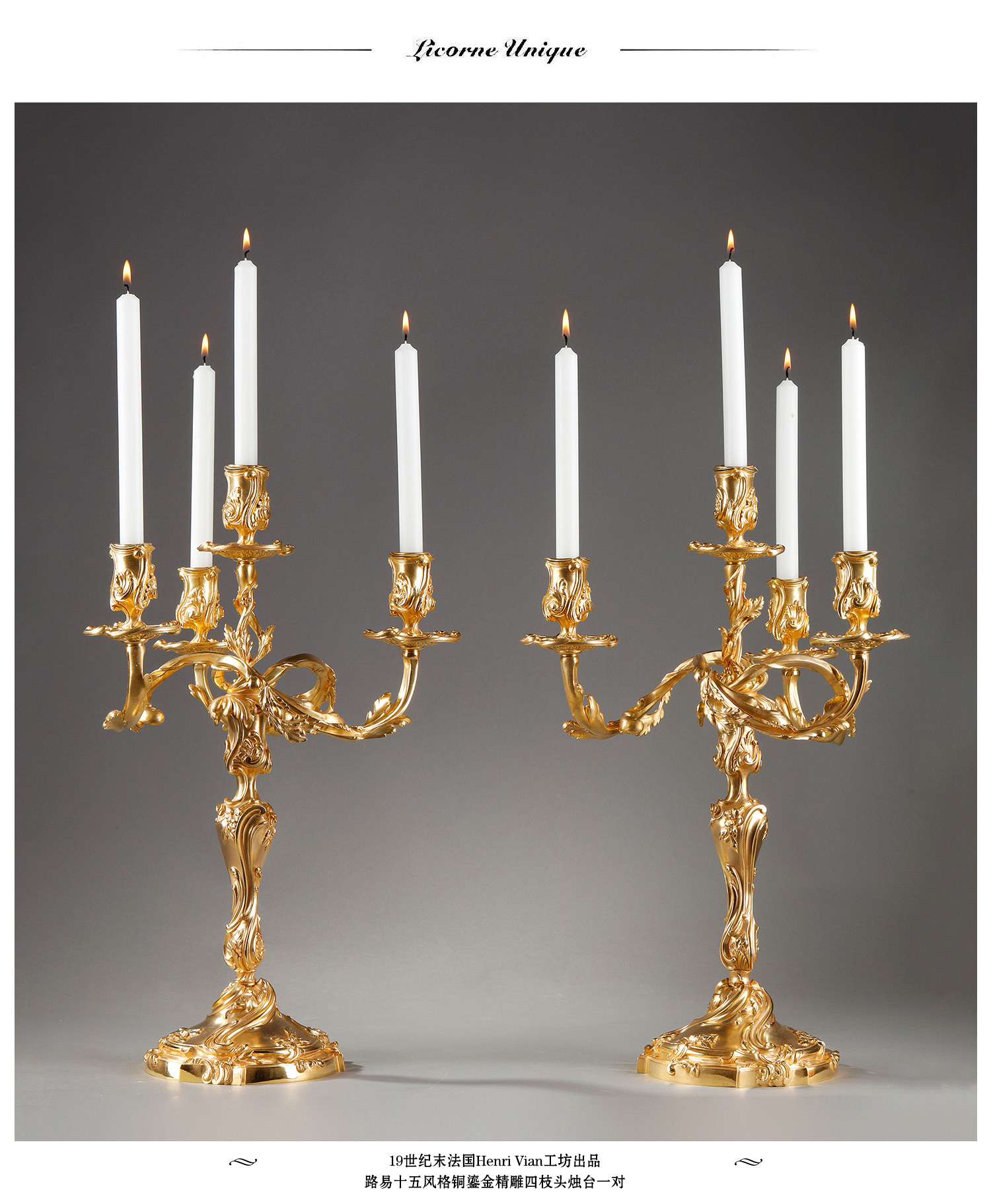 独角鹿西洋古董Henri Vian工坊路易十五风铜鎏金四枝头烛台一对