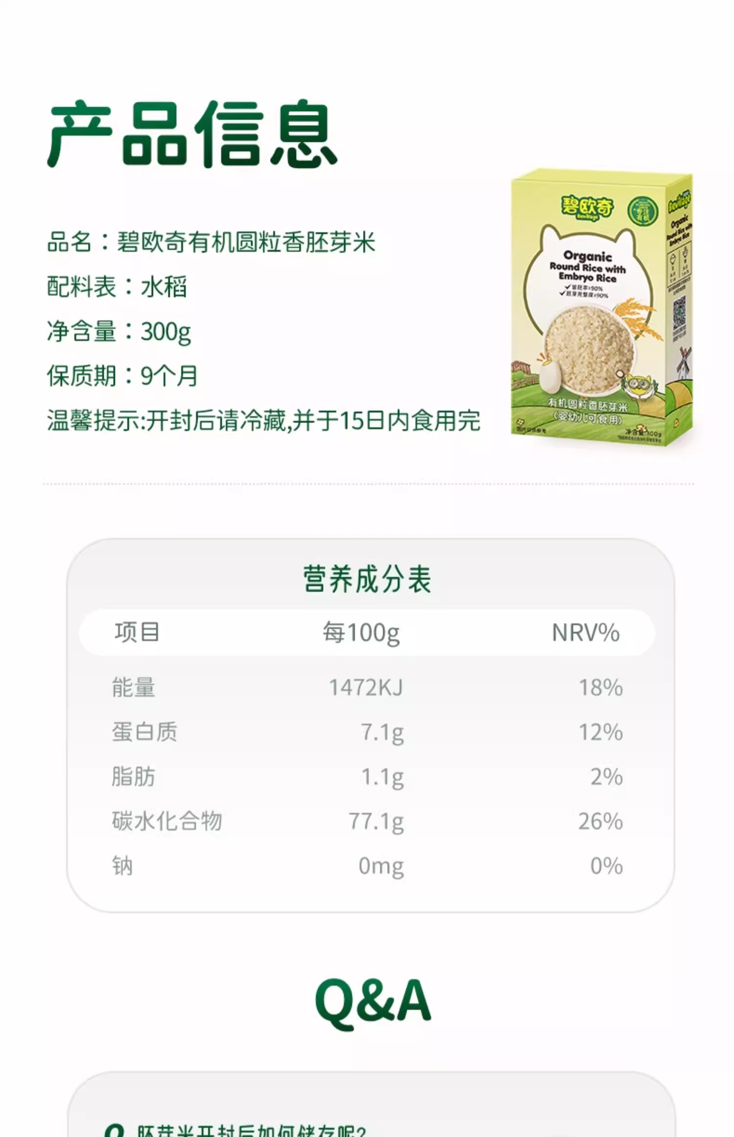 碧欧齐有机圆粒香胚芽米300g