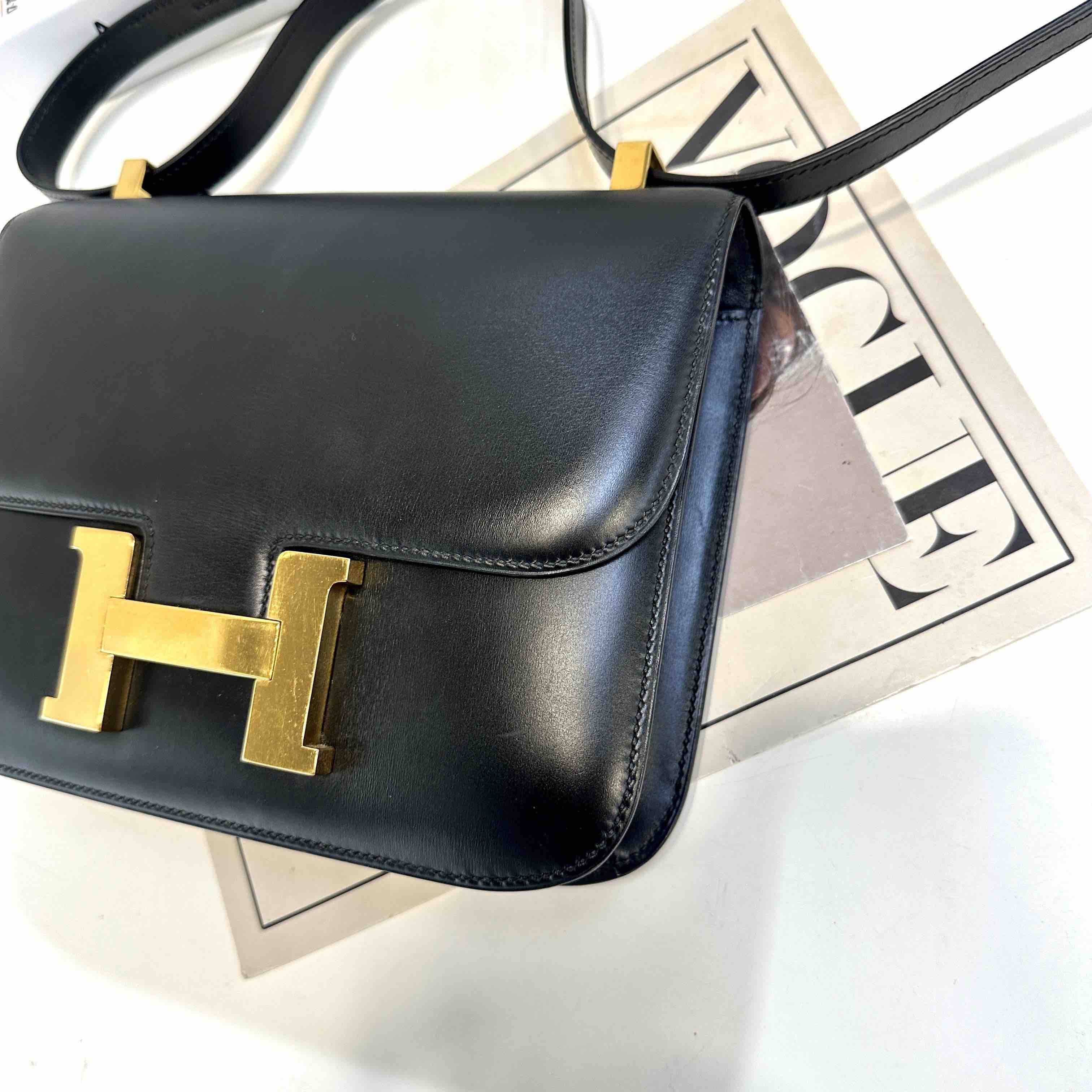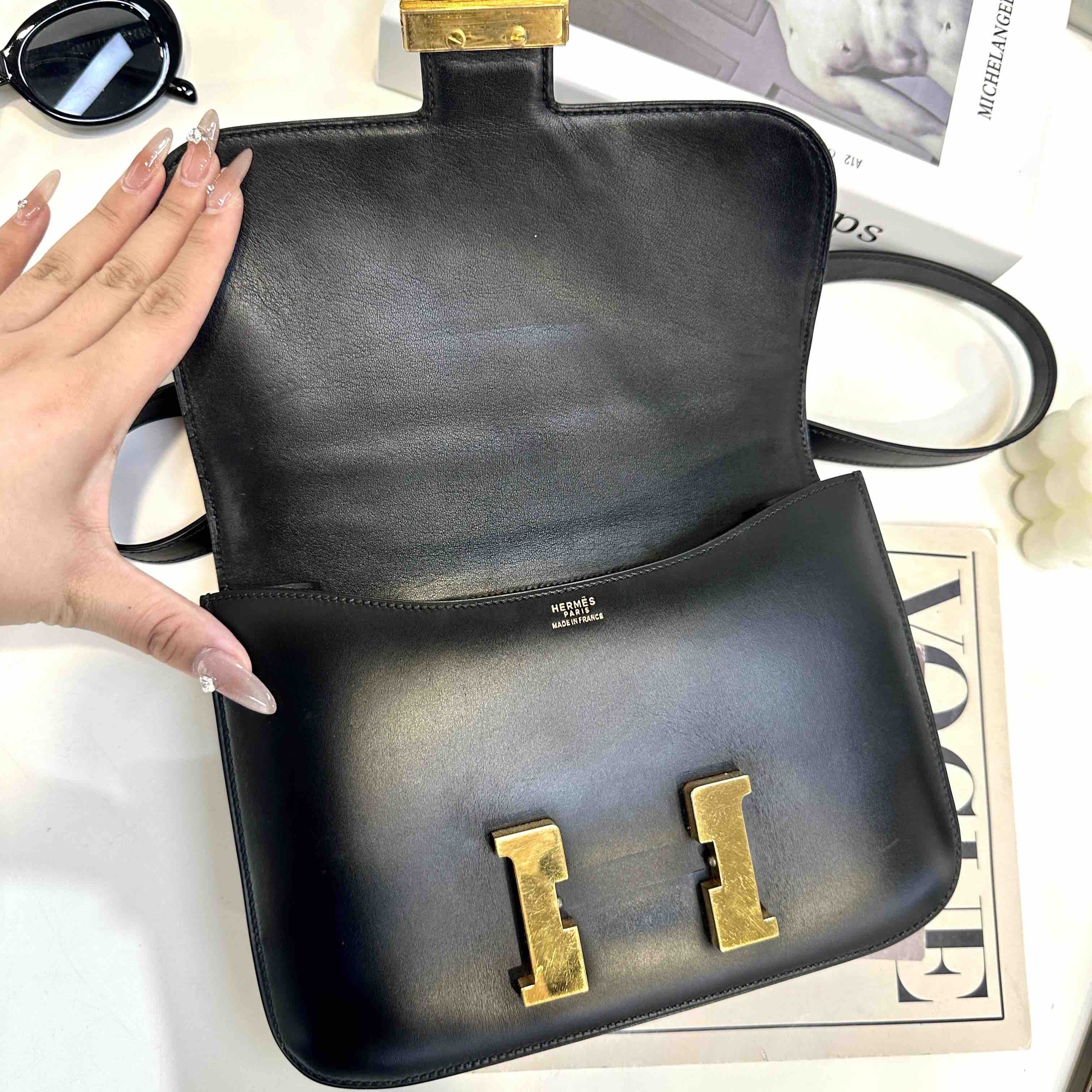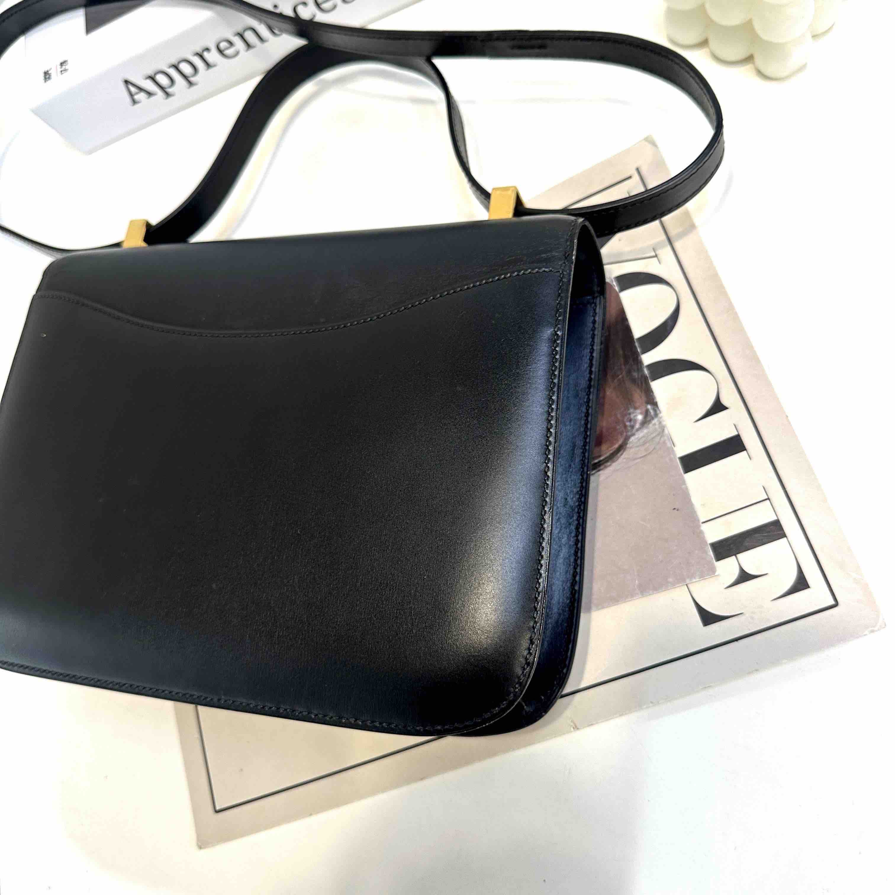 【商品详情】正品二手 爱马仕 中古 康康24 黑金 box牛皮 翻盖包🎭95新 24×19 圆圈J刻 配件:肩带。肩带后换,五金与内翻盖正常使用痕迹 包身轻微使用痕迹 内里干净