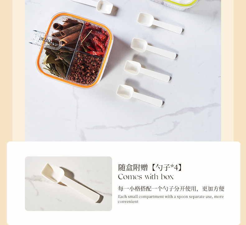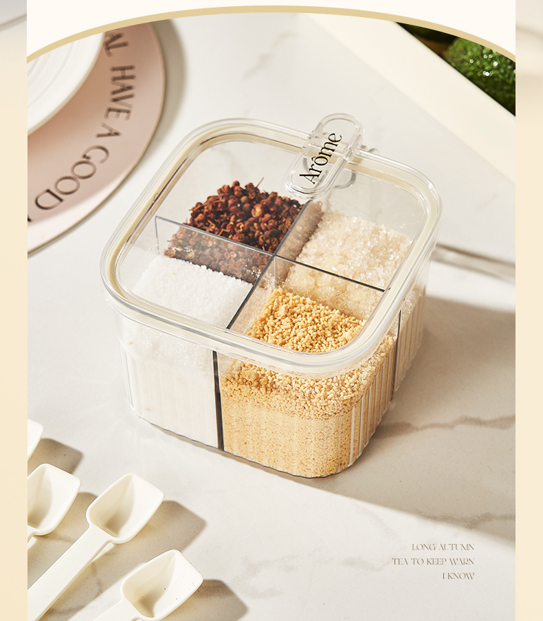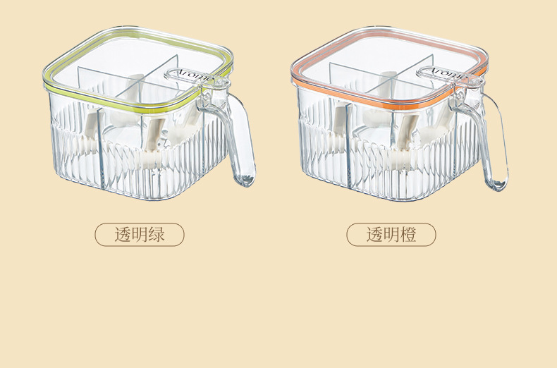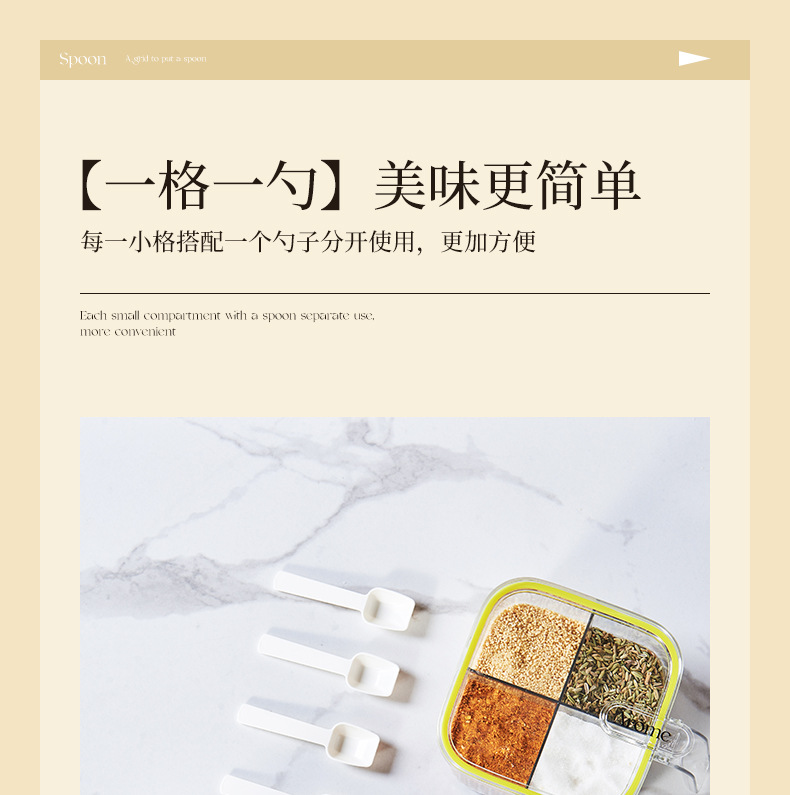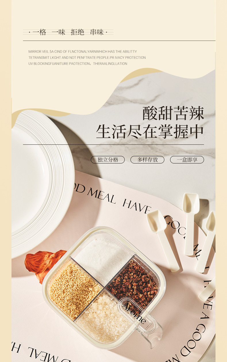 「三款配色!颜值派」厨房按压式调味盒 密封防潮带勺子放盐味精佐料调料盒四分格调料罐厨房用品