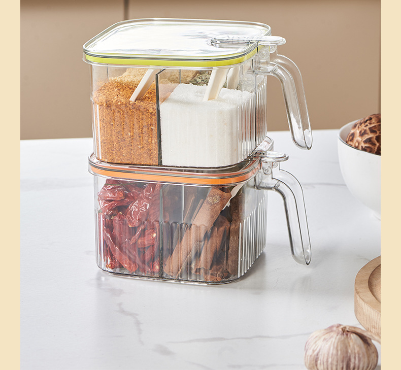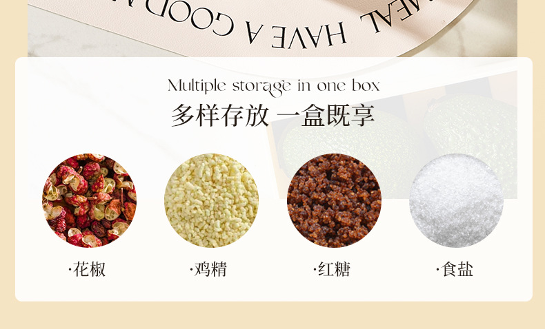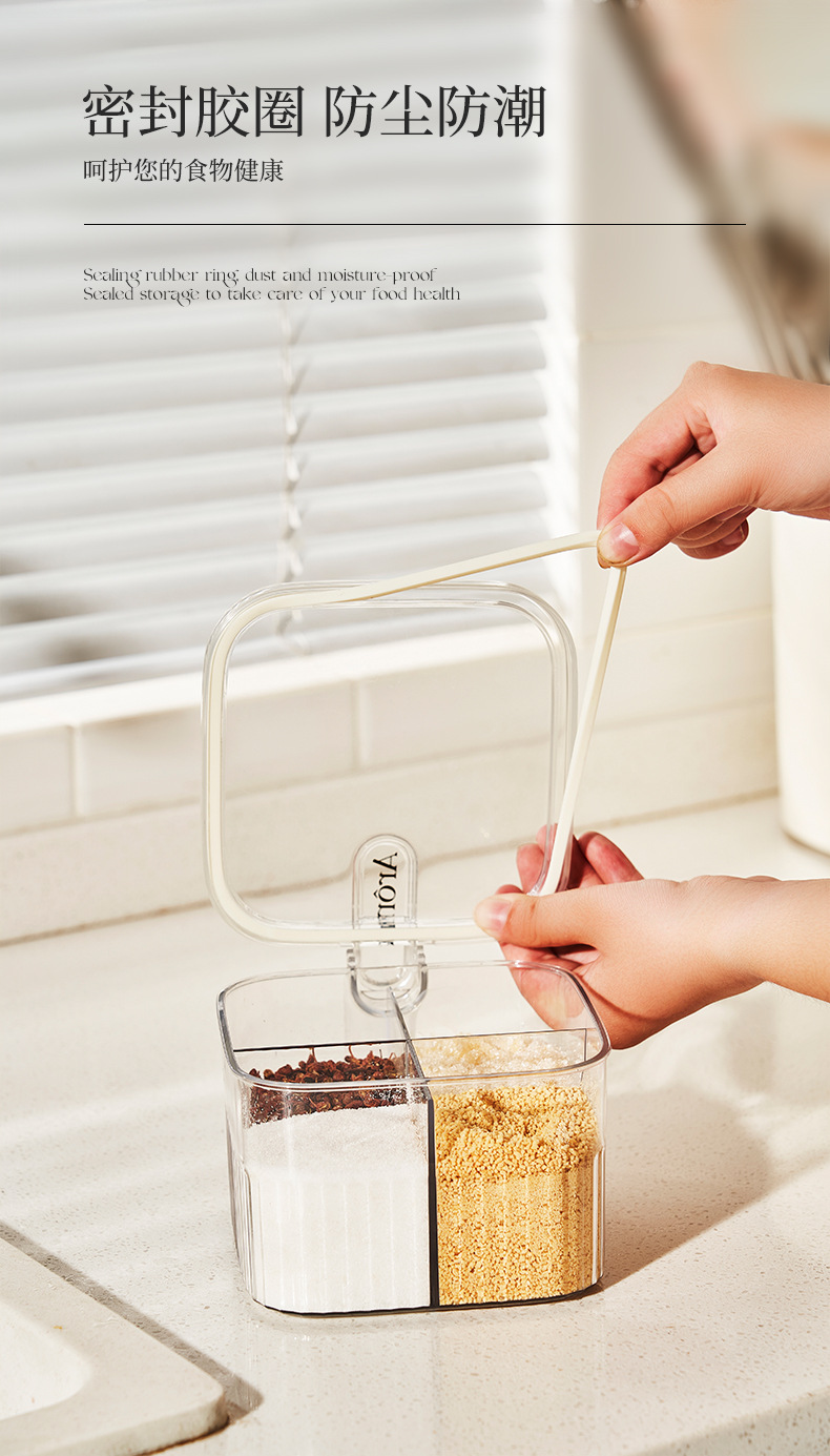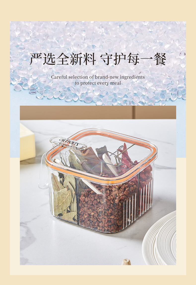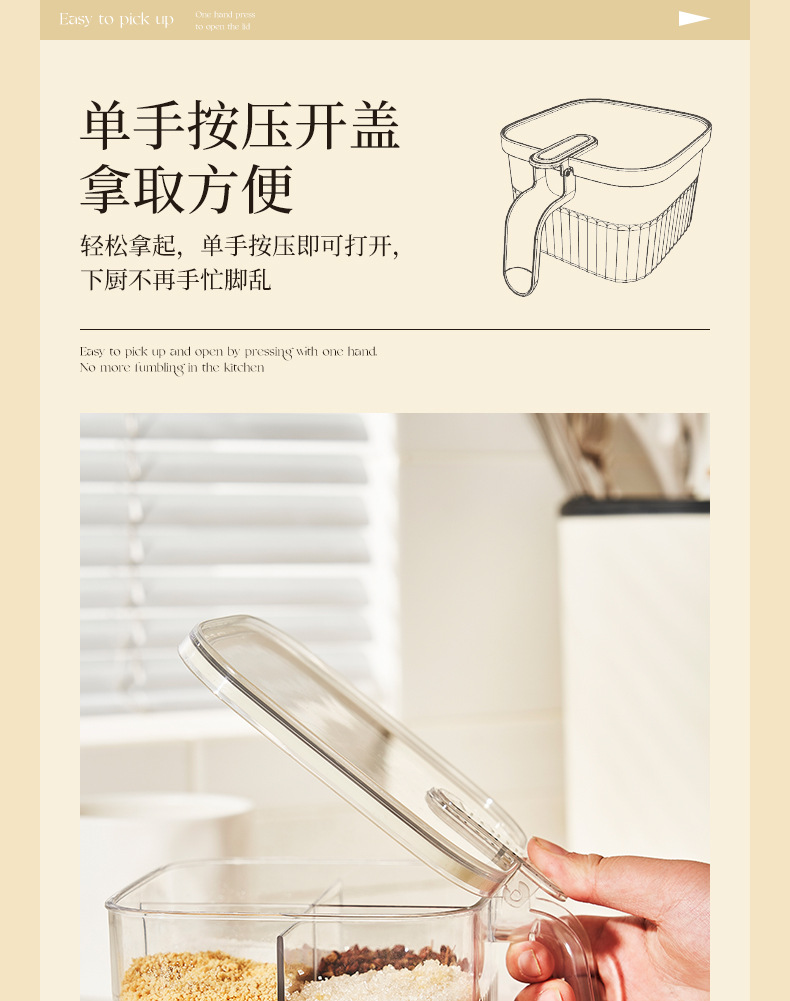 「三款配色!颜值派」厨房按压式调味盒 密封防潮带勺子放盐味精佐料调料盒四分格调料罐厨房用品