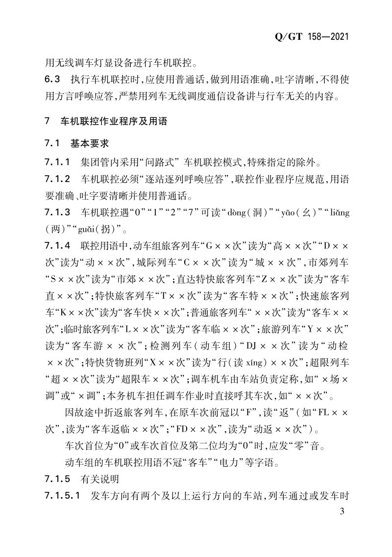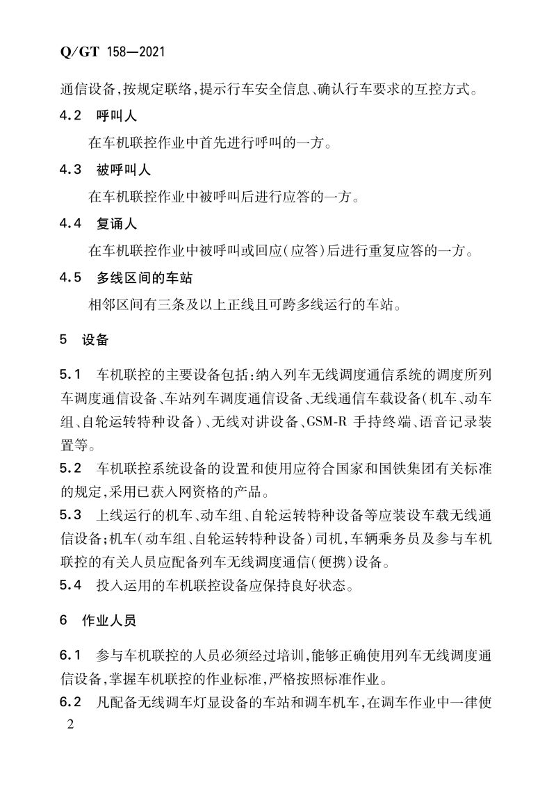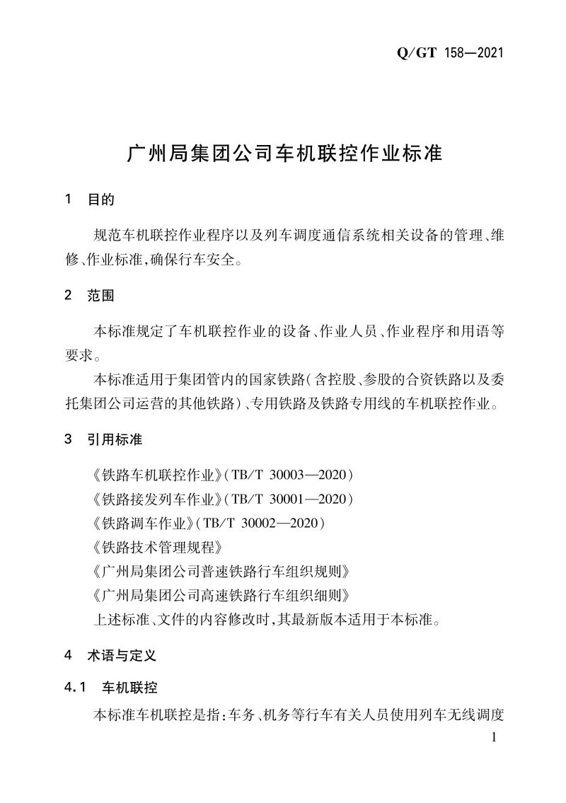 本标准适用于集团管内的国家铁路(含控股、参股的合资铁路以及委托集团公司运营的其它铁路)、专用铁路及铁路专用线的车机联控作业。本标准的车机联控是指车务、机务等行车有关人员使用列车无线调度通信设备,按规定联络,提示行车安全信息、确认行车要求的互控方式,用以规范车机联控作业程序以及列车调度通信系统相关设备的管理、维修、作业标准,确保行车安全。