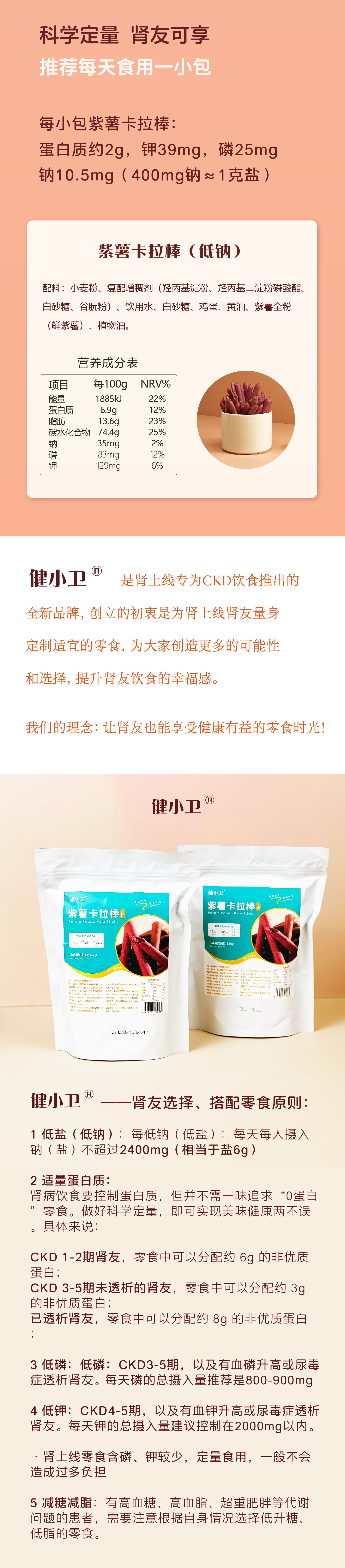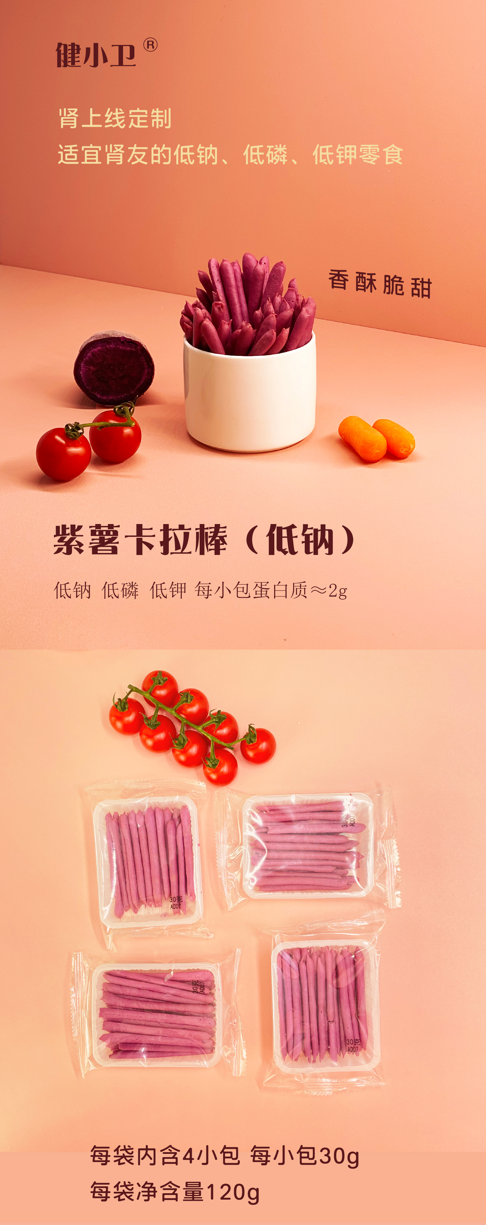 【健康低蛋白零食】健小卫 紫薯卡拉棒低钠、低磷、低钾 健康零食越吃越香 少甜少添加 120g/袋(30g×4)