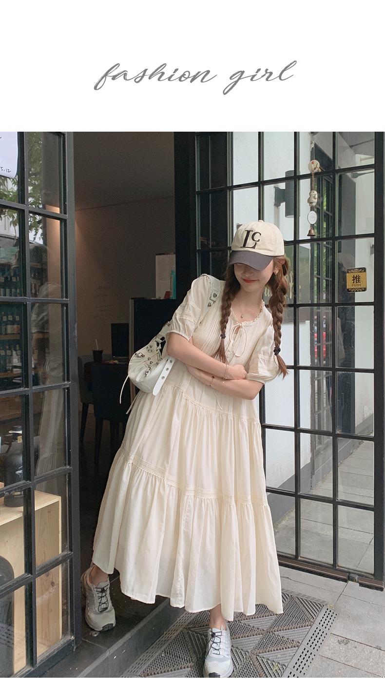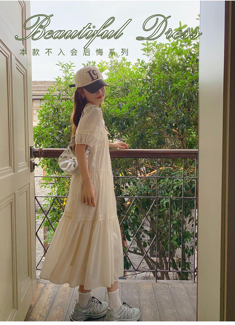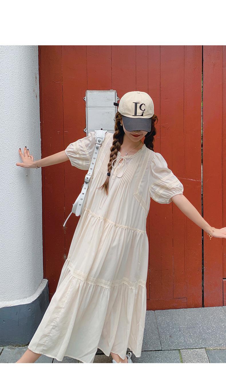 实拍花边小圆领蝴蝶结系带温柔风减龄氛围感杏色拼接大裙摆连衣裙