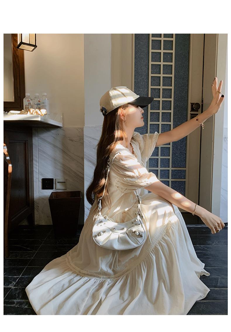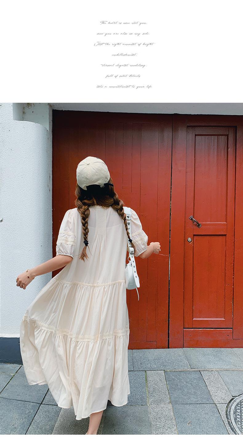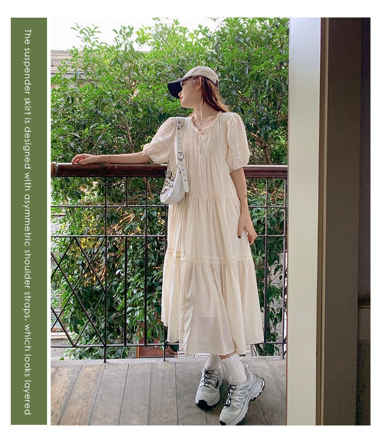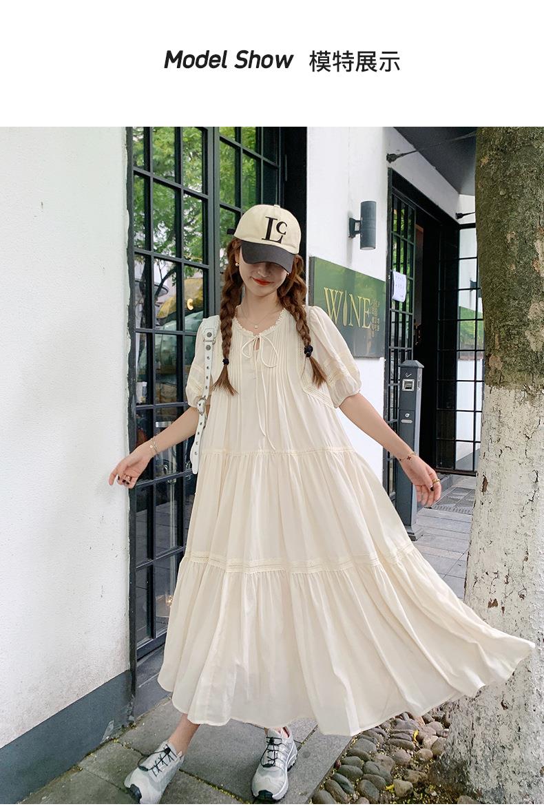 实拍花边小圆领蝴蝶结系带温柔风减龄氛围感杏色拼接大裙摆连衣裙