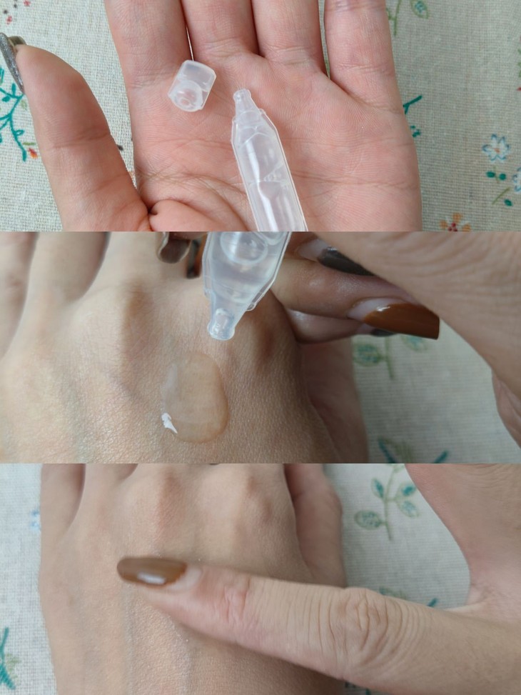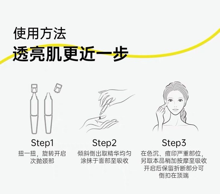 ✅精华液使用步骤 详细使用步骤,透亮肌更近一步👇 ✔️开启精华:轻轻旋转次抛颈部,打开精华液。开启后保留折断部分,可倒扣在顶端,方便下次使用 ✔️均匀涂抹:将精华液倾斜倒出,取适量均匀涂抹于面部,轻柔按摩至完全吸收 ✔️重点护理:对于色沉、痘印等需要特别护理的部位,取适量精华液稍加按摩,促进吸收 ✔️湿敷淡斑:在斑点、色沉处厚涂精华液,搭配湿敷棉贴敷8-10分钟,增强美白效果