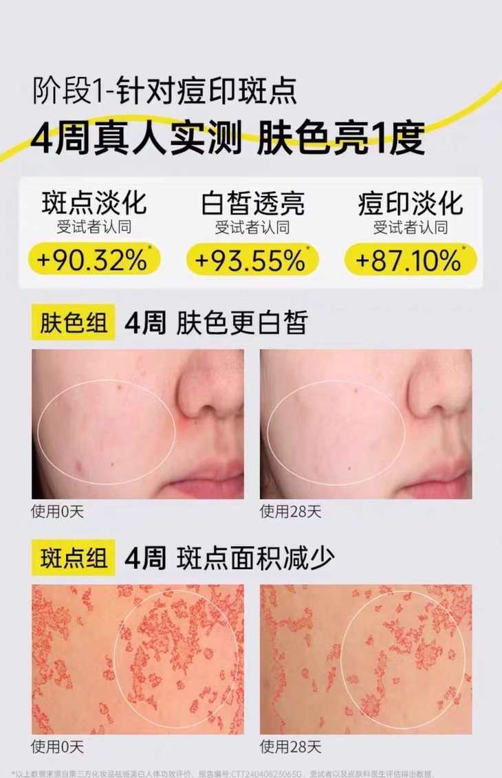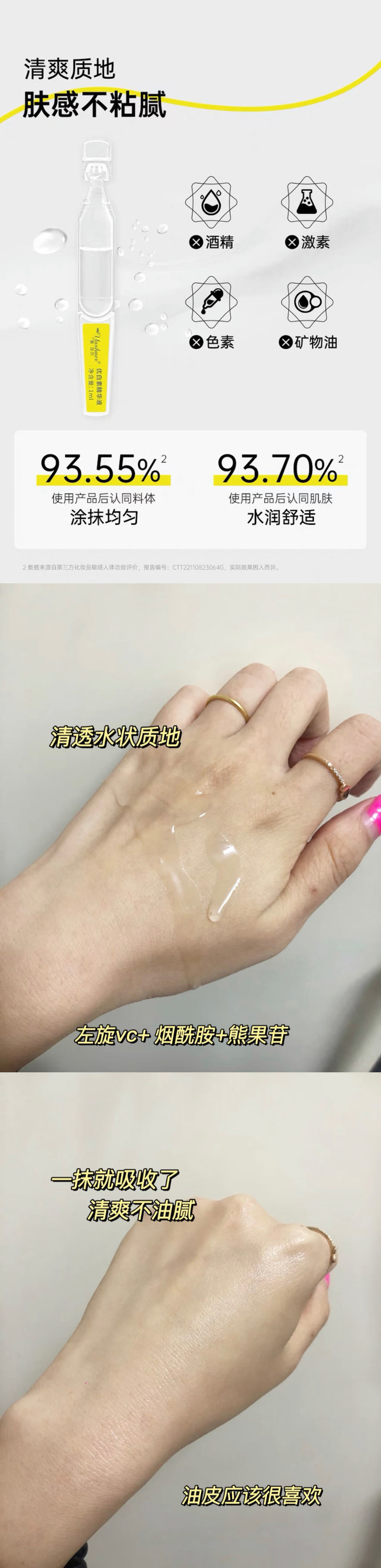 质地也是很轻盈很好吸收的,肤感很清爽一点不粘腻 大油皮使用也不会有闷肤感🍃 油敏肌看到直呼不要太友好!! 姐妹们长期坚持使用, 痘印,晒斑还是暗沉看起来都在变淡~ 皮肤的通透焕亮感真的给到惊喜🎉
