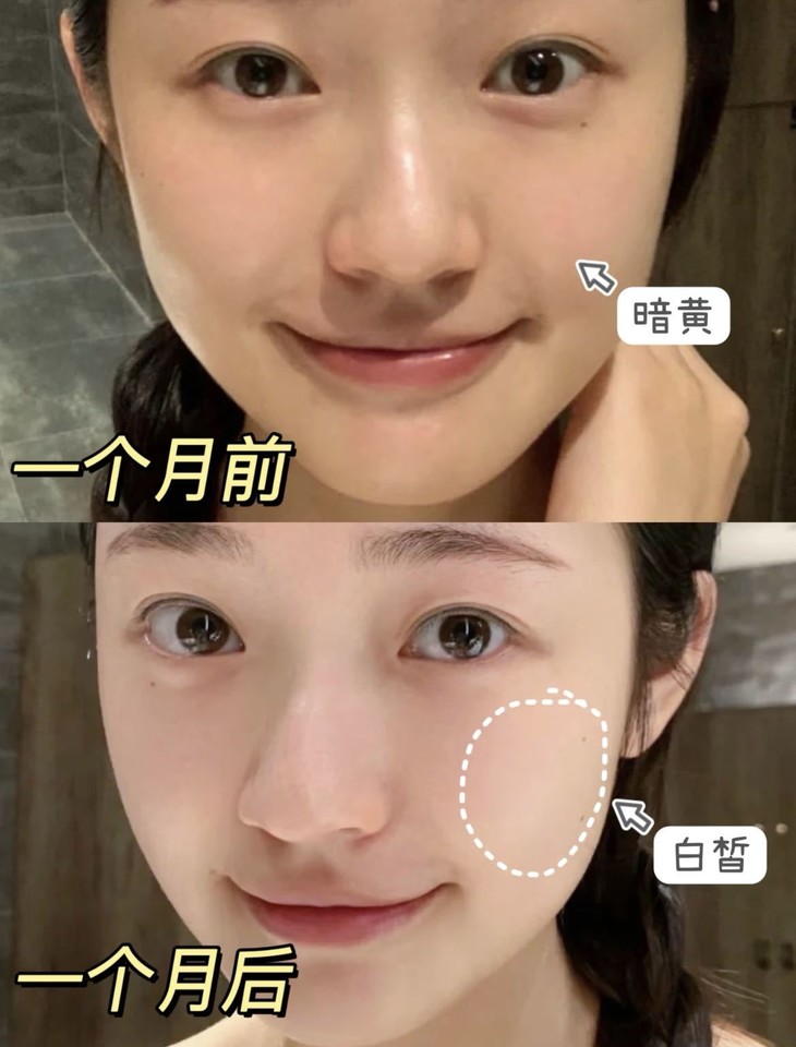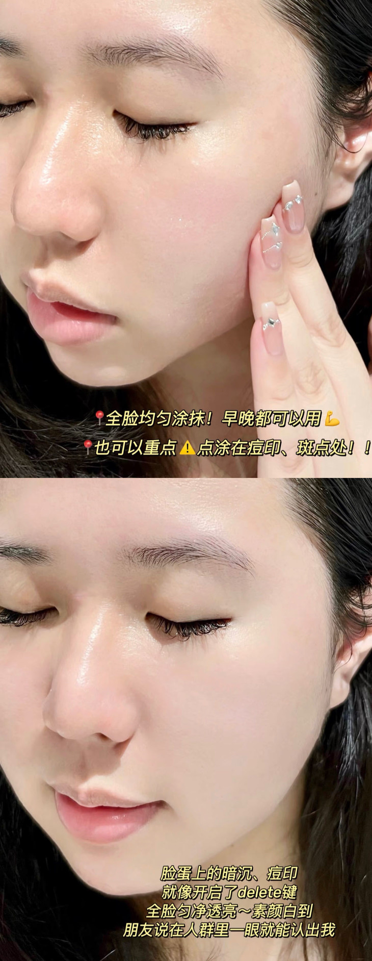 ✅祛黄、淡化痘印 几乎适合所有人的美白成分,很受一线品牌的青睐和SK-II主打的成分一样! 很多人皮肤暗黄原因就是因为黑色素在脸上积累,且没有及时排出去! 烟酰胺可以毫无保留的渗透到肌肤深层,直接作用到已有的痘印、暗沉,还可以达到提亮肤色的整体效果! 淡斑、美白、提亮,一次搞定✔️ 省钱又省事👏👏 学生党、熬夜党、上班族一定要试试!!! 妥妥的性价比之王! 看图就可以知道,那种“通透、由内往外透着光亮”是啥感觉了