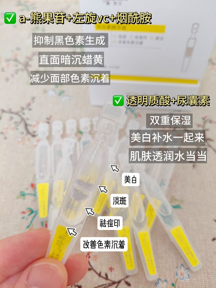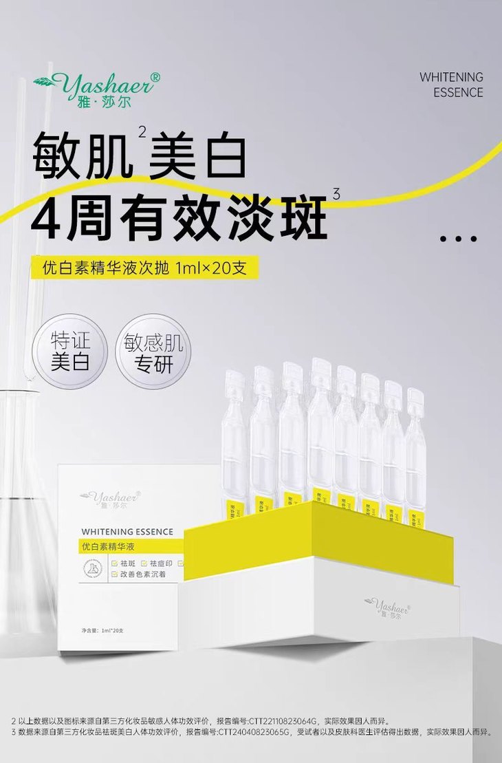 ✅科学配比,多链路淡斑焕白 作为资深护肤爱好者都知道,想要改善什么,就要针对不同肤质 选择专用成分,效果才能得到最大的反馈! 雅莎尔聚焦淡斑美白赛道,以新成分、新机制 采用含有熊果苷和烟酰胺这两种美白界公认的美白成分✔️ 👉3%熊果苷+3%烟酰胺强强联手~ 并添加了维C衍生物👏 想要美白、提亮肤色、淡斑、淡化痘印的朋友,都可以试试哦~