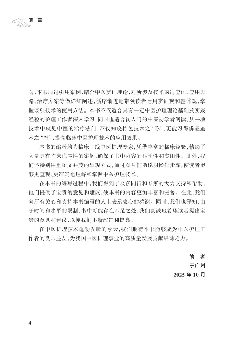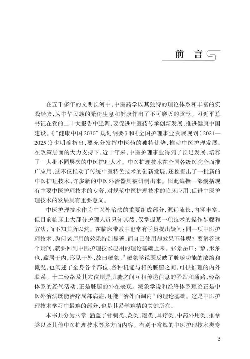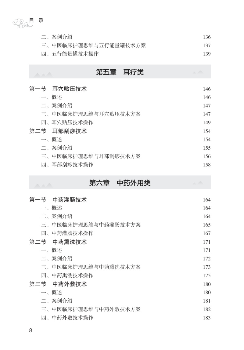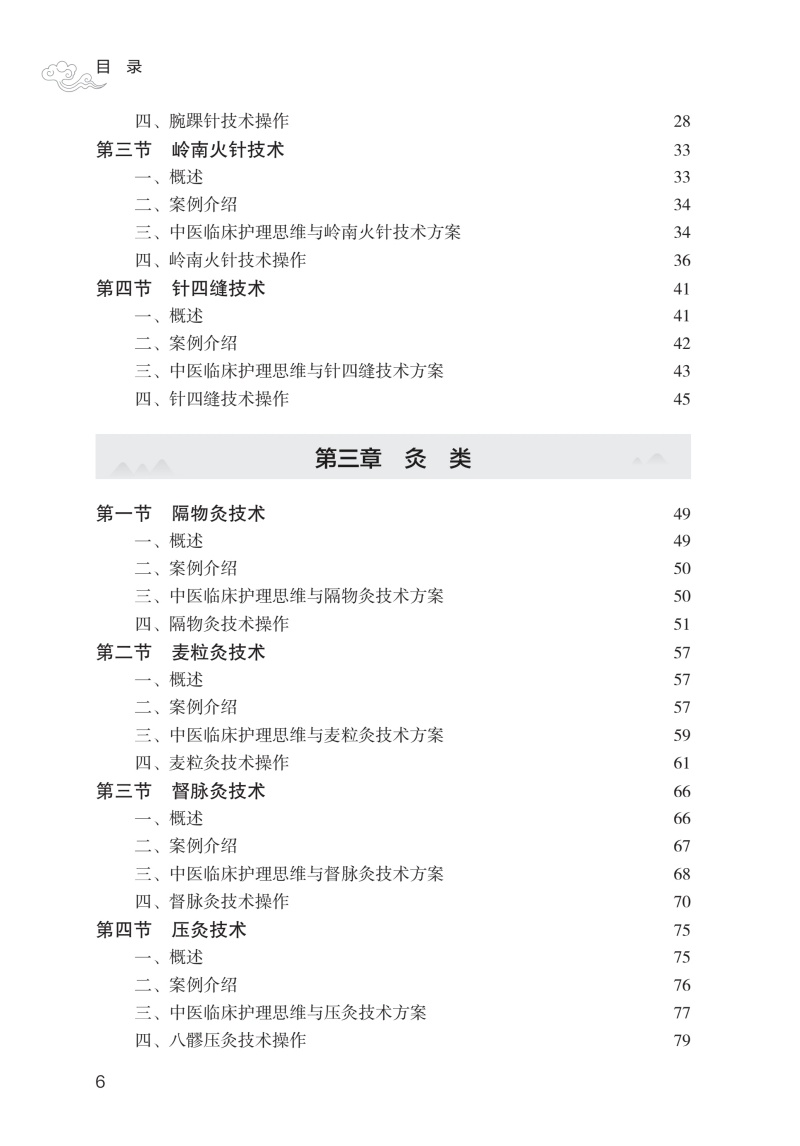 本书涉及操作项目包括刮痧、拔罐、放血疗法、雷火灸、捏脊、针四缝、督灸、平衡火罐、火龙罐、虎符铜砭刮痧、耳部刮痧、全息刮痧、棍针、八髎压灸等34项技术。每项技术开篇均由一个精心编写的临床应用案例引入,案例中包括施技方案如技术项目种类、治疗的部位或穴位、手法、治疗思路等;技术内容包括概述、适用范围、评估、告知、用物准备、基本操作方法、注意事项、操作流程图及操作评分标准等。涉及的护理技术全面,在编写上重视培养临床护理人员的临床思维。