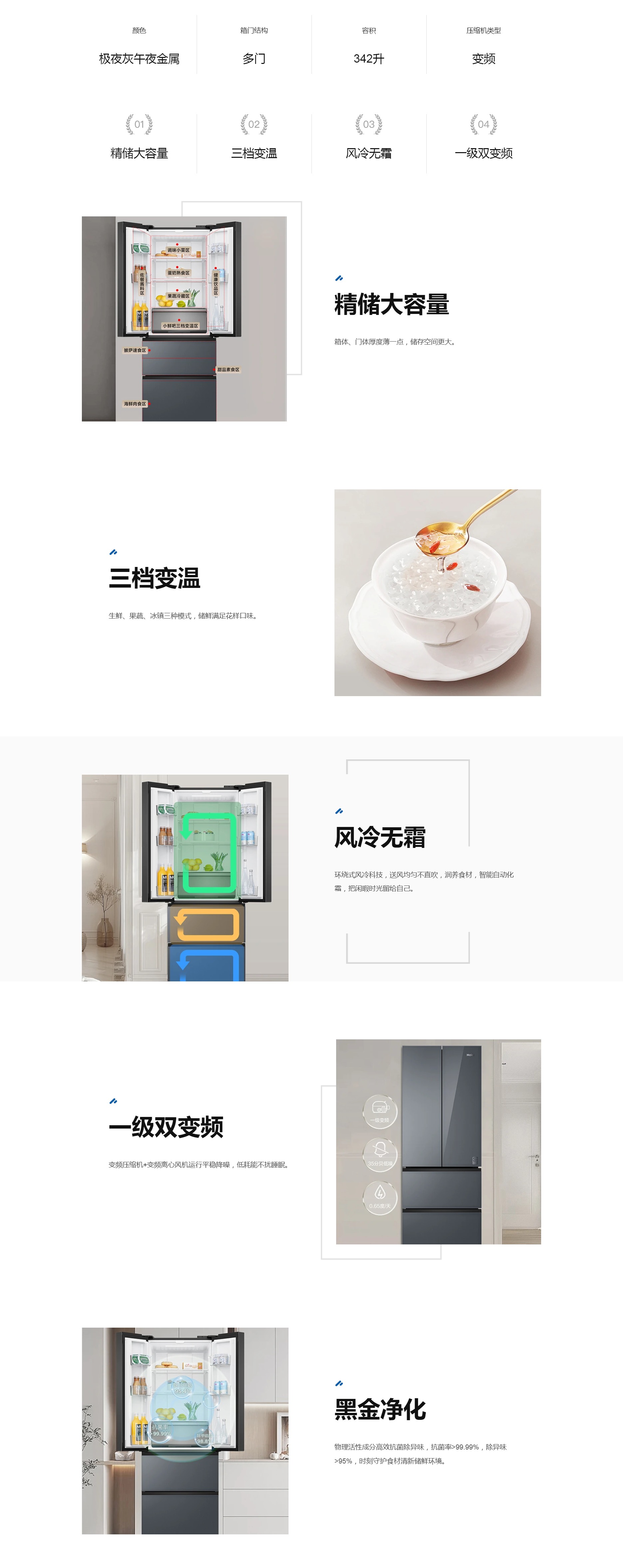 海尔 冰箱 BCD-342WLHFD9DGMU1 342升 法式多门 风冷 变频 一级能效 超薄机身 彩晶面板 电脑控温 极夜灰午夜金属颜色