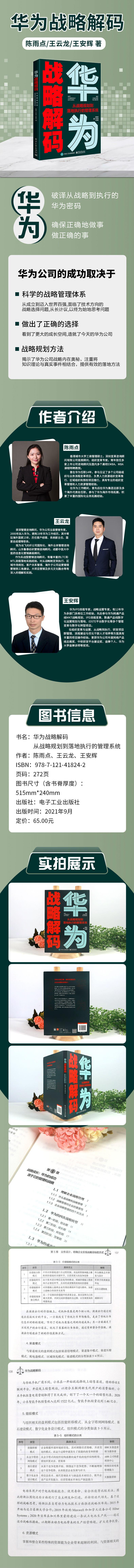 华为的成功首先是战略管理的成功。从成立到迈入世界百强的发展历程中,华为公司在每个重大的历史关口都面临了技术方向的战略选择问题,在这样的时刻,华为公司都是从长计议,以终为始地思考问题,从而看到了更大的成长空间,做出了正确的选择,造就了今天的华为公司。完善的战略管理体系不仅让华为在全球商业竞争中脱颖而出,也为国内其他企业提供了良好的学习蓝本。本书从战略成长、行动要求、市场洞察、创新焦点、业务设计、战略解码、组织保障、执行督导八个方面系统阐述了华为战略管理的内在奥秘与方法论,同时结合具体案例与场景,为读者提供了一套从战略规划到战略落地的全流程操作指南。本书可为寻求变革与战略成长的企业家与管理者提供参考指引。