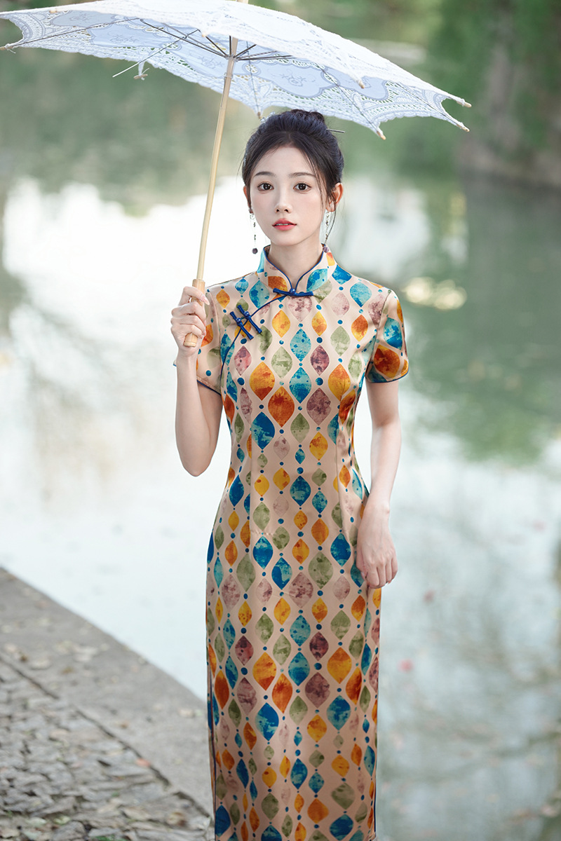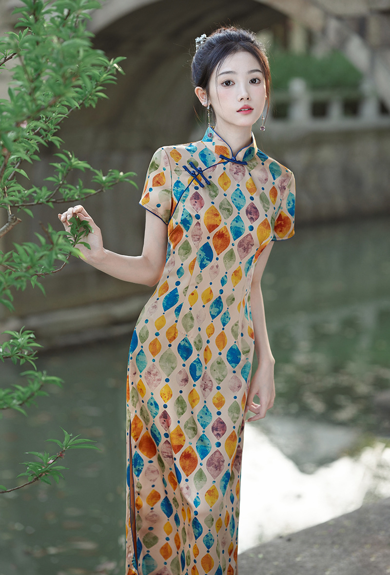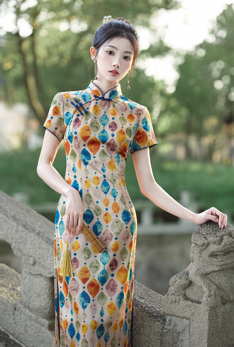 改良日常复古,新中式长款轻薄旗袍XL- 217