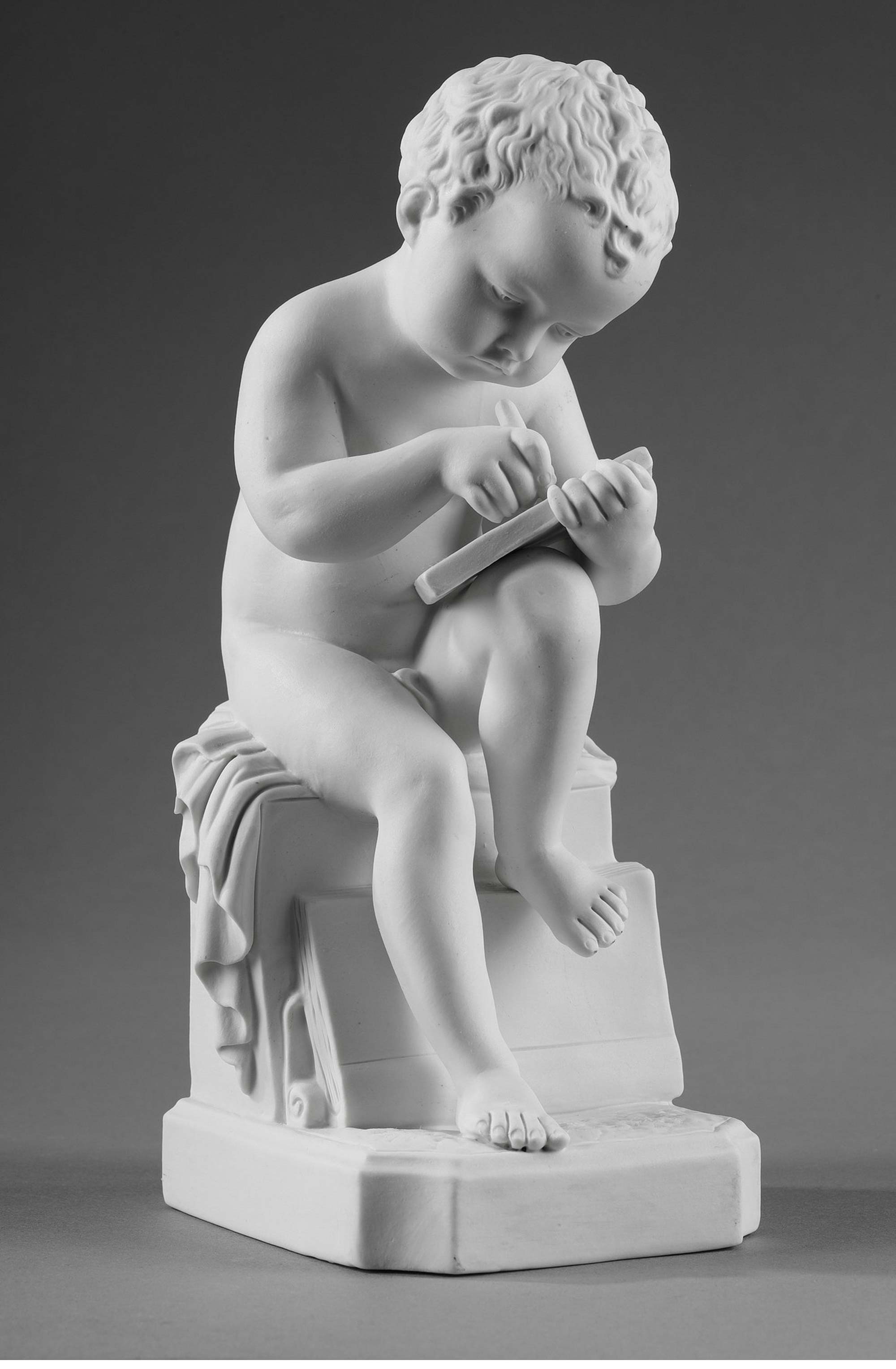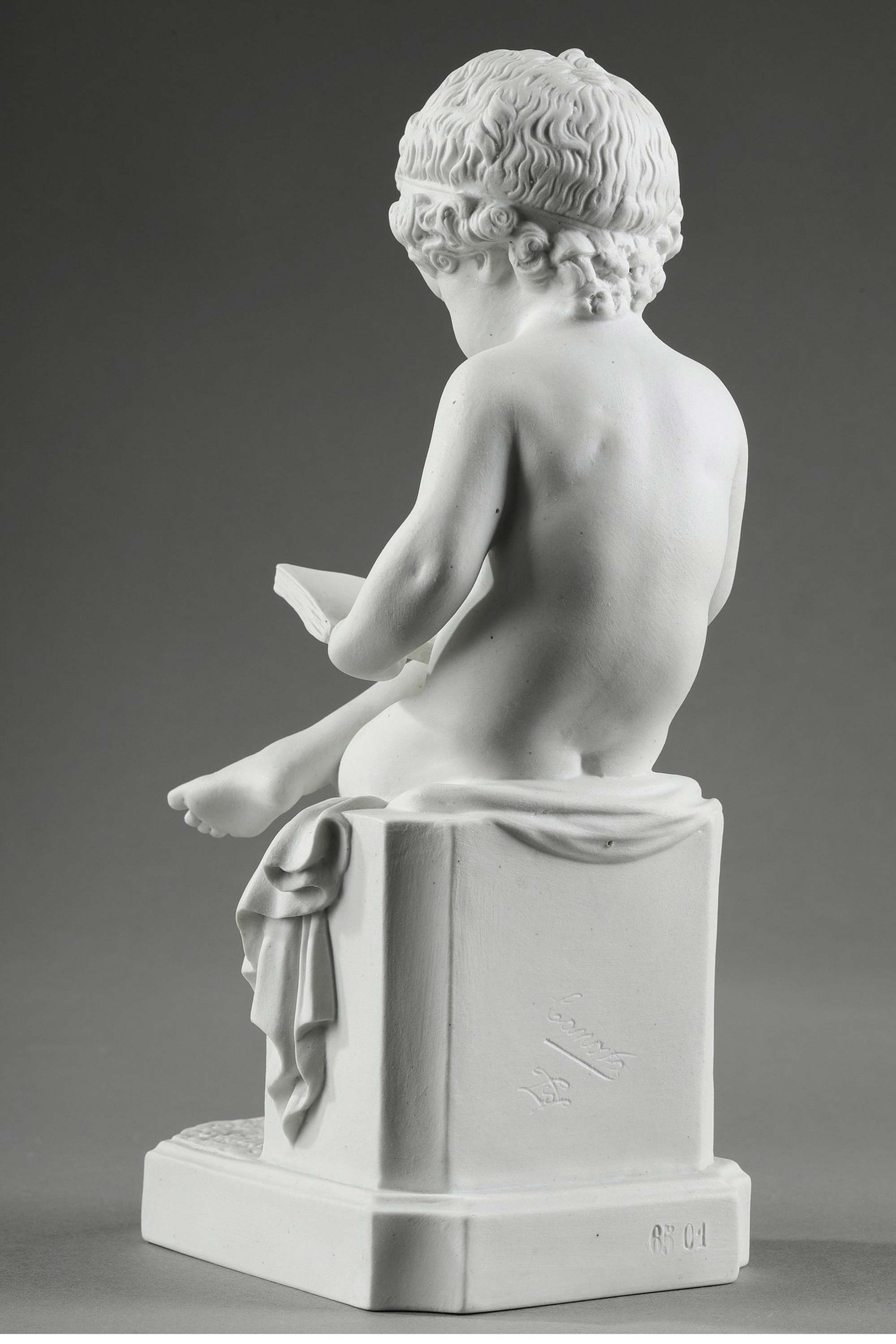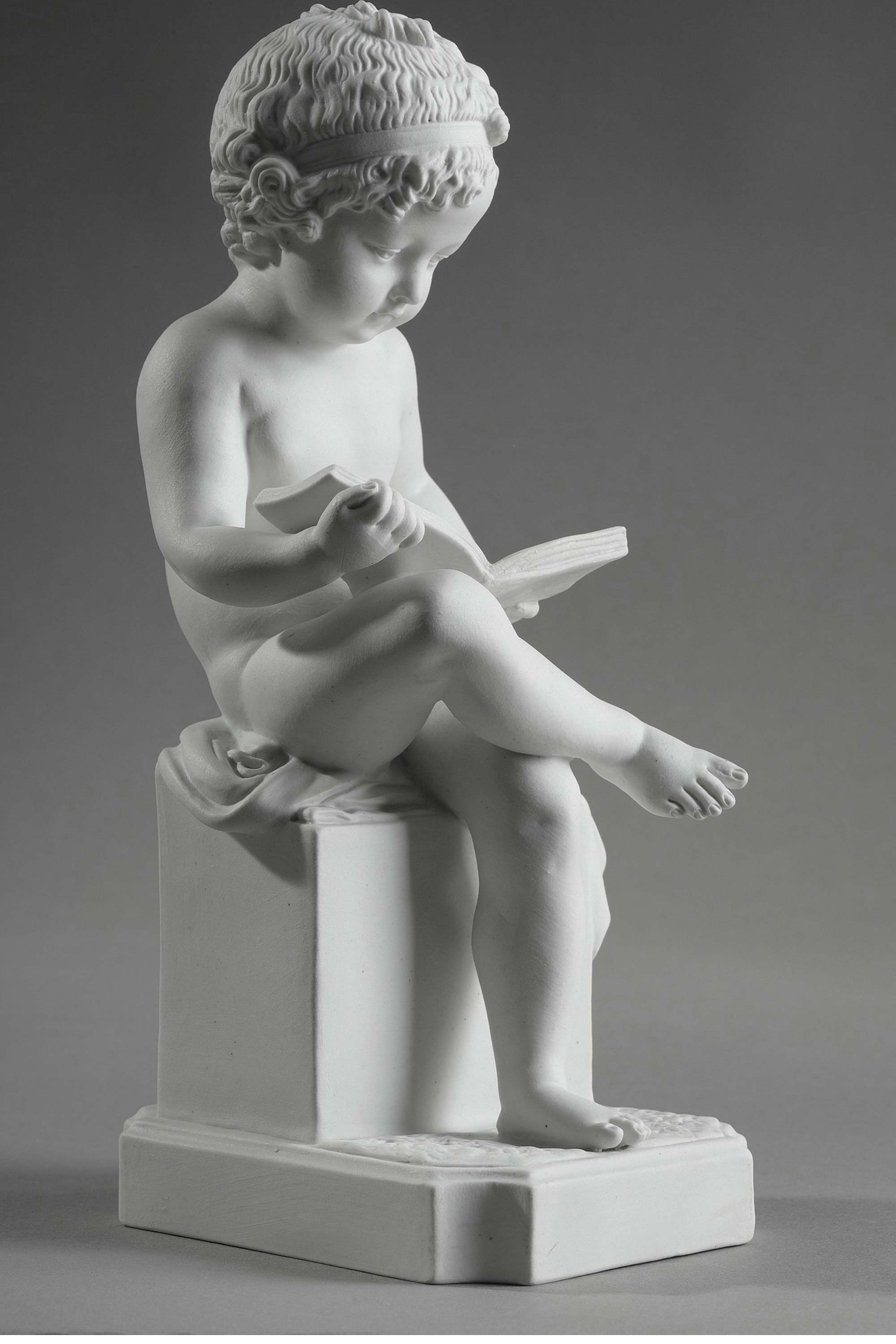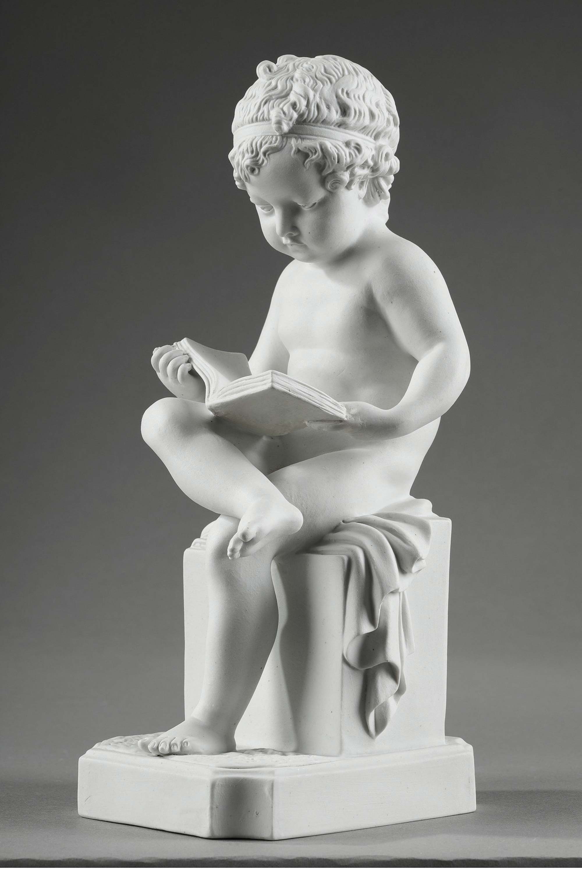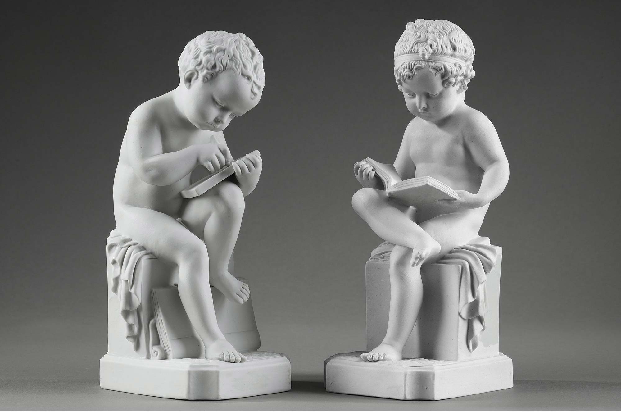 20世纪法国出品阅读的孩童主题素胎瓷人物雕塑一对
