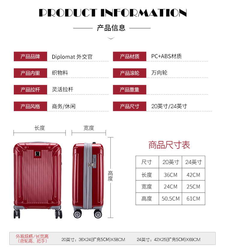 外交官(Diplomat)镜面扩充层箱子登机箱行李箱男女旅行箱万向轮拉杆箱密码箱TC-6012 20英寸 红色