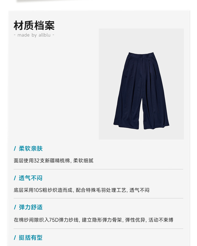 allblu幼岚弹力毛圈阔腿裙裤,春季女士裤子,亲肤透气舒适 商品图3