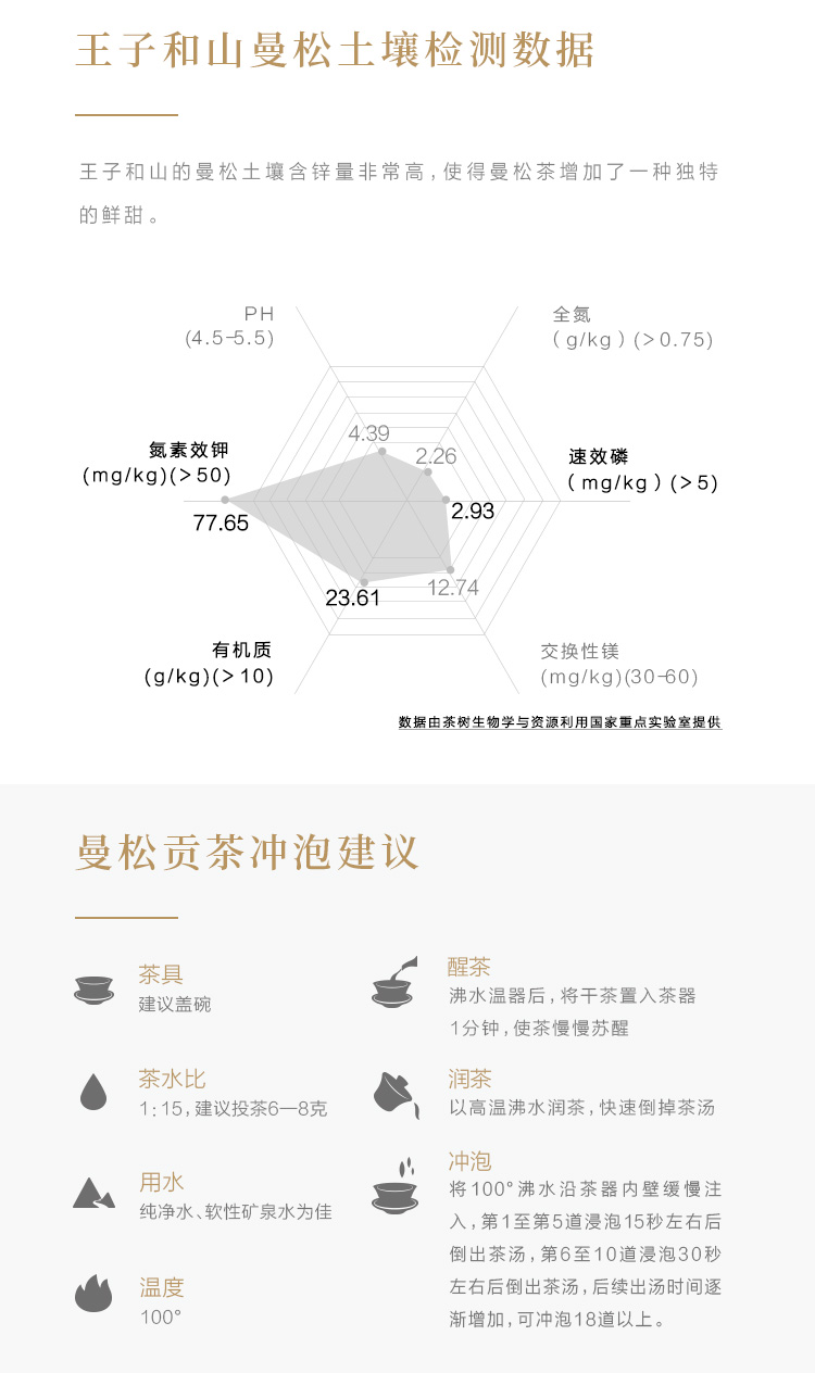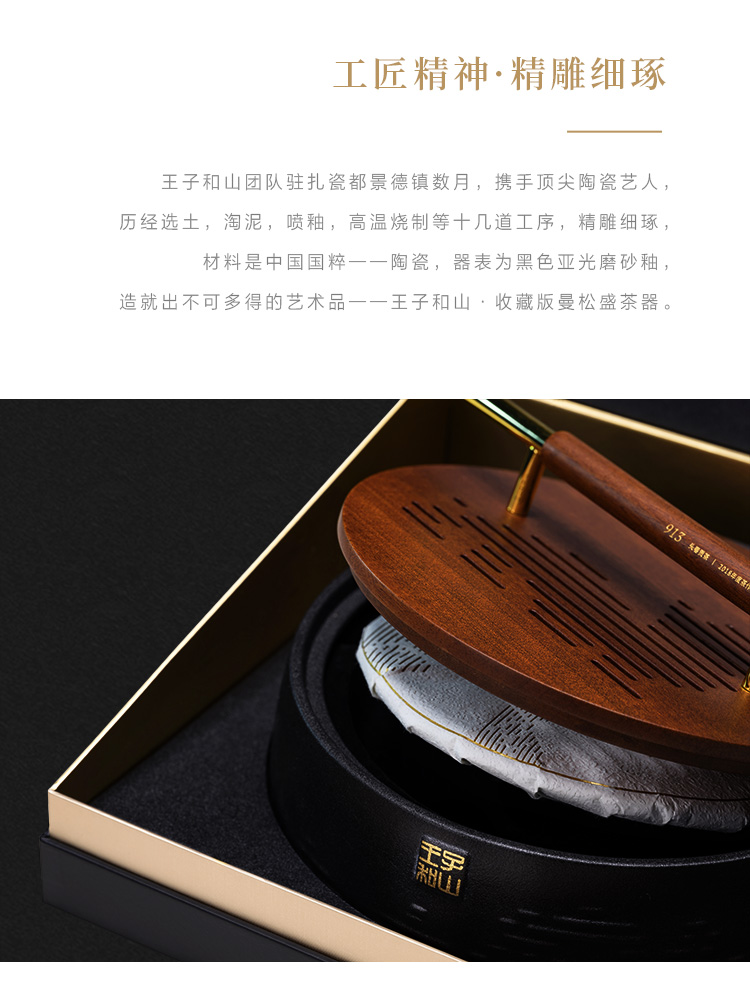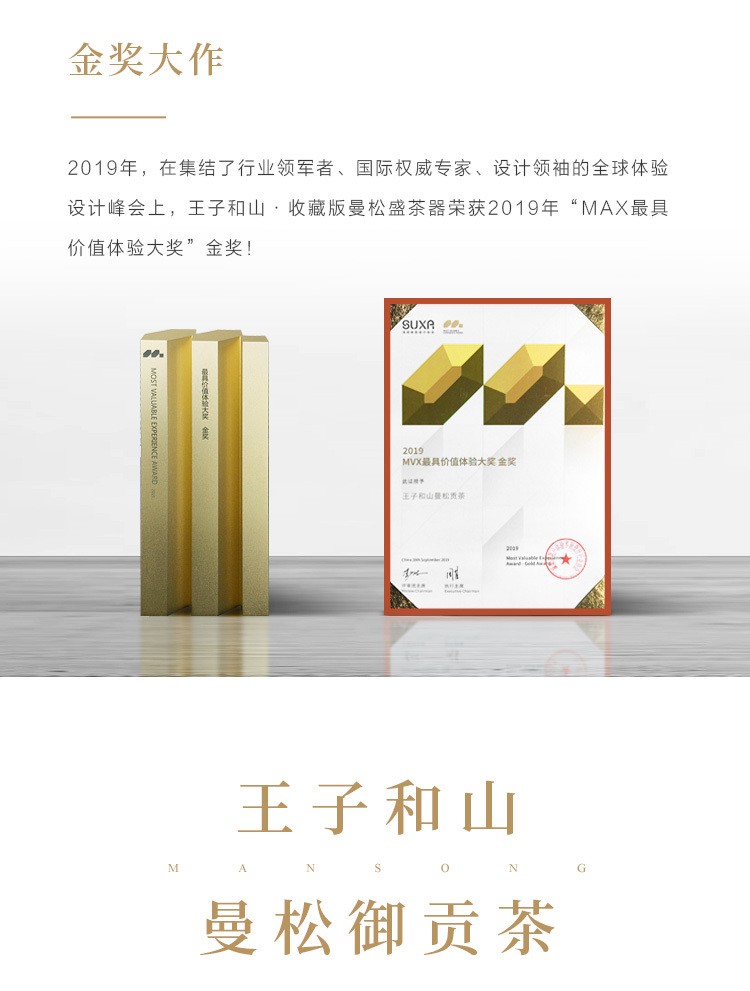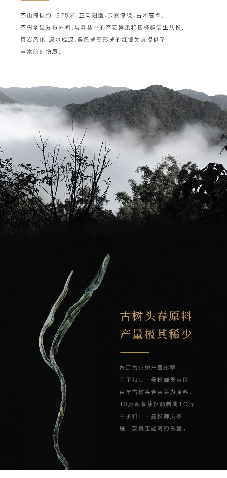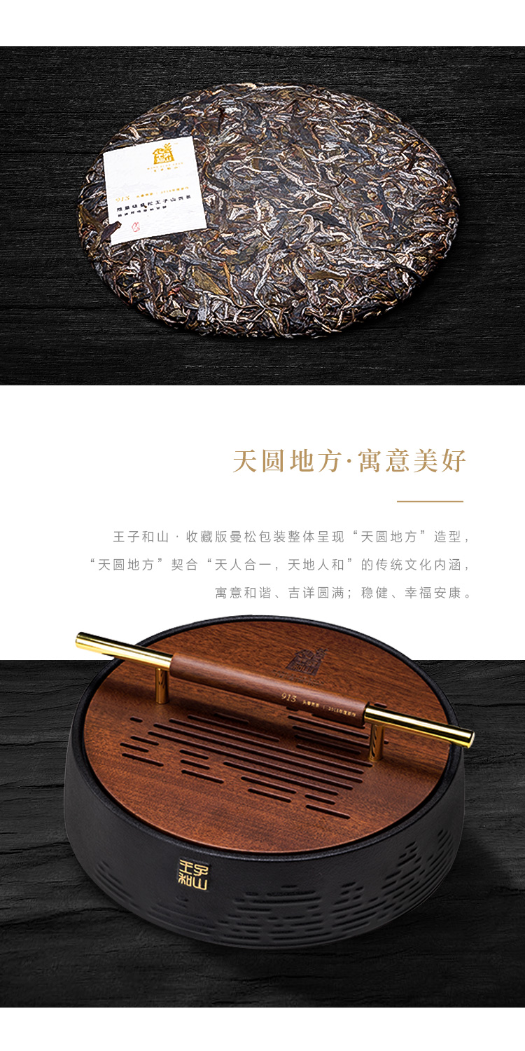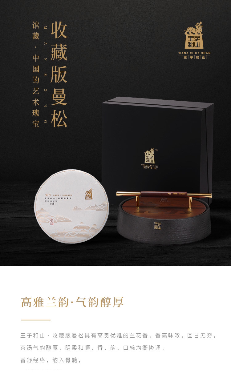 - “王子和山”为春三月企业旗下高端普洱茶品牌, 致力于为爱茶人士提供中国顶级好茶, “收藏级曼松”是其中的翘楚。