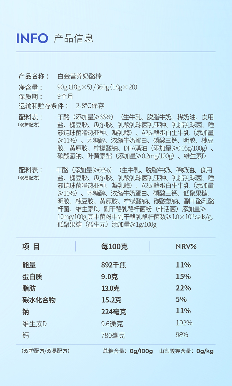 【奶酪博士】≥66%进口干酪白金营养奶酪棒双护/双易配方90g*10袋