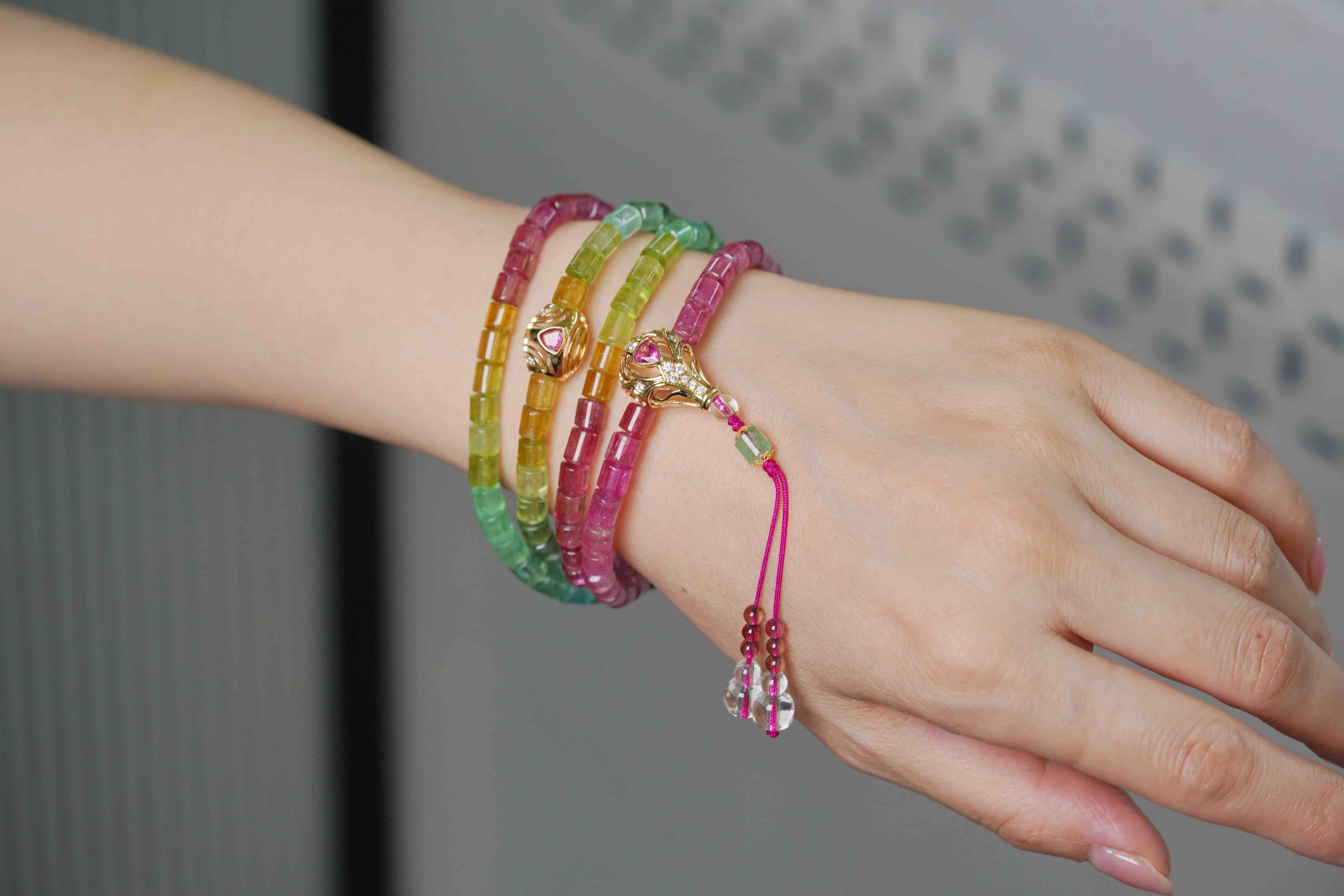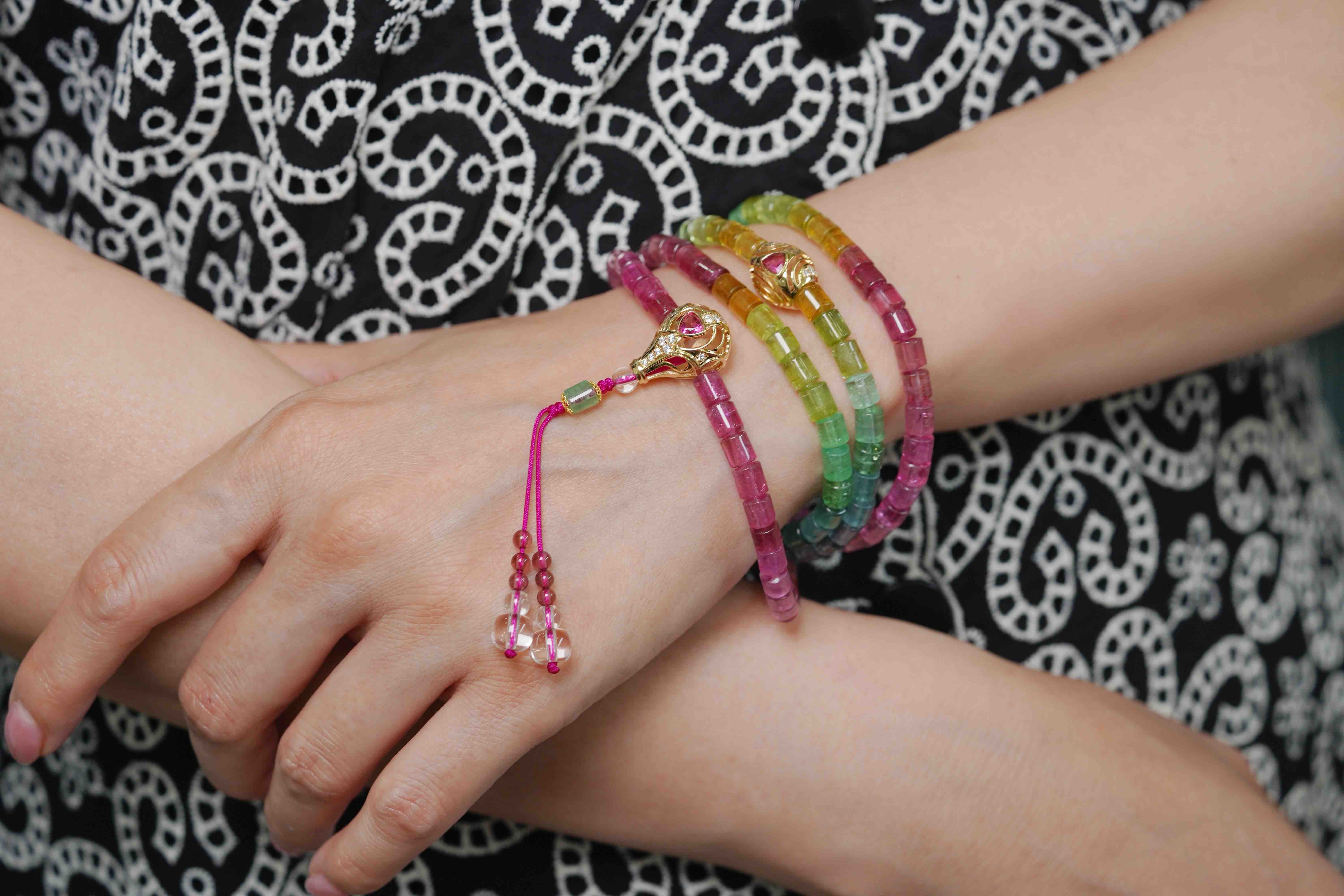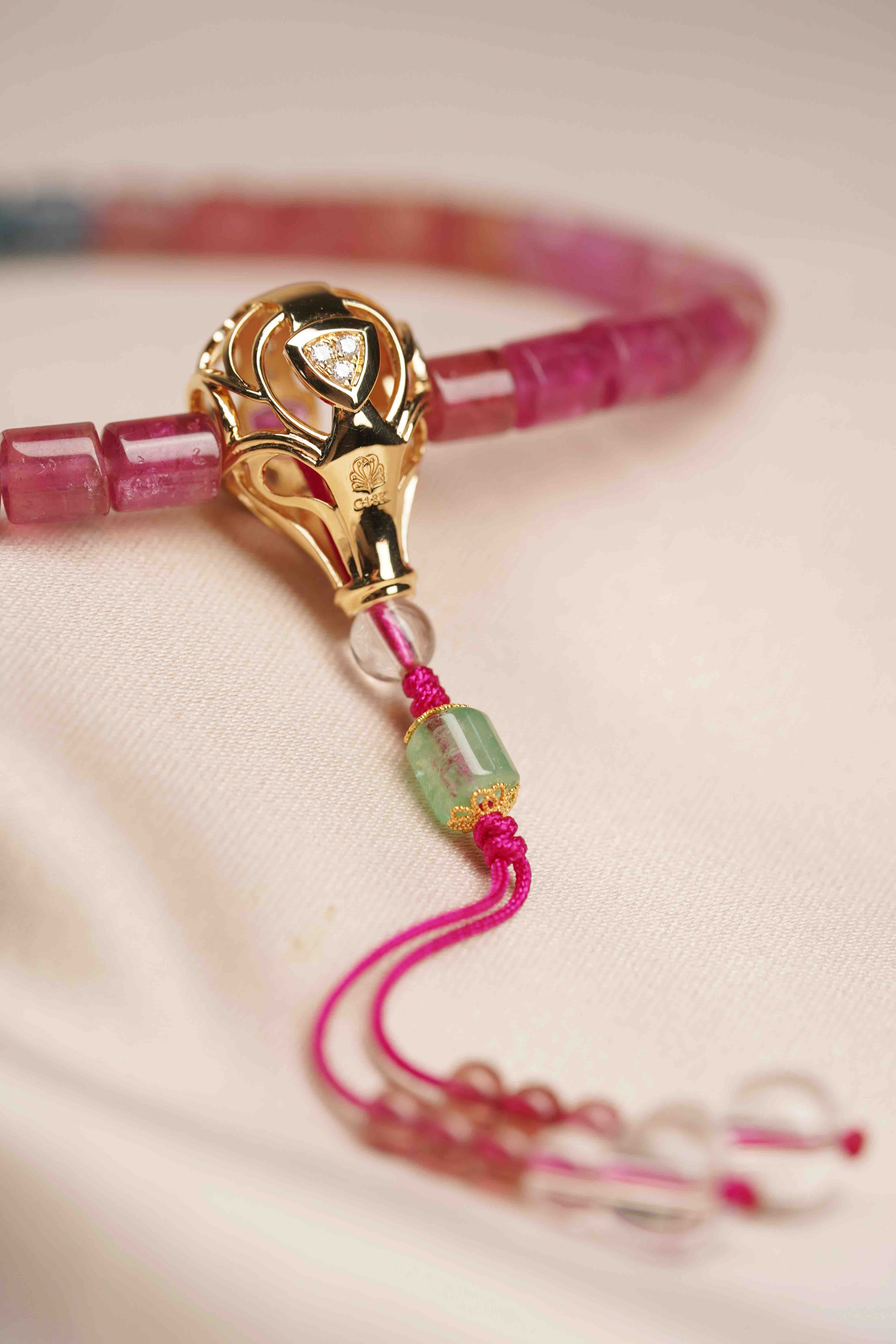 精选了一条彩虹碧玺,颜色的过度都是深思熟虑。厉害的是,我们用18K金设计打造的三通和顶珠,砚宝藏宝之作。