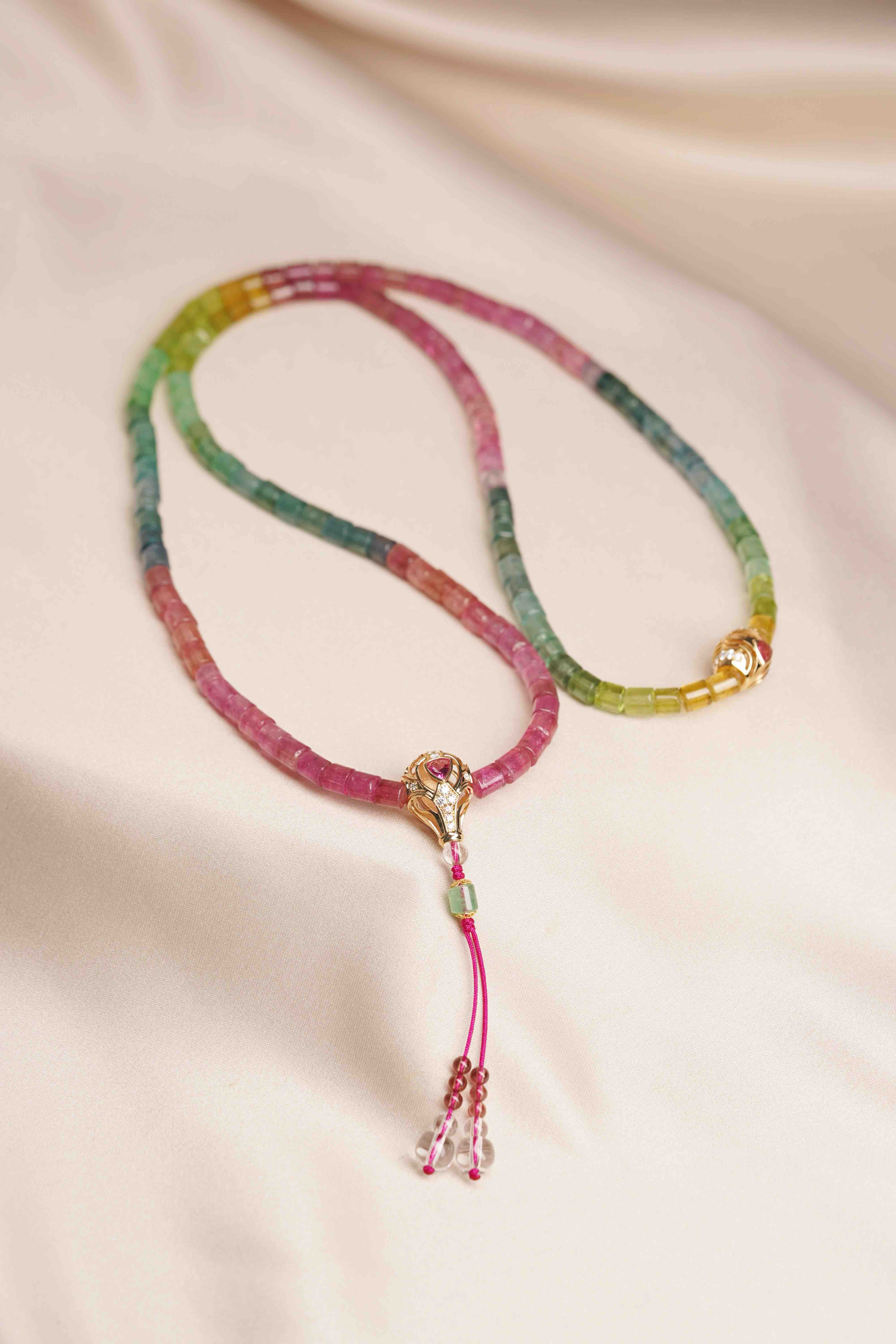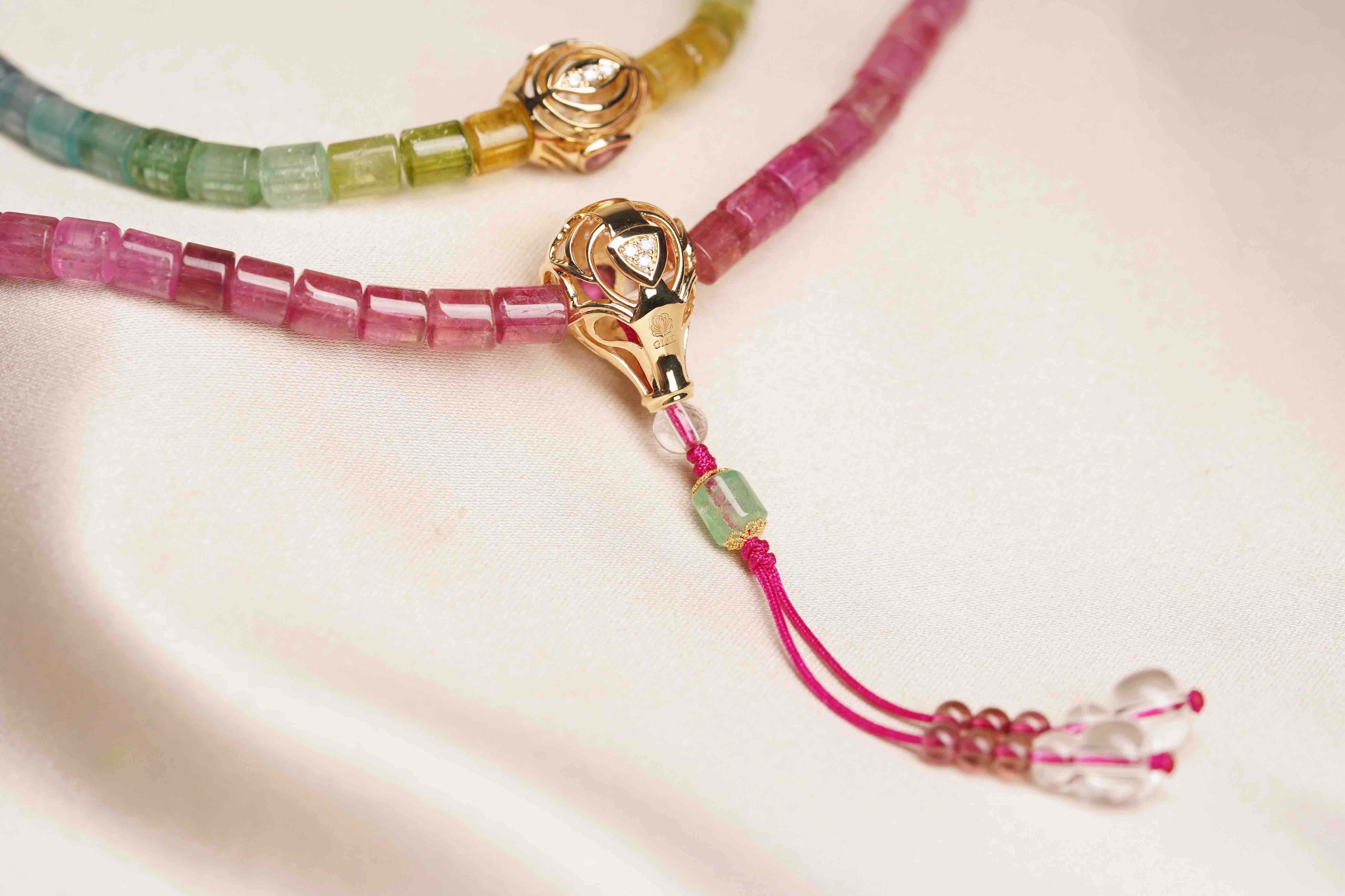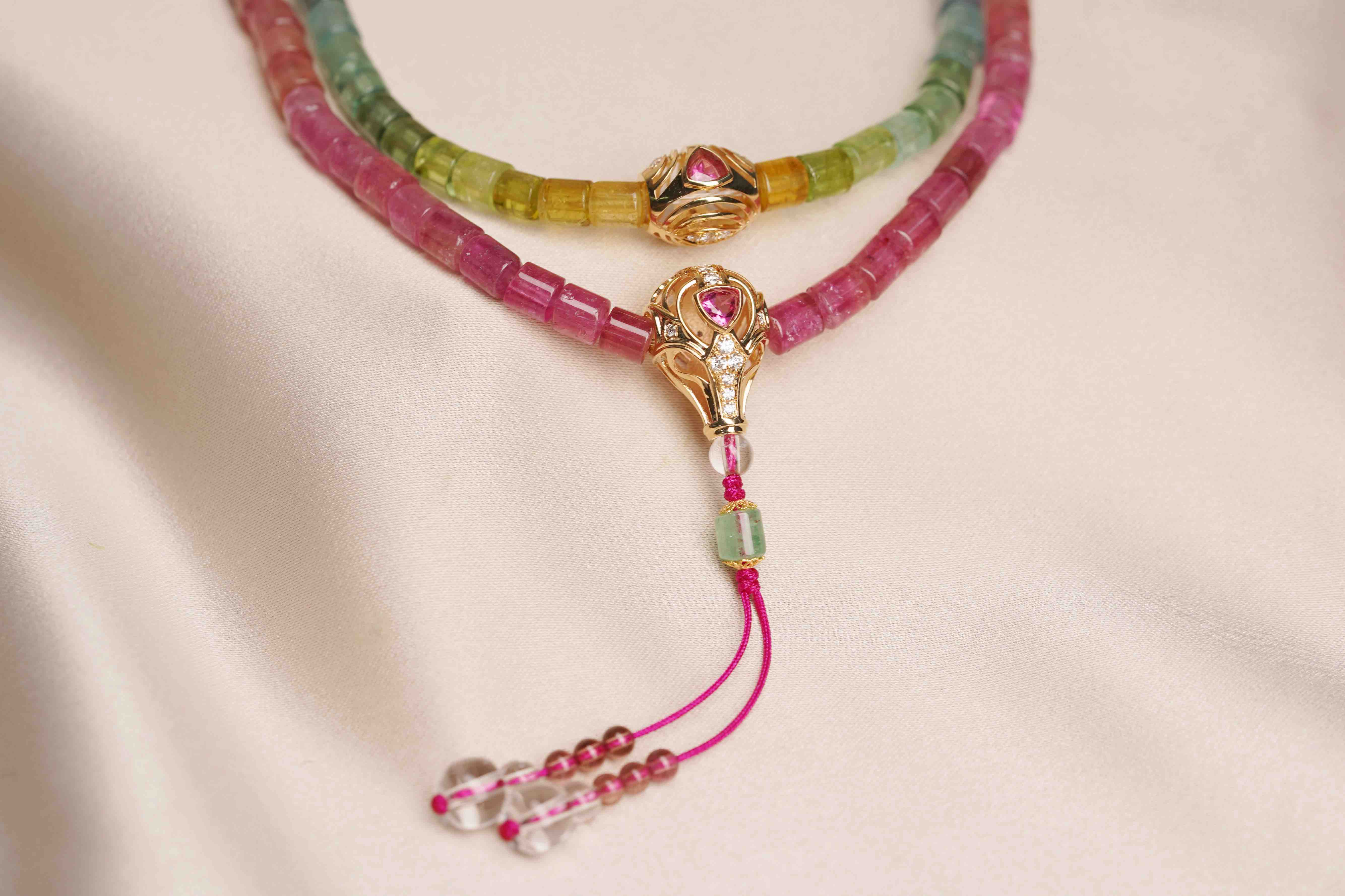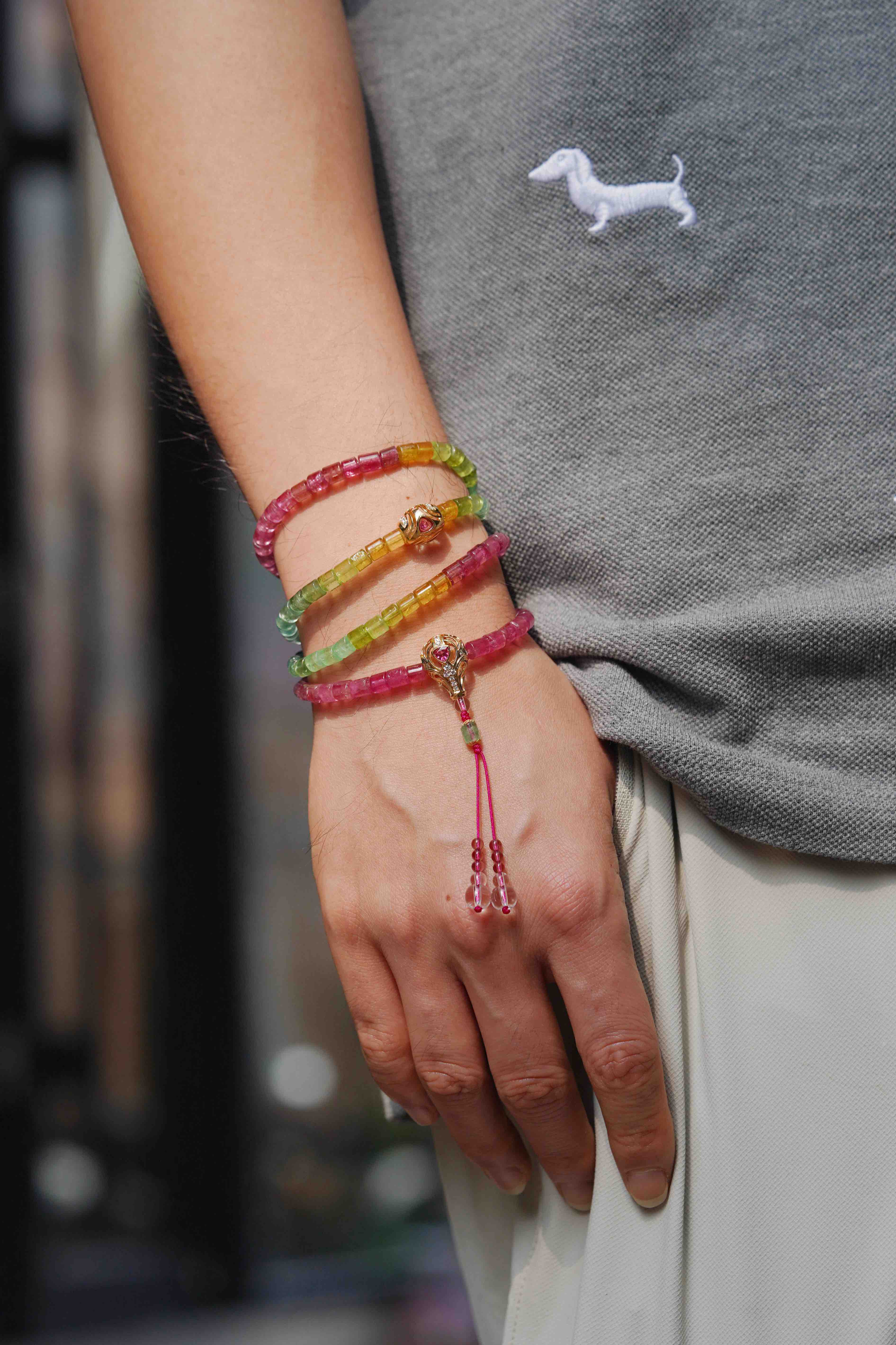 精选了一条彩虹碧玺,颜色的过度都是深思熟虑。厉害的是,我们用18K金设计打造的三通和顶珠,砚宝藏宝之作。