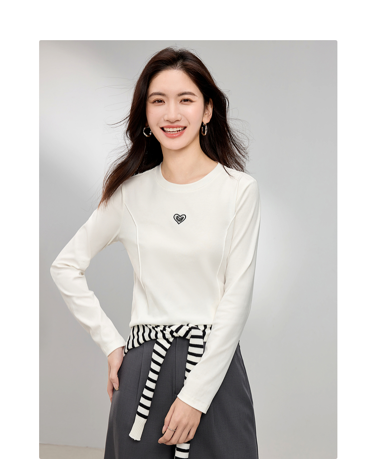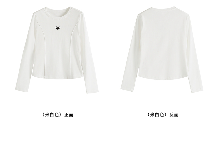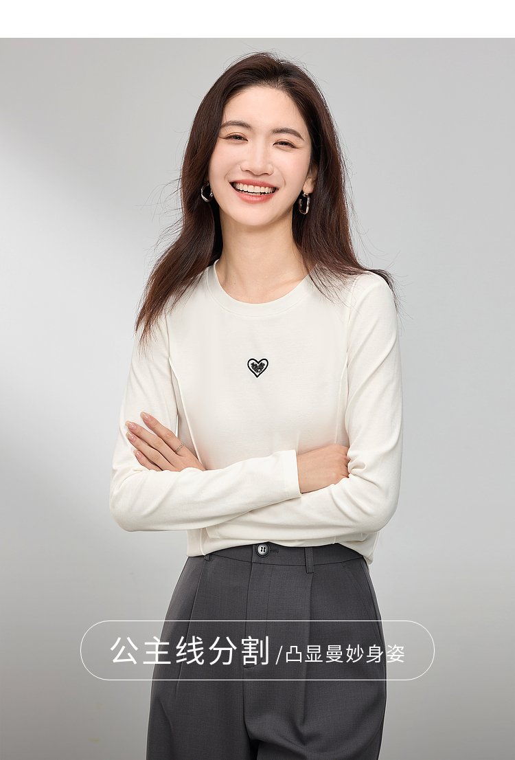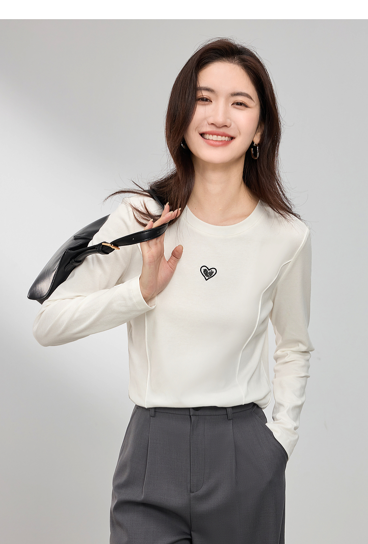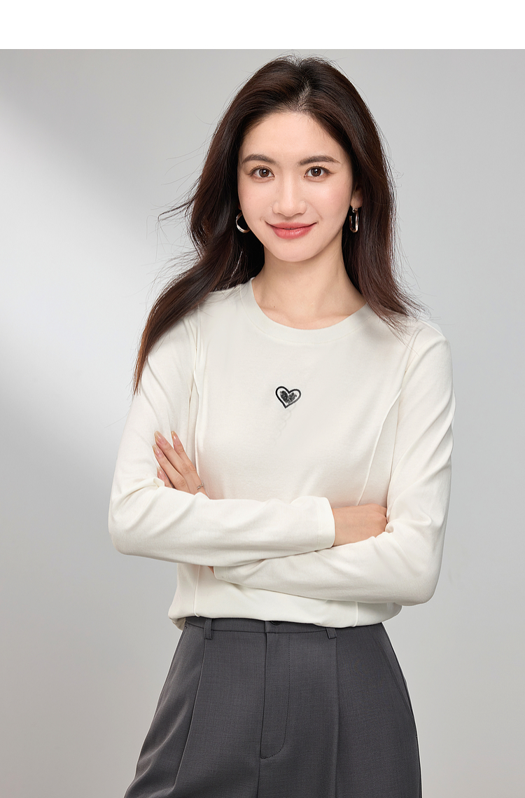 【周四狂欢价】熙世界白色长袖T恤女春季2025新款爱心刺绣圆领百搭显瘦棉质上衣