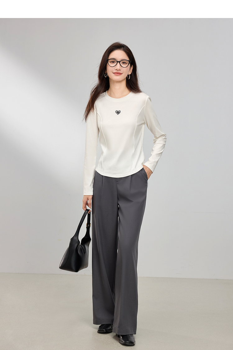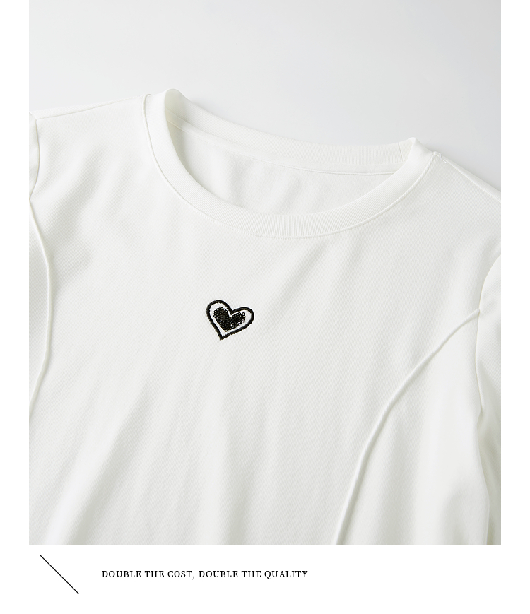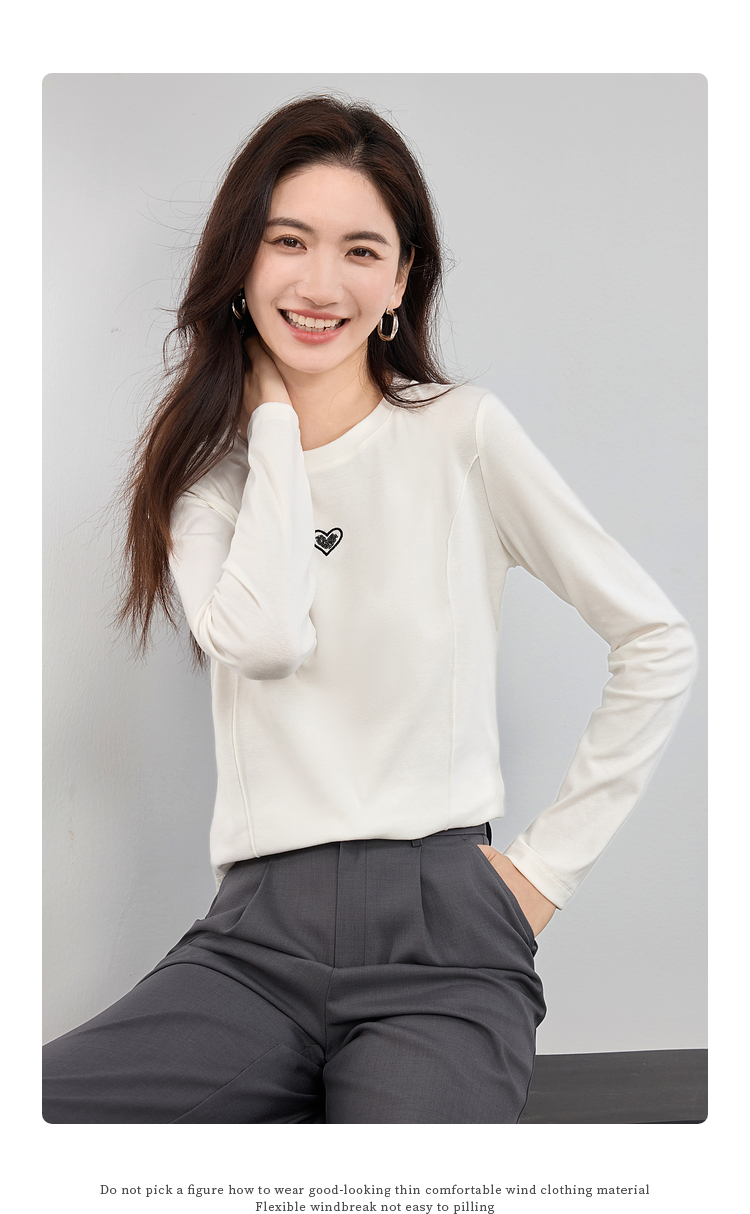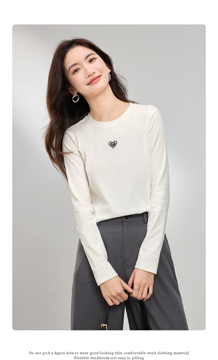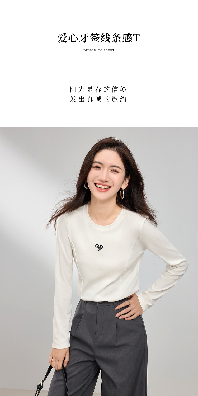 【周四狂欢价】熙世界白色长袖T恤女春季2025新款爱心刺绣圆领百搭显瘦棉质上衣