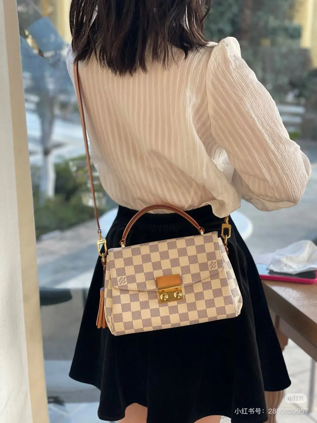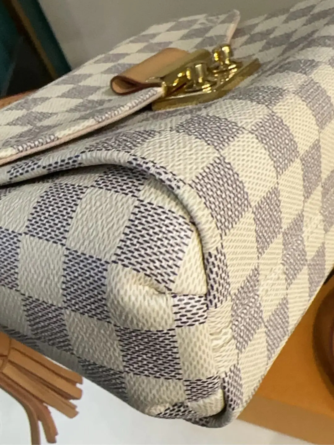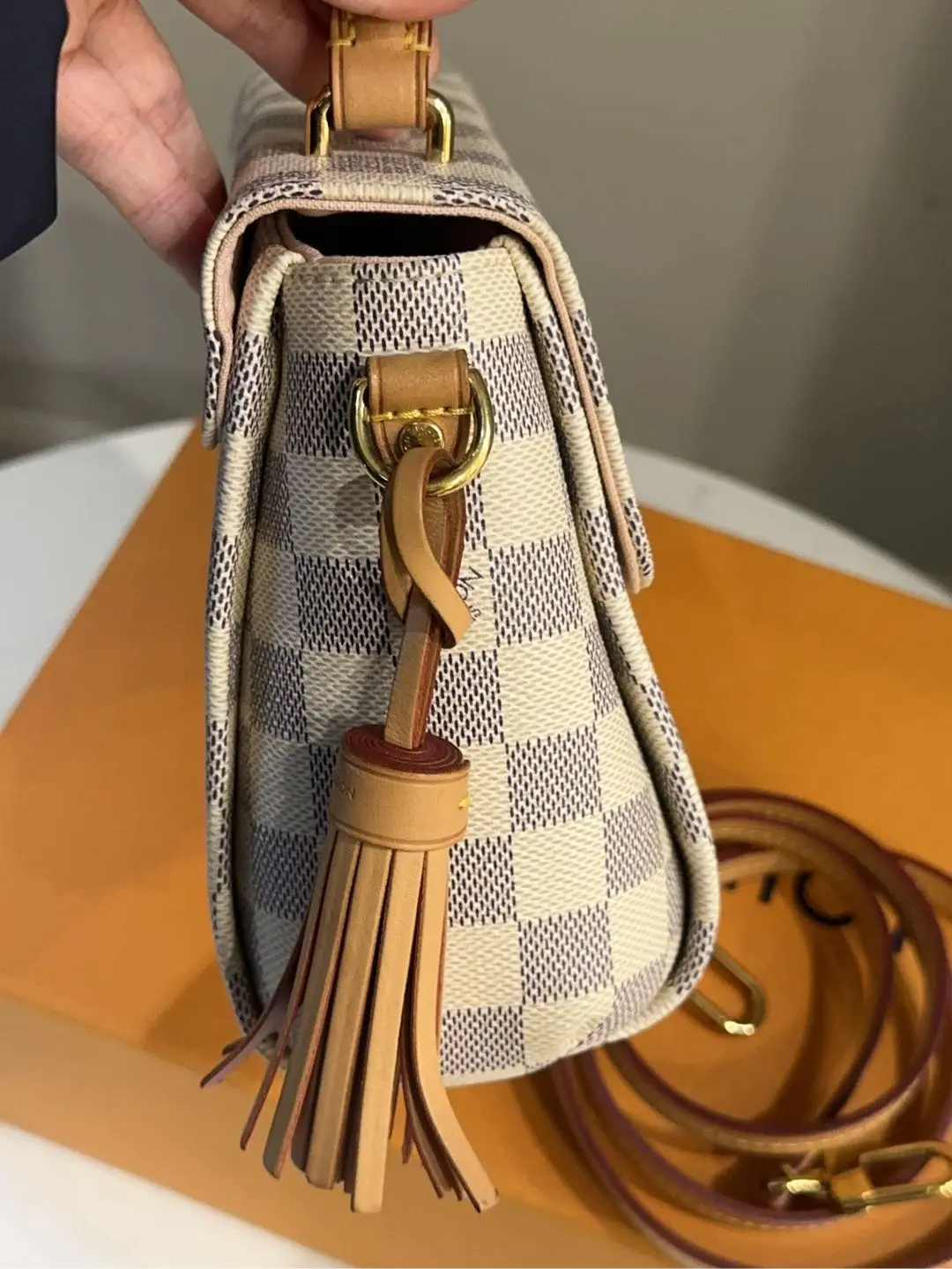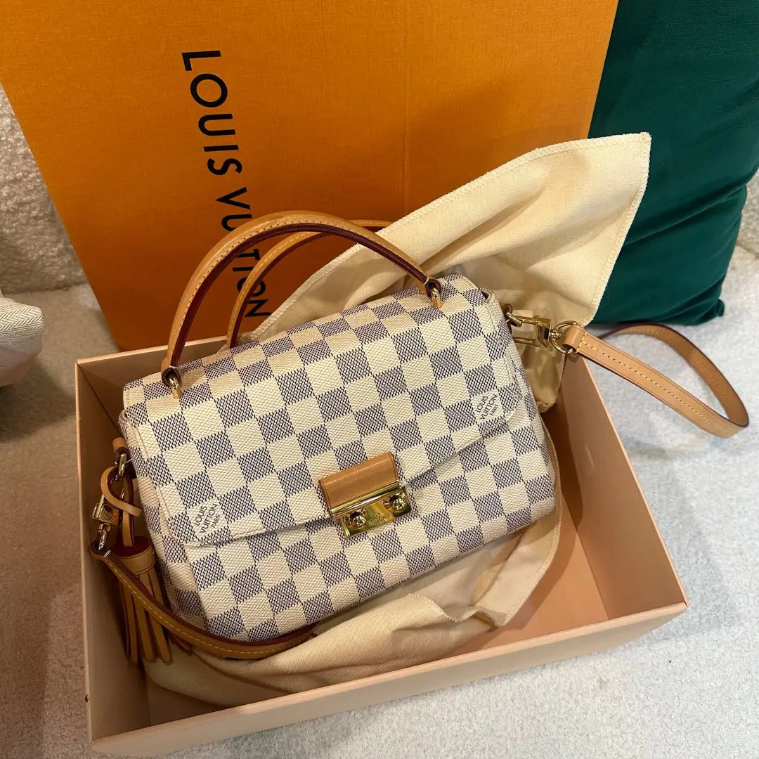 【商品详情】正品二手 LV Croisette 白棋盘格 流苏挂件 邮差包🍑97新 23*16 配件:流苏挂件 肩带 防尘袋 盒子。lady范儿十足!