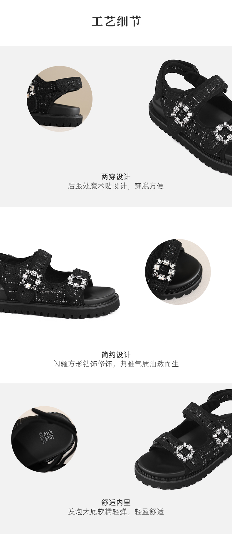 西村名物2023夏季新款运动凉鞋女魔术贴水钻粗跟一字式凉鞋13331