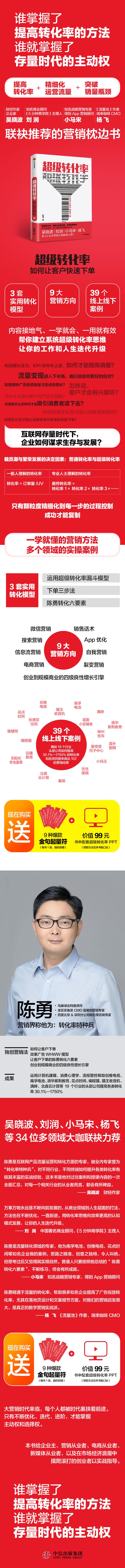 ☆陈勇,被营销界称为“转化率特种兵”,利用计算机建模、消费心理学和流程管控,帮助众多行业头部企业提高转化率。独创超级转化率营销方法首次大公开!