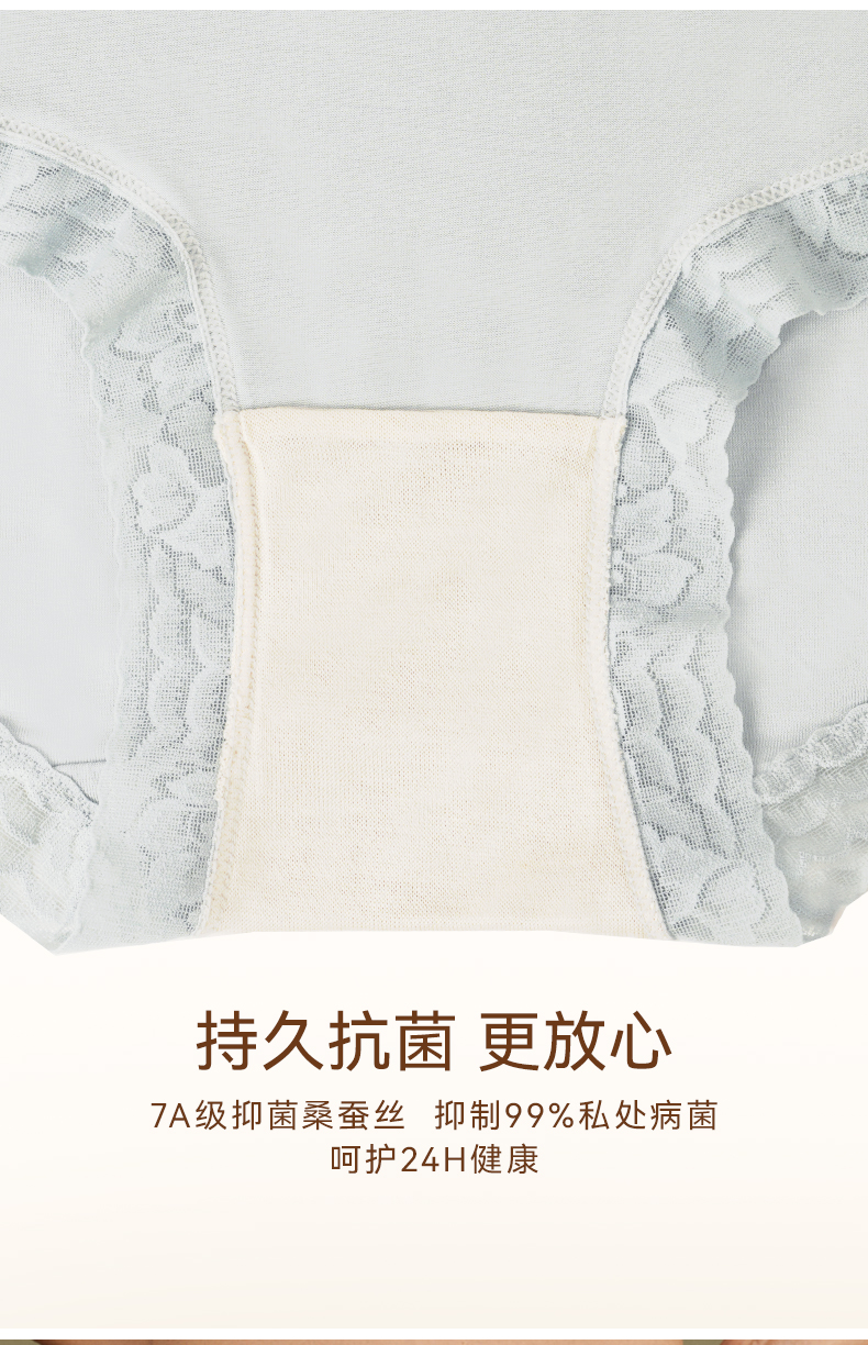 1、100%抗菌桑蚕丝,抑制99%私处病菌 2、天然抗菌0添加,守护私处健康 3、3A级温敏抗菌,呵护滋养一步到位 4、如奶皮般贴肤,高弹包臀不夹PP 5、24h贴身干爽舒适,为敏感而生