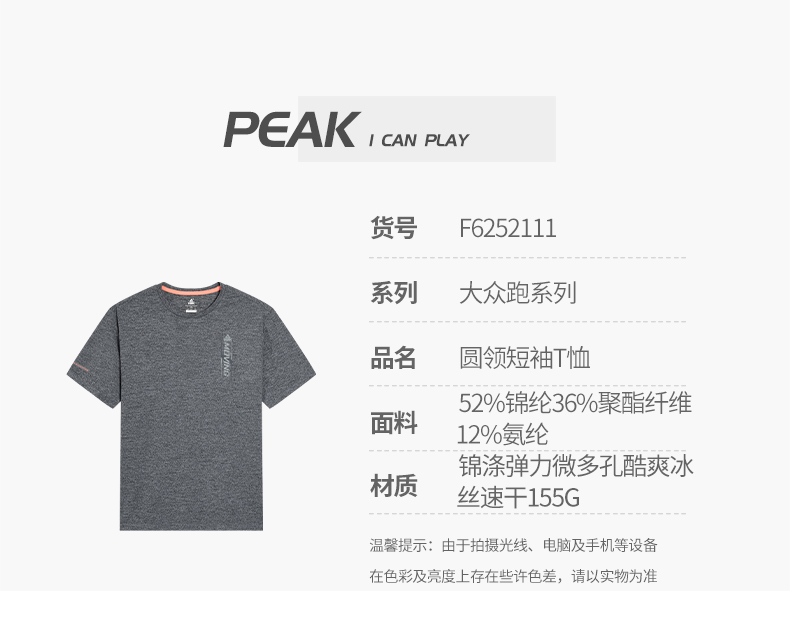 匹克2025年新款大众跑系列男款圆领短袖T恤F6252111