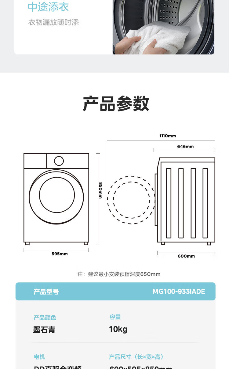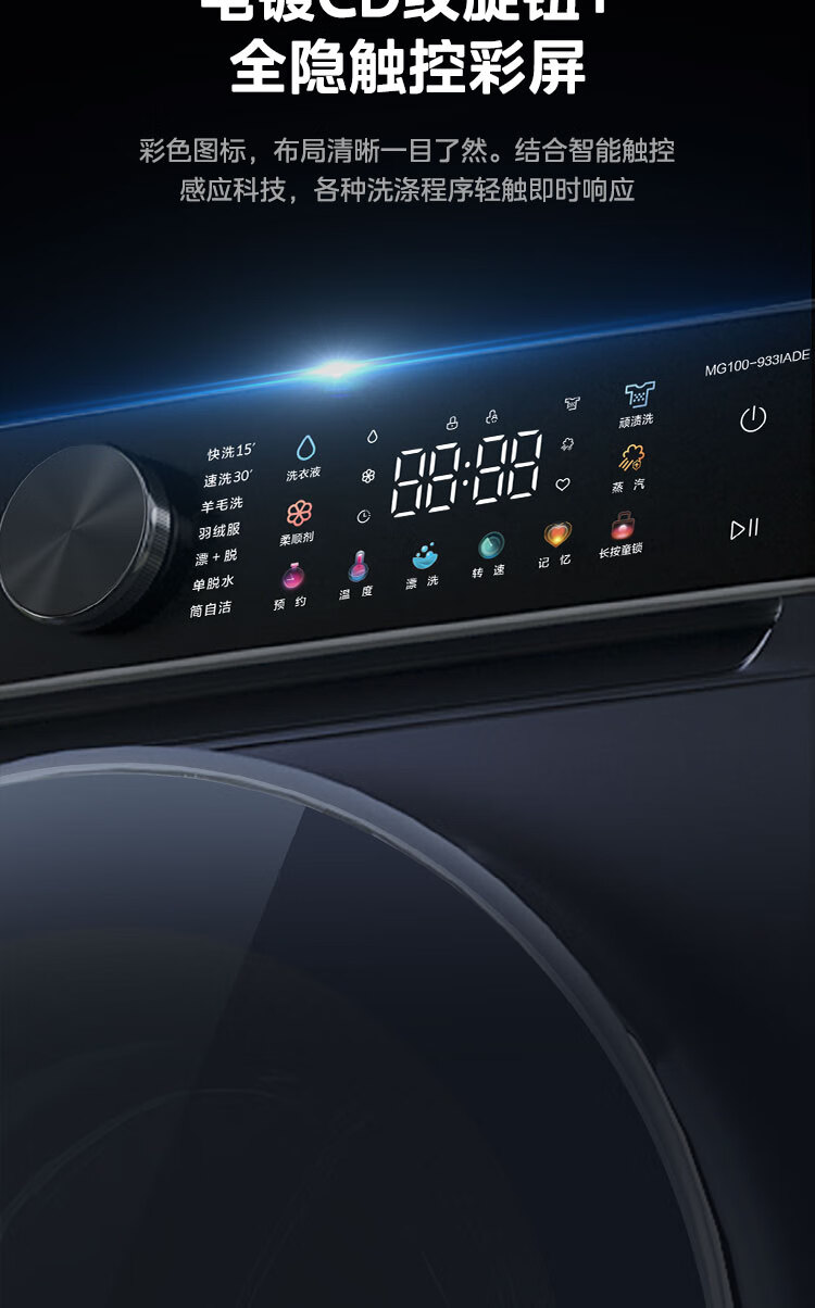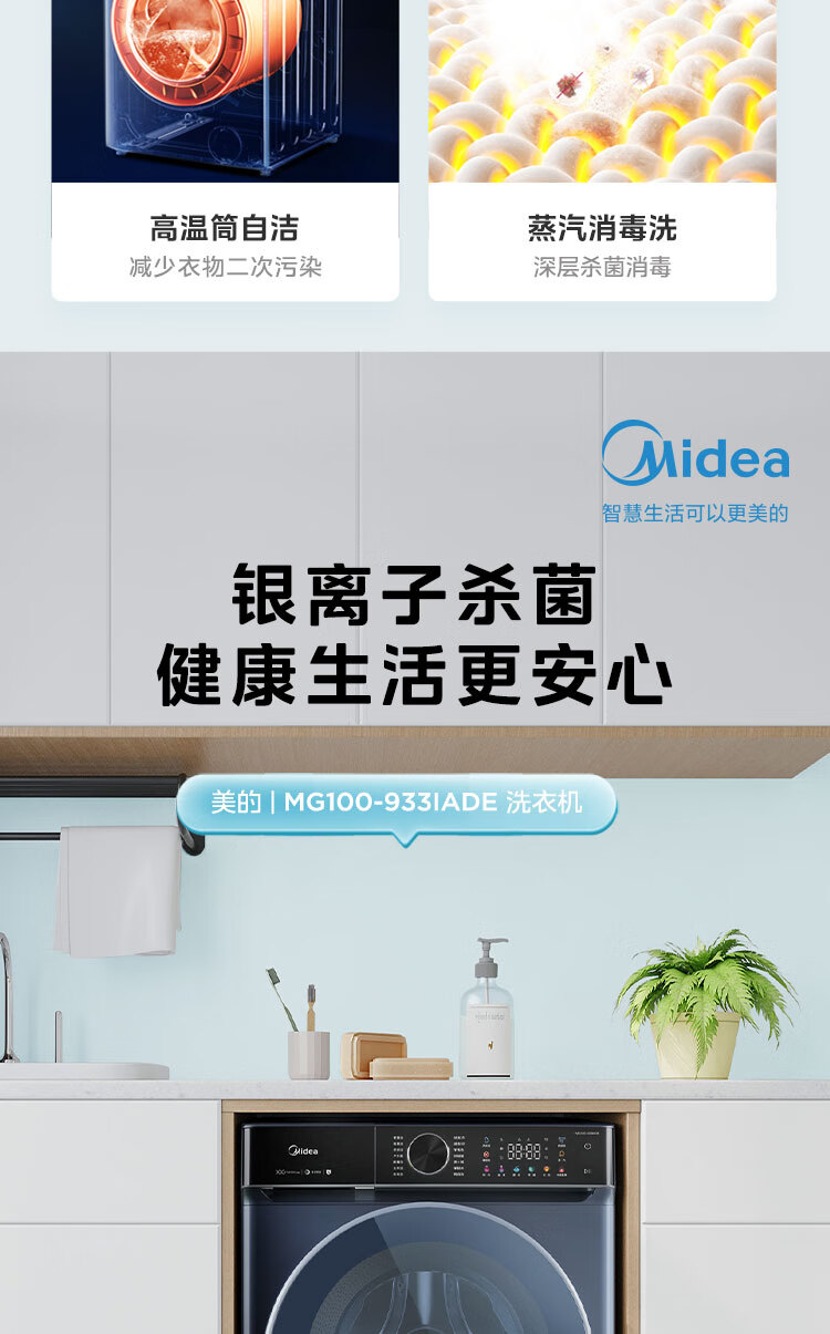美的(Midea)滚筒洗衣机全自动 银离子杀菌 高温筒自洁 DD直驱变频电机 10公斤MG100-933IADE 单洗滚筒933IADE