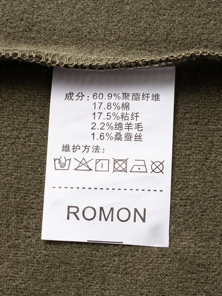 面料:60.9%聚酯纤维 17.8%棉 17.5%粘纤 2.2%绵羊毛 1.6%桑蚕丝