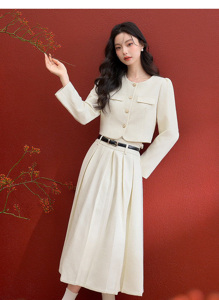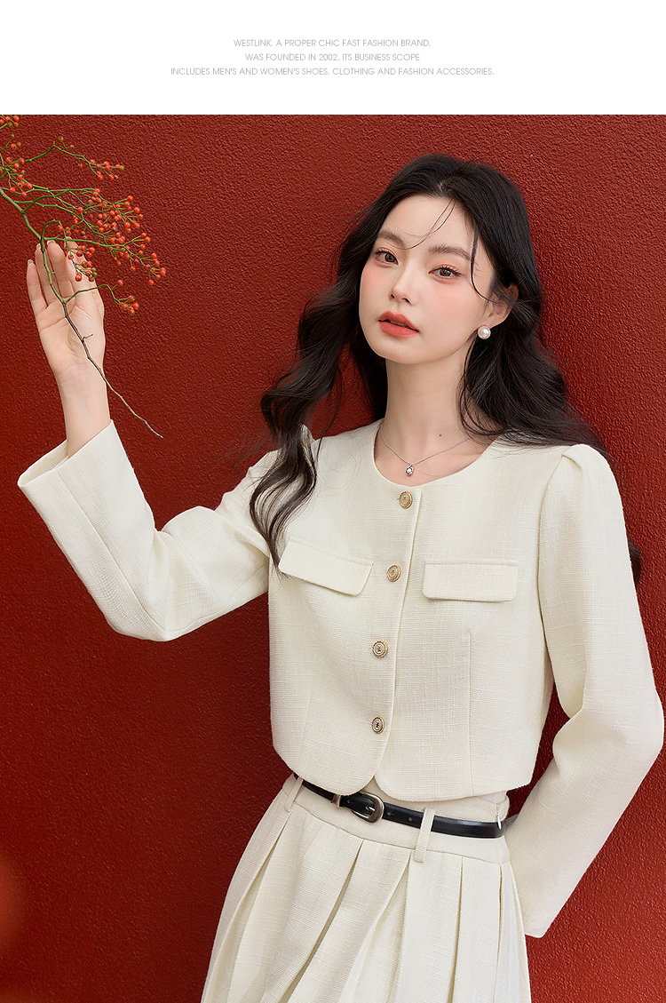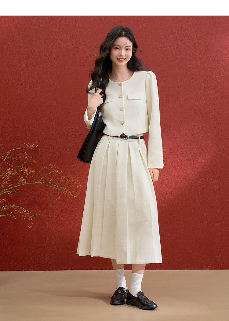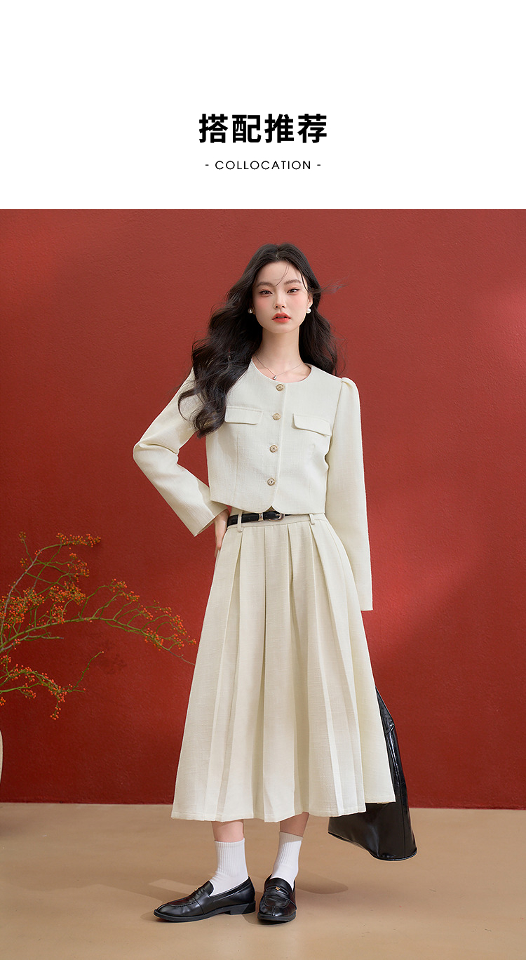 西遇千金小香风套装女冬季新款单排扣短外套高腰百褶裙两件套V3755286