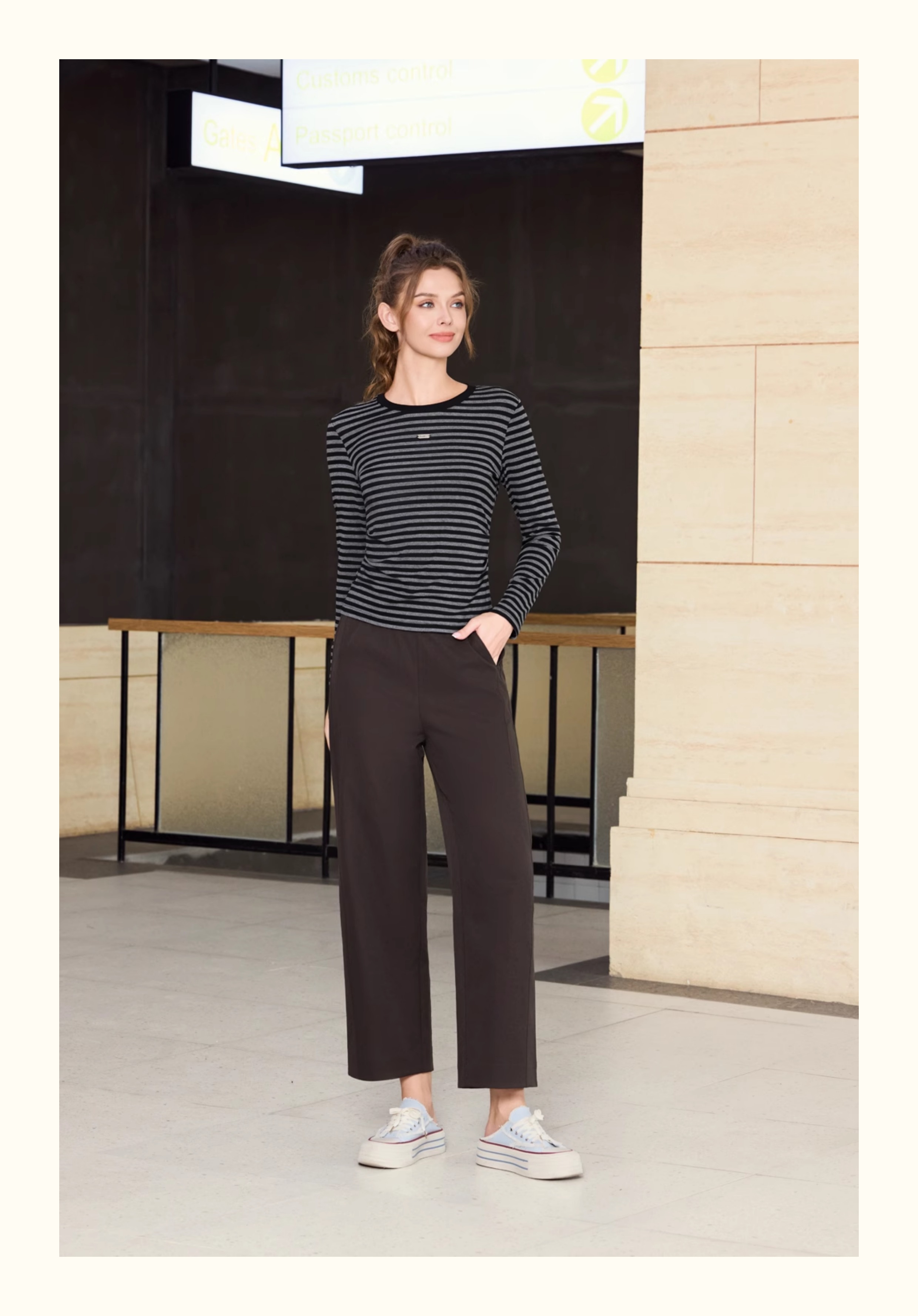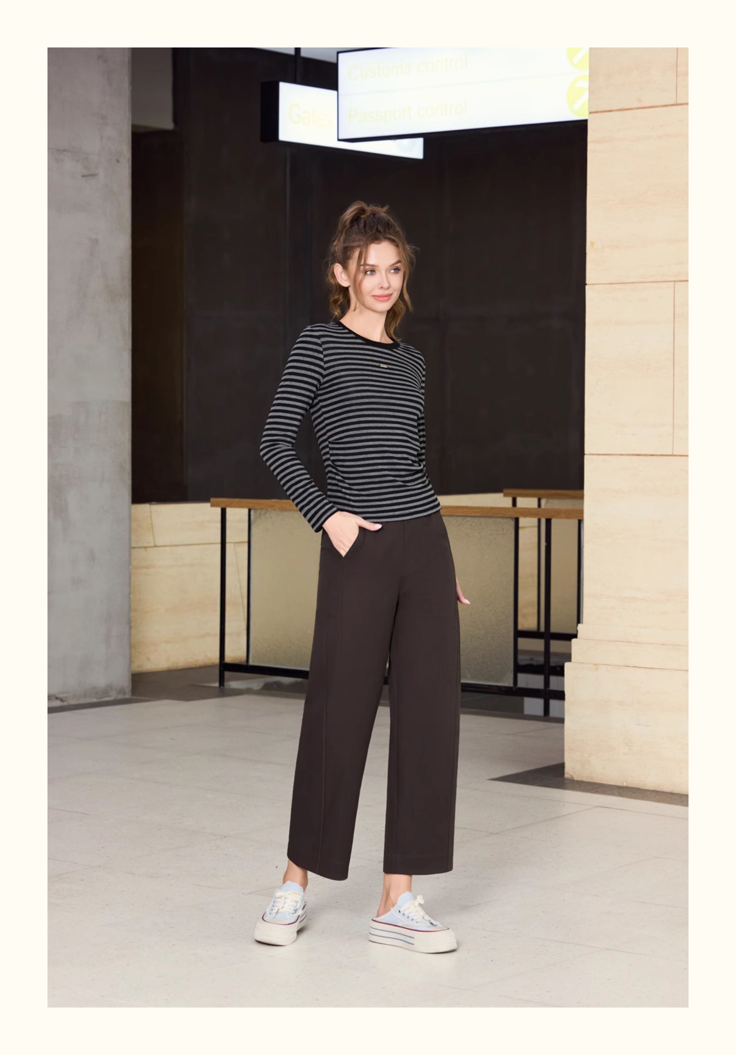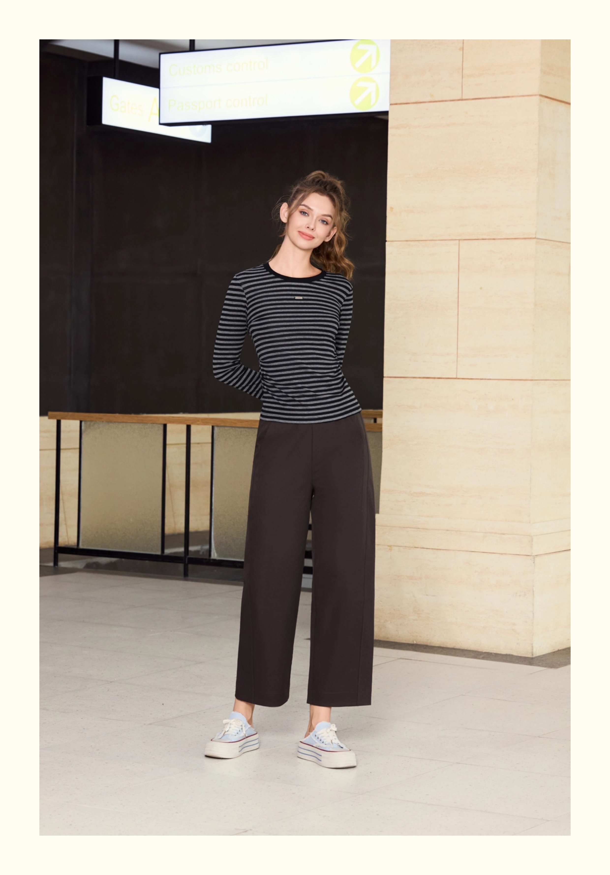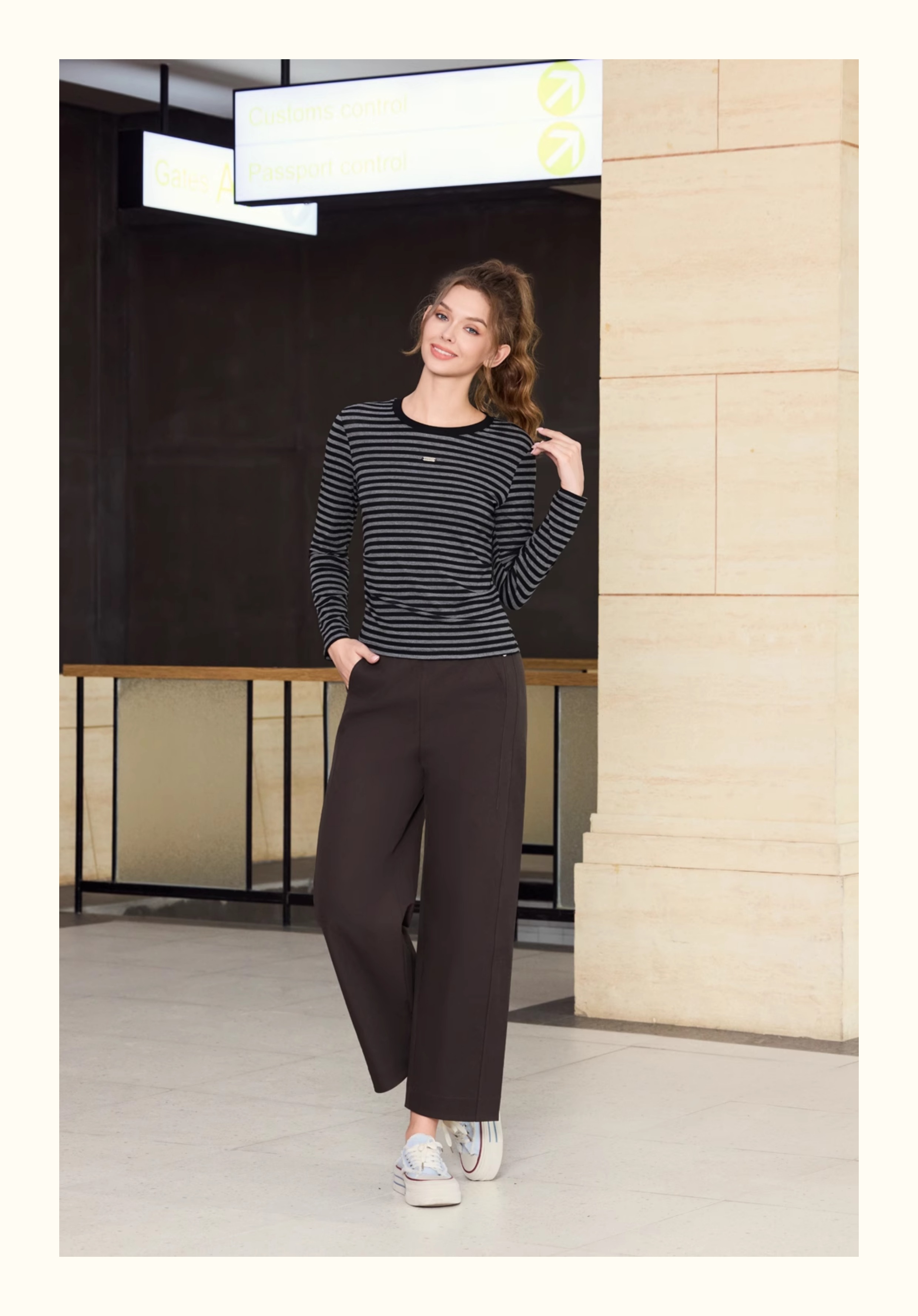 半身缘女装 秋季时尚黑白舒适透气圆领长袖T恤253113U01140004