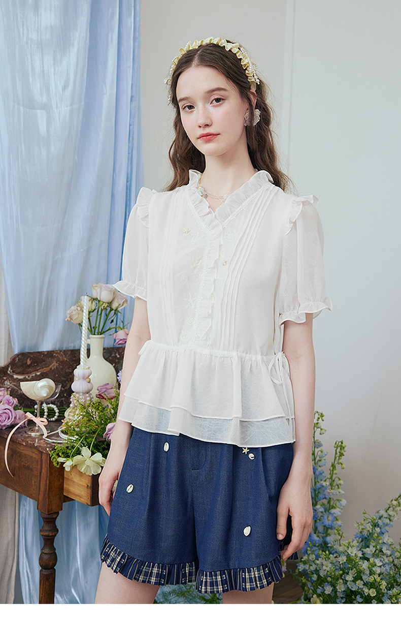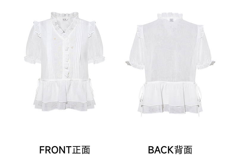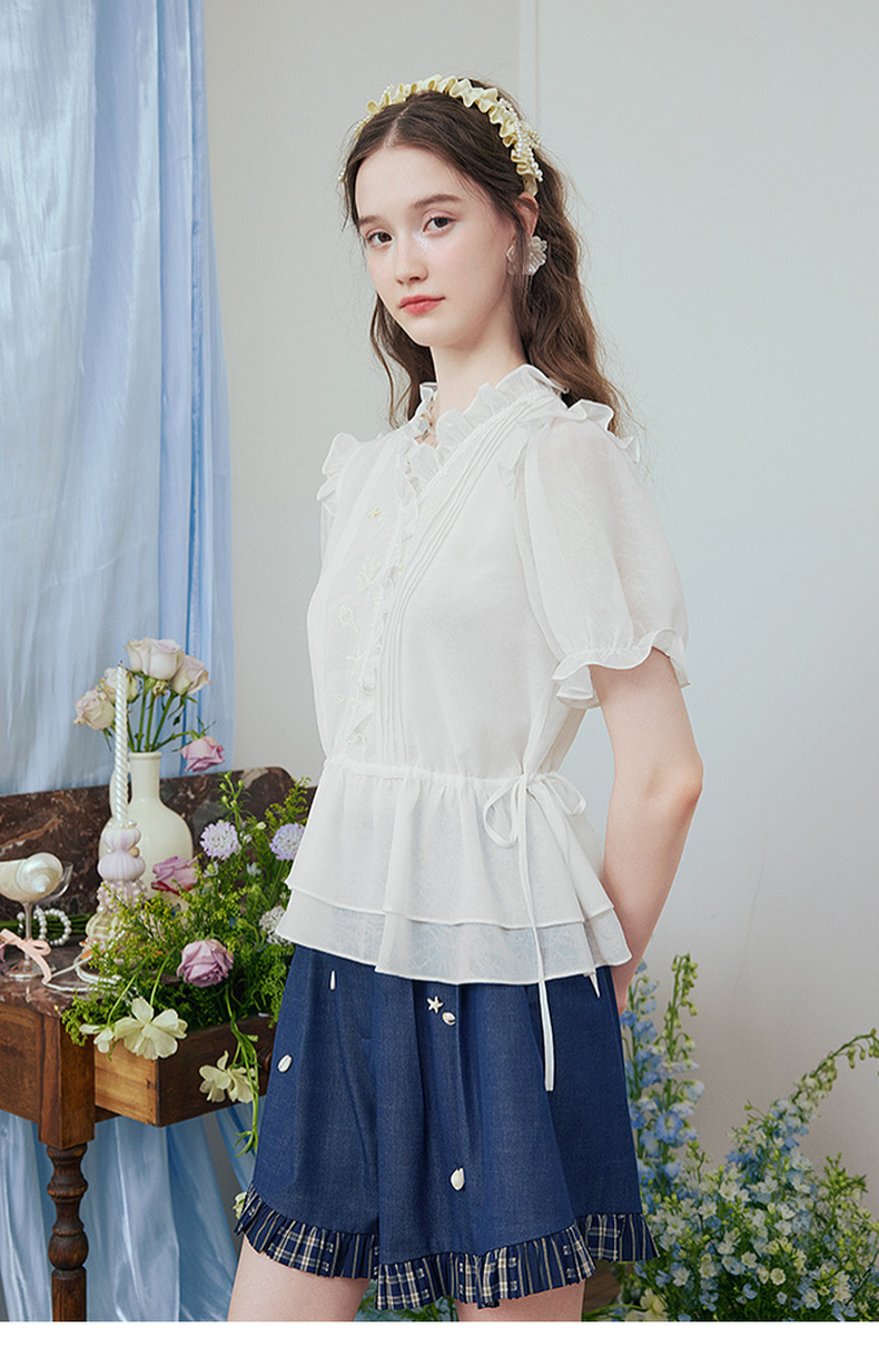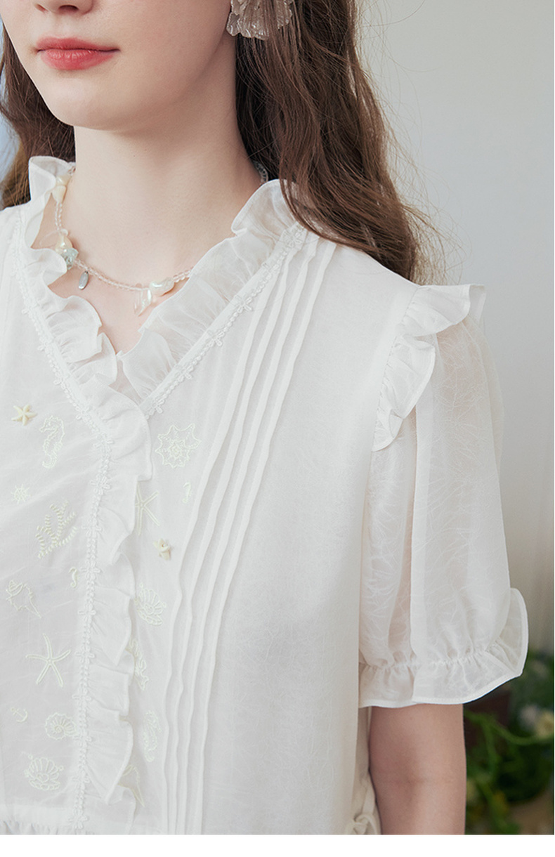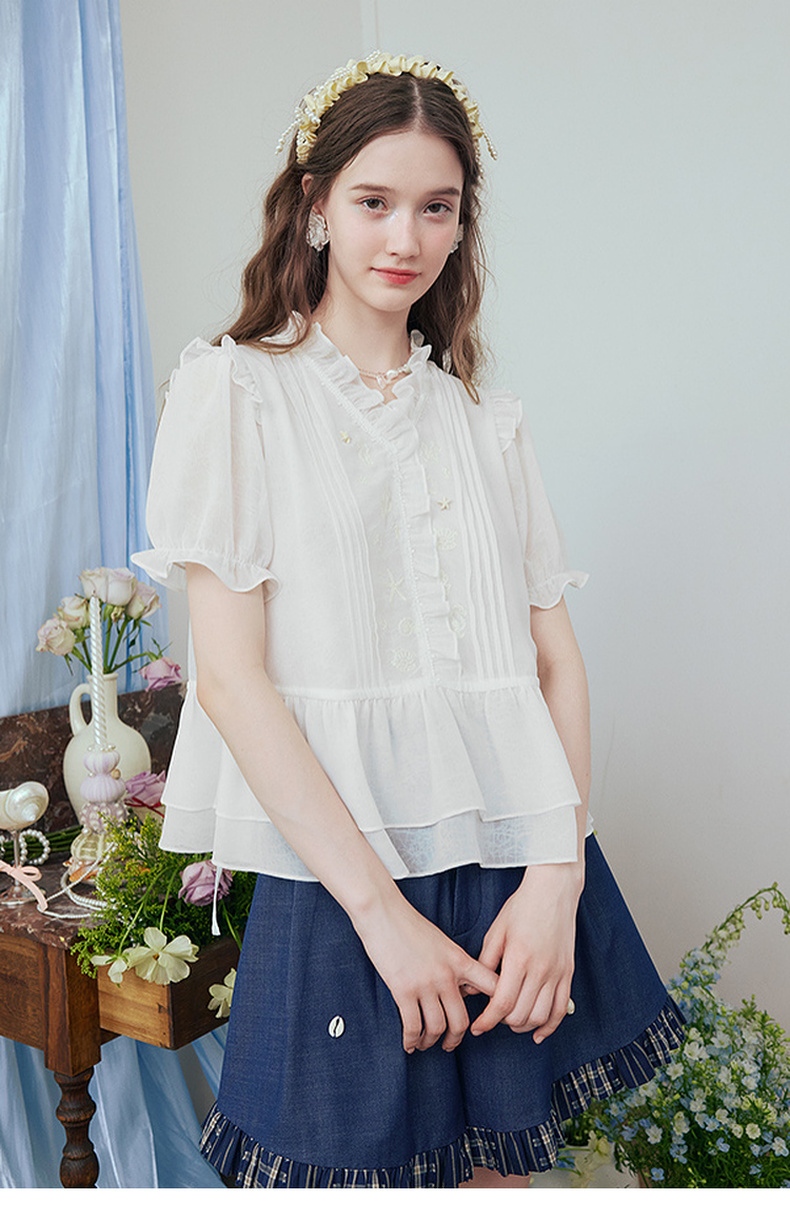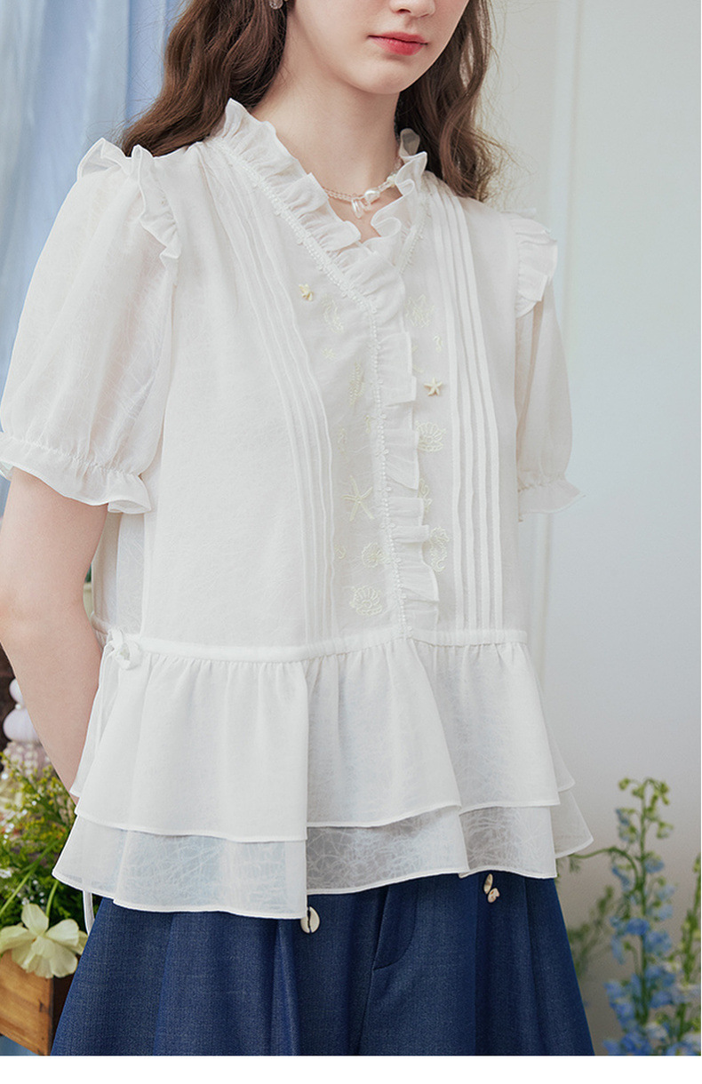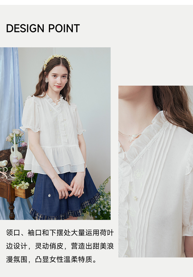 两三事 云纱捕风 2025夏季新款甜美绣花荷叶边拼接泡泡袖衬衫女