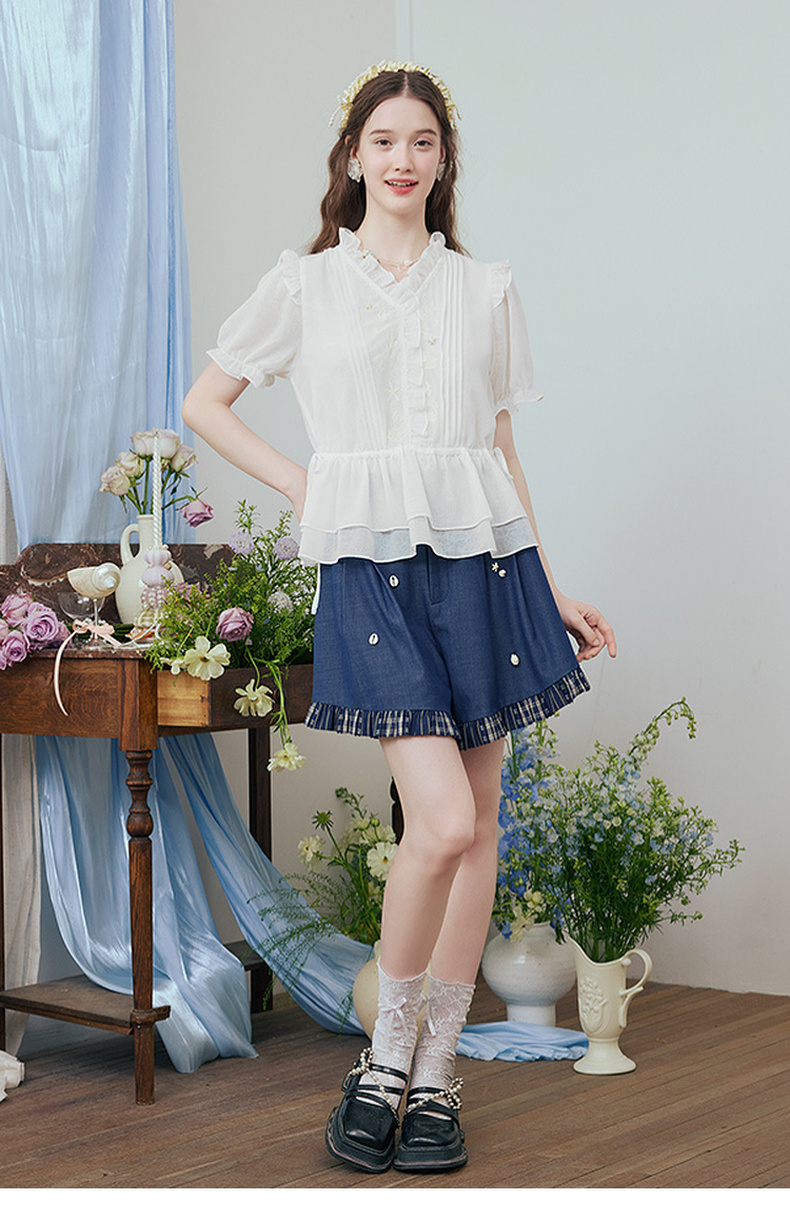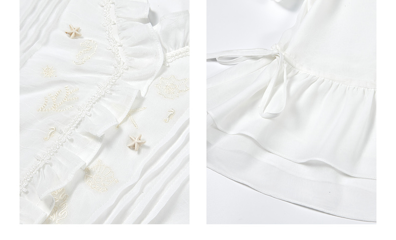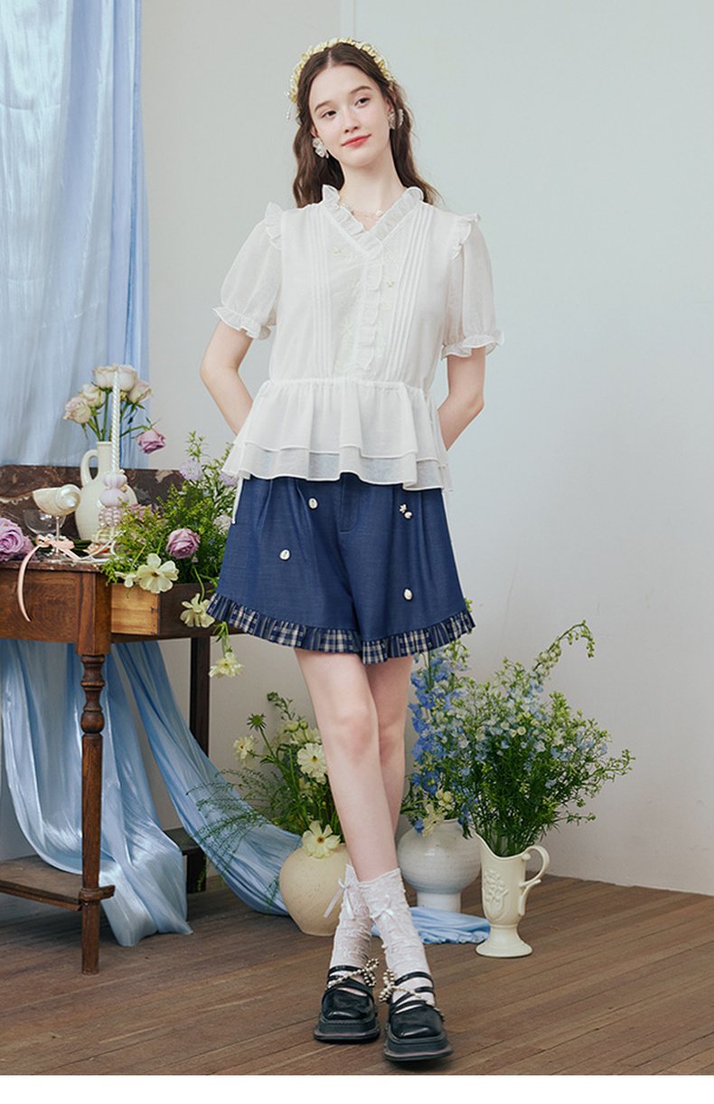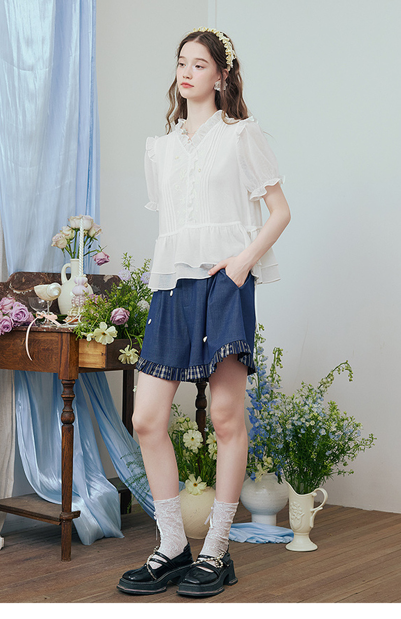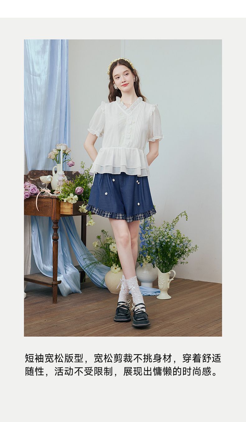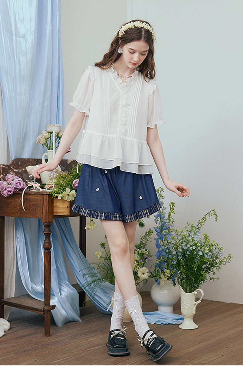 两三事 云纱捕风 2025夏季新款甜美绣花荷叶边拼接泡泡袖衬衫女