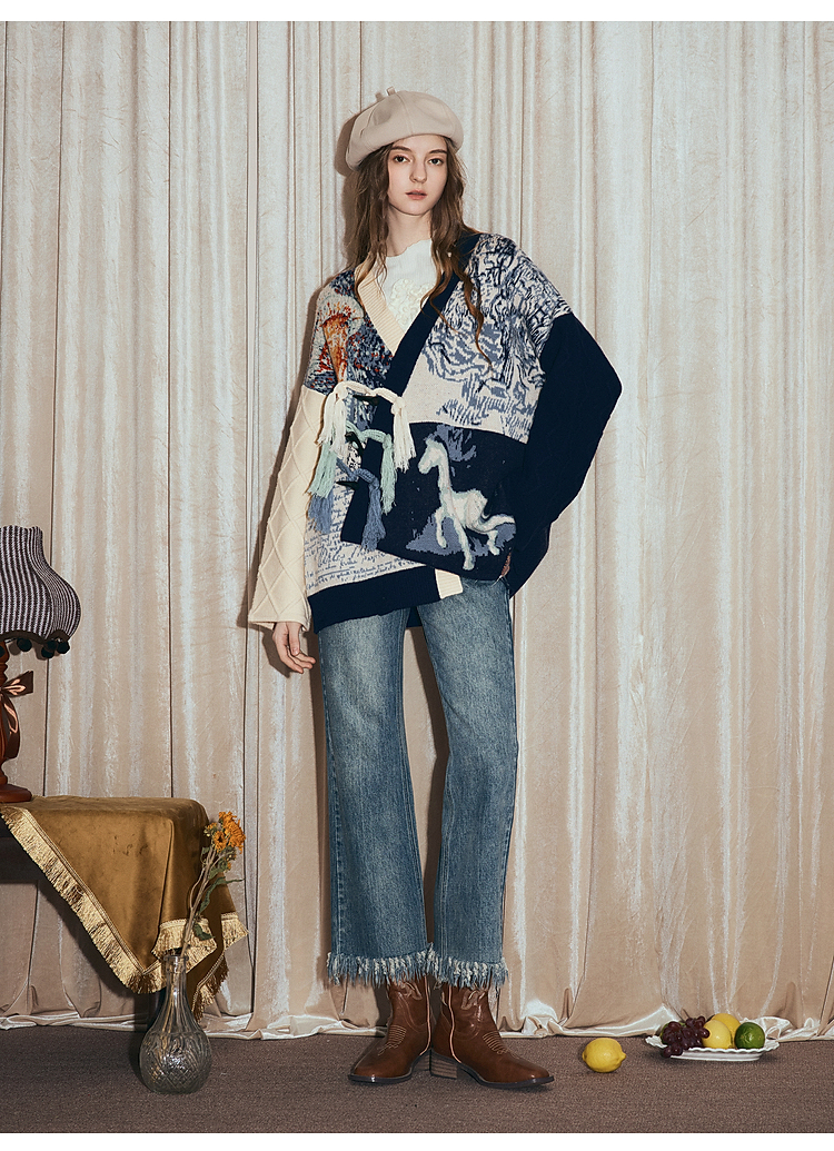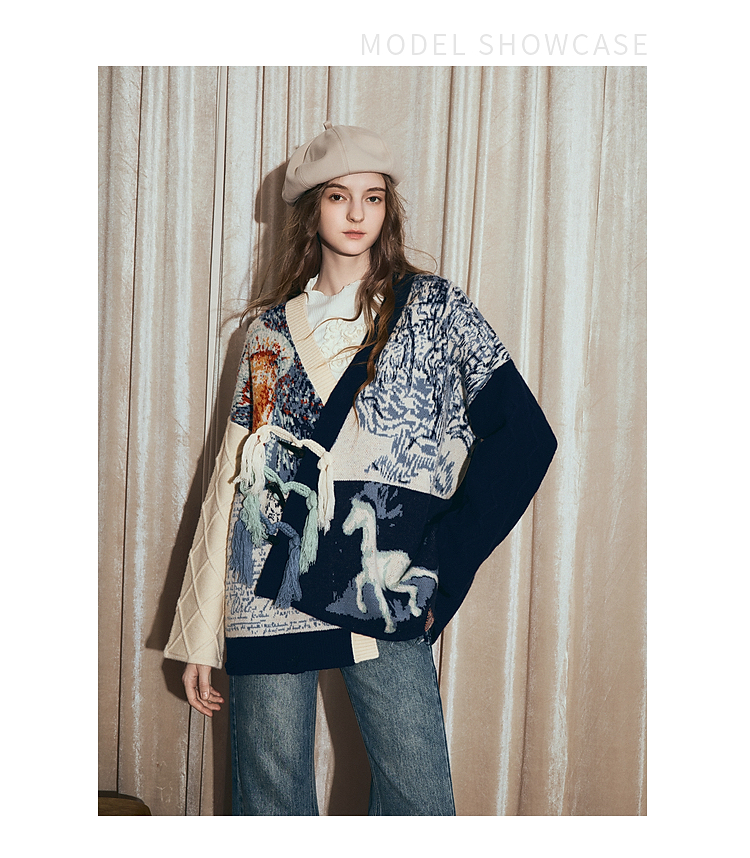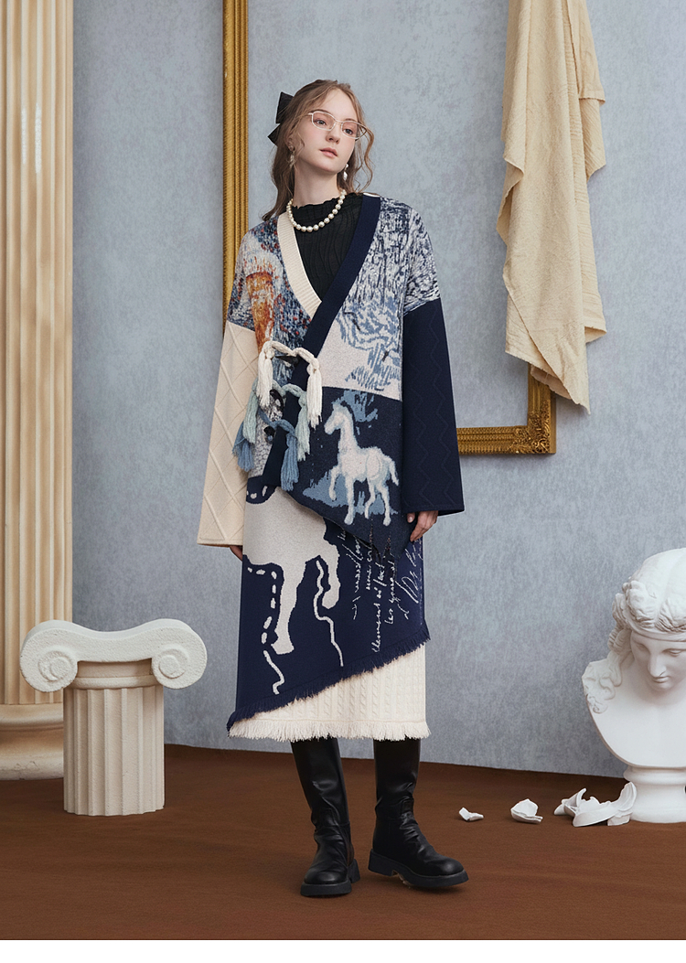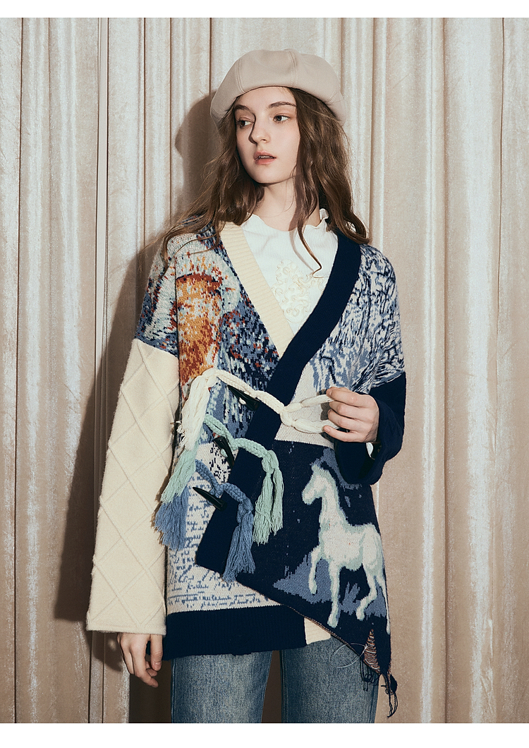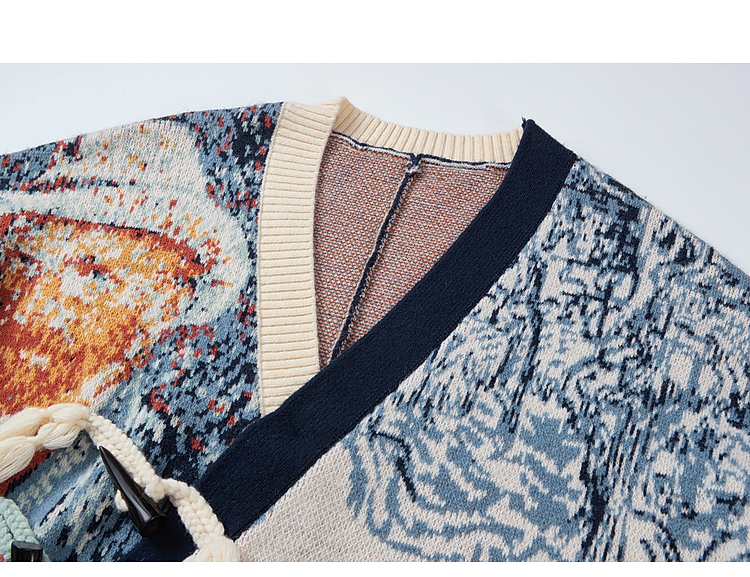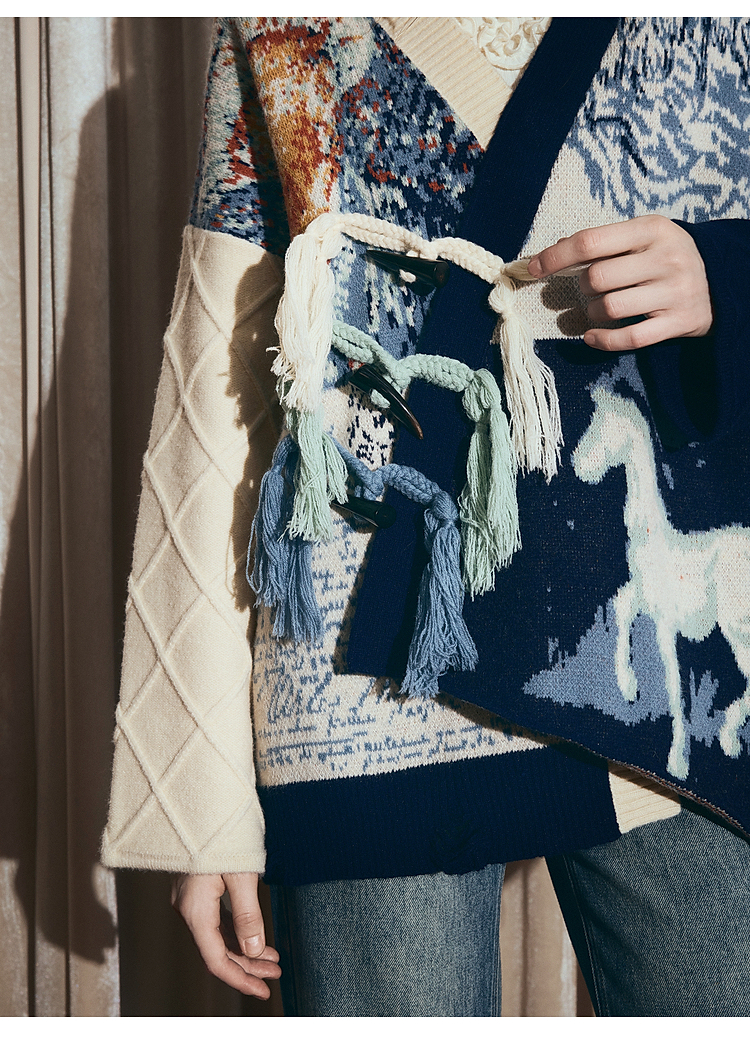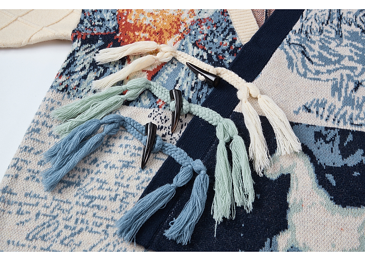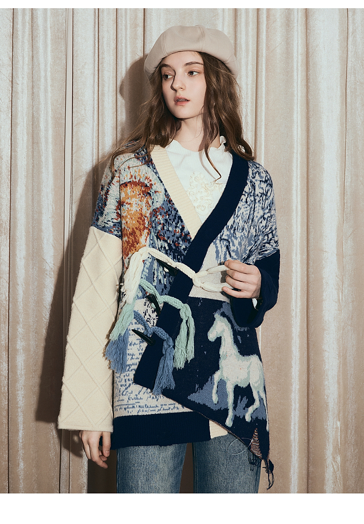 两三事梵高文艺悉尼海岸2025冬新款流苏盘扣不对称花色毛衣外套女