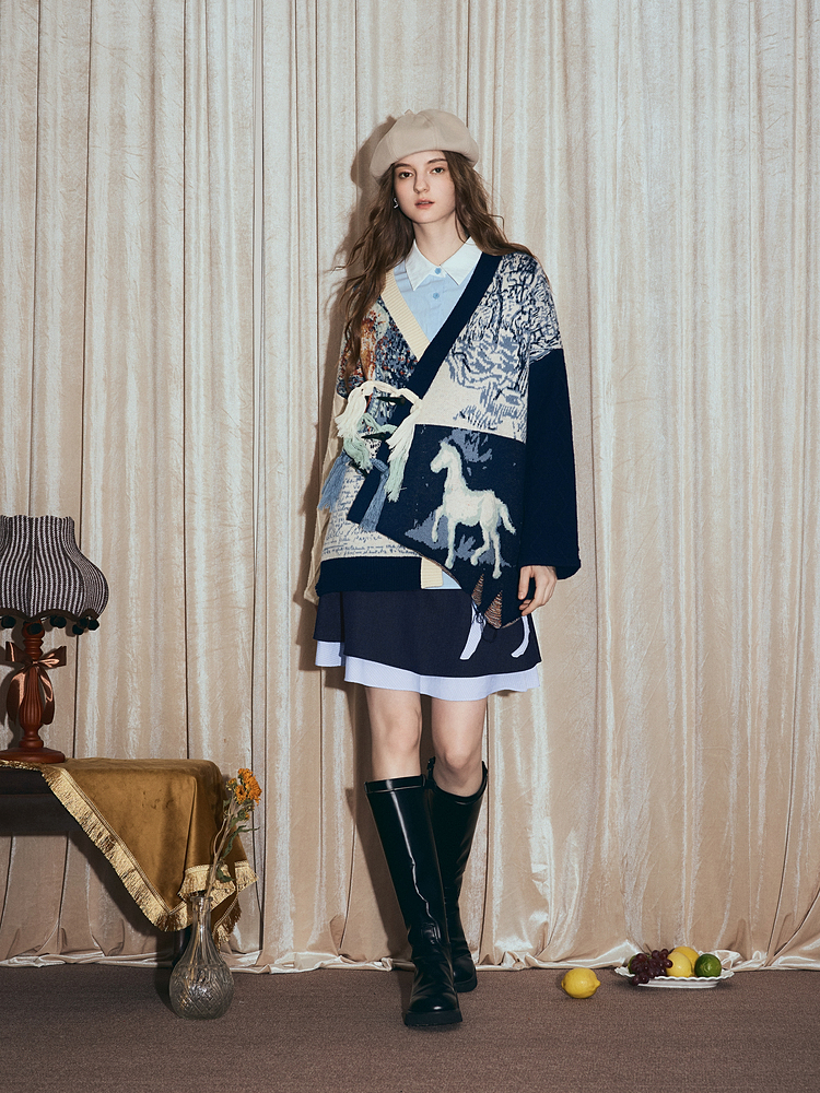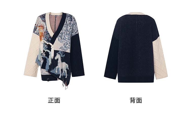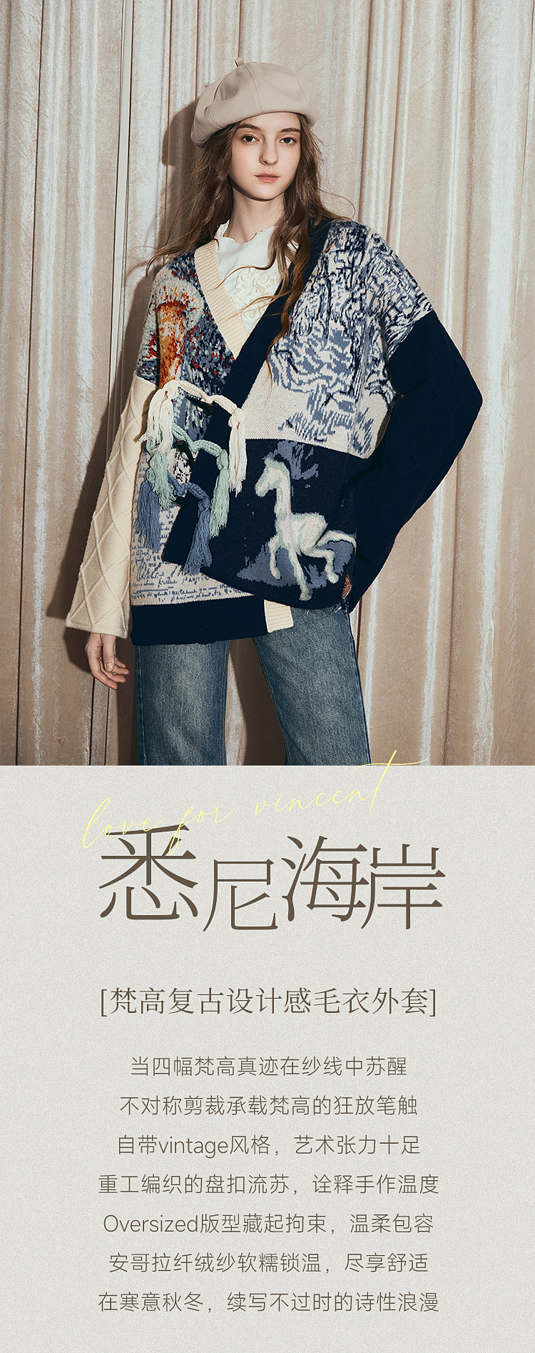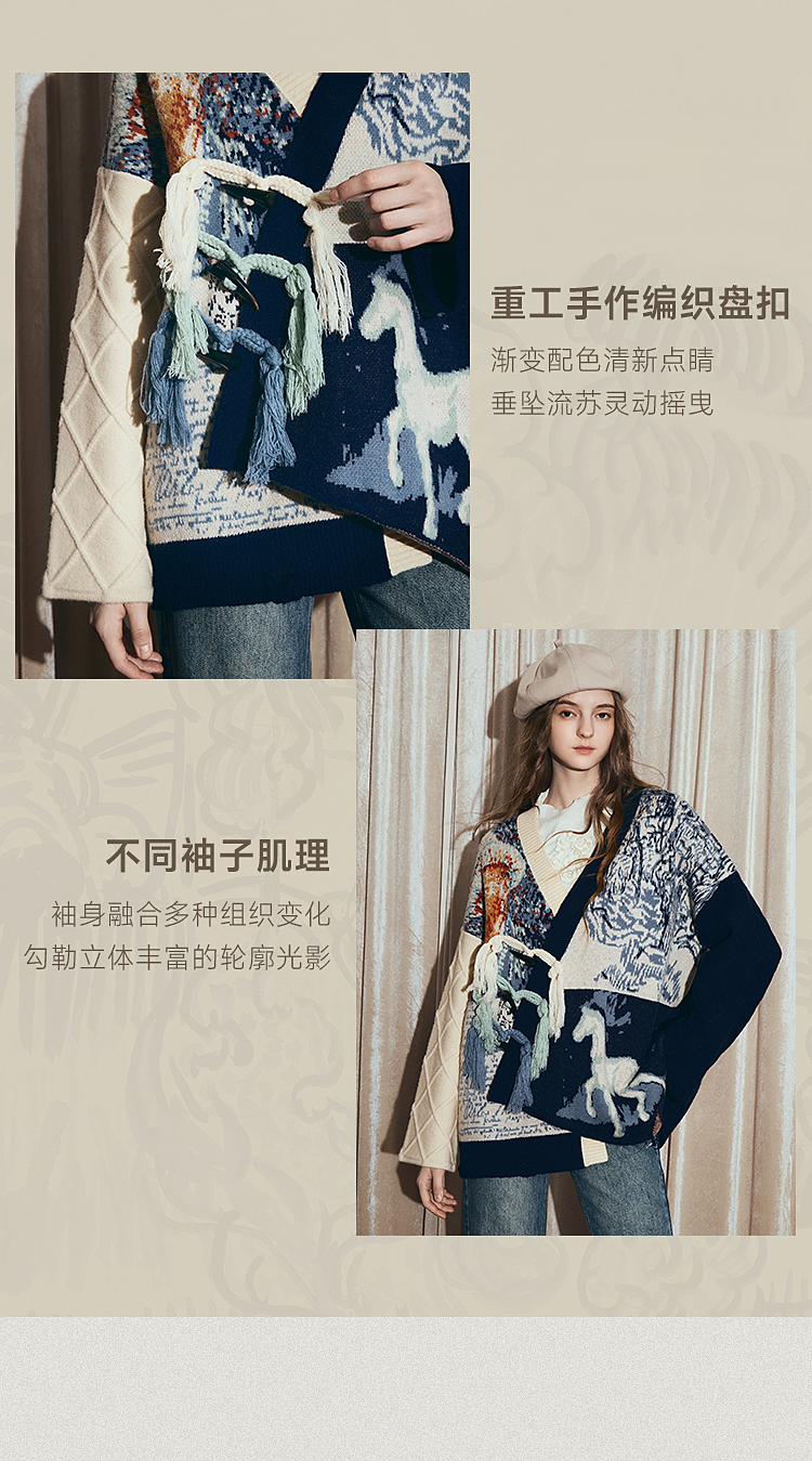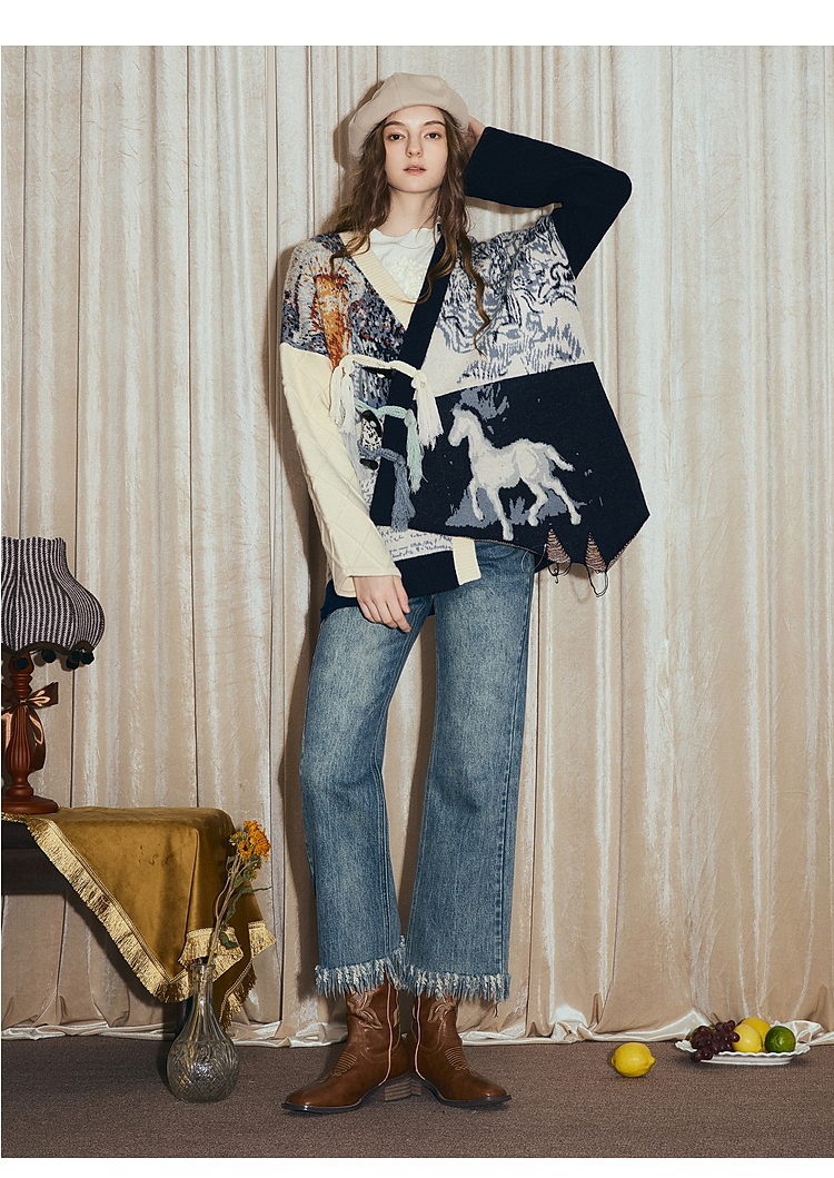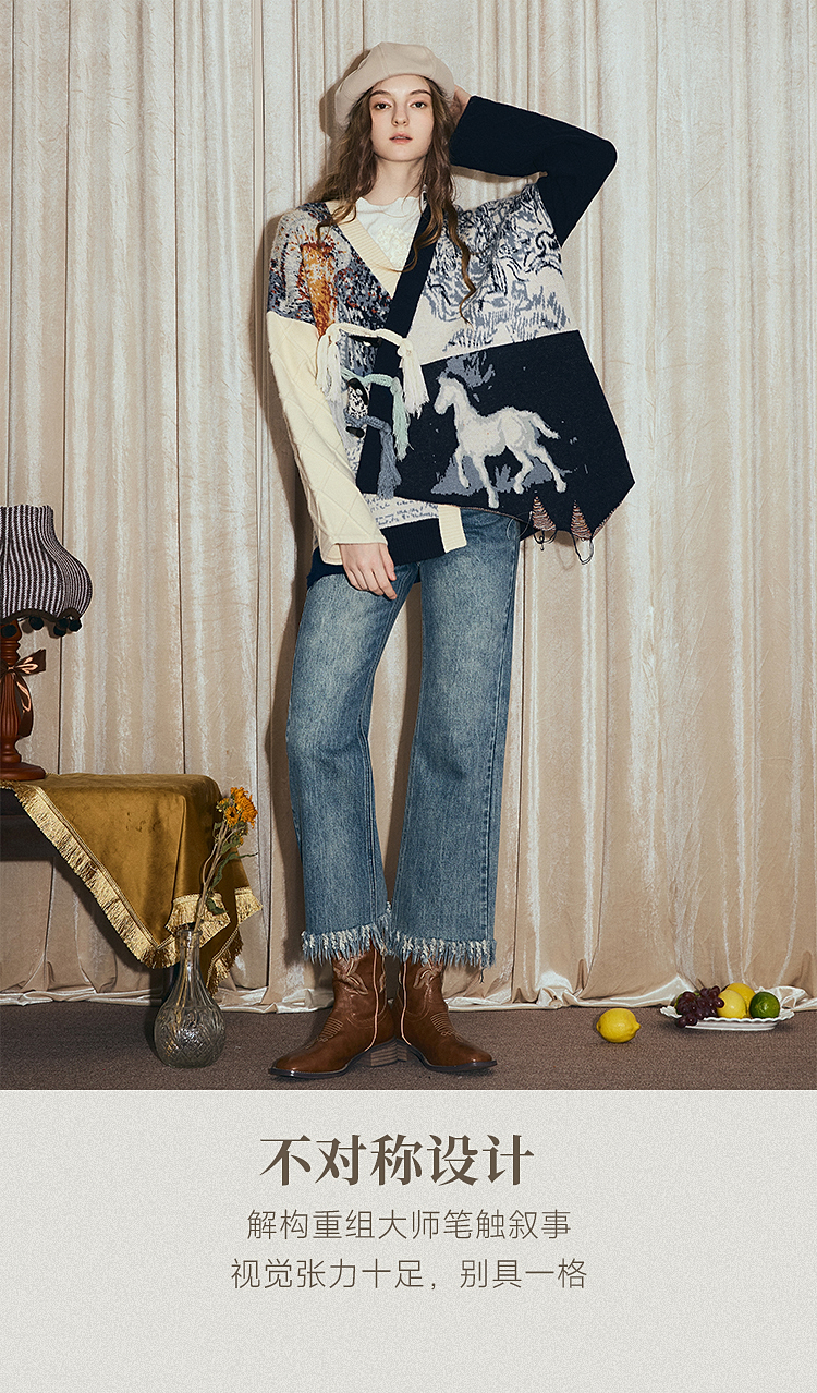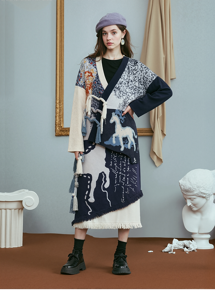 两三事梵高文艺悉尼海岸2025冬新款流苏盘扣不对称花色毛衣外套女