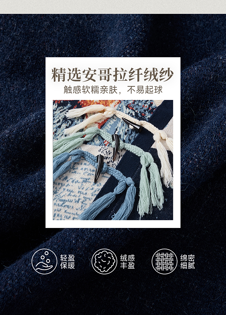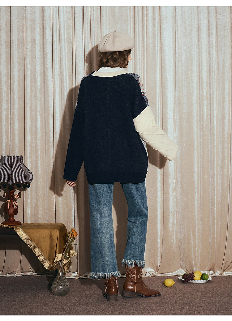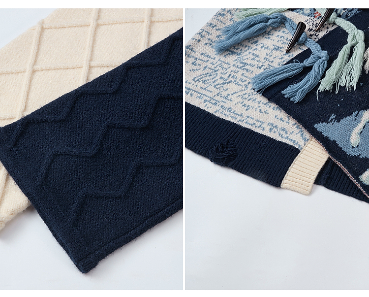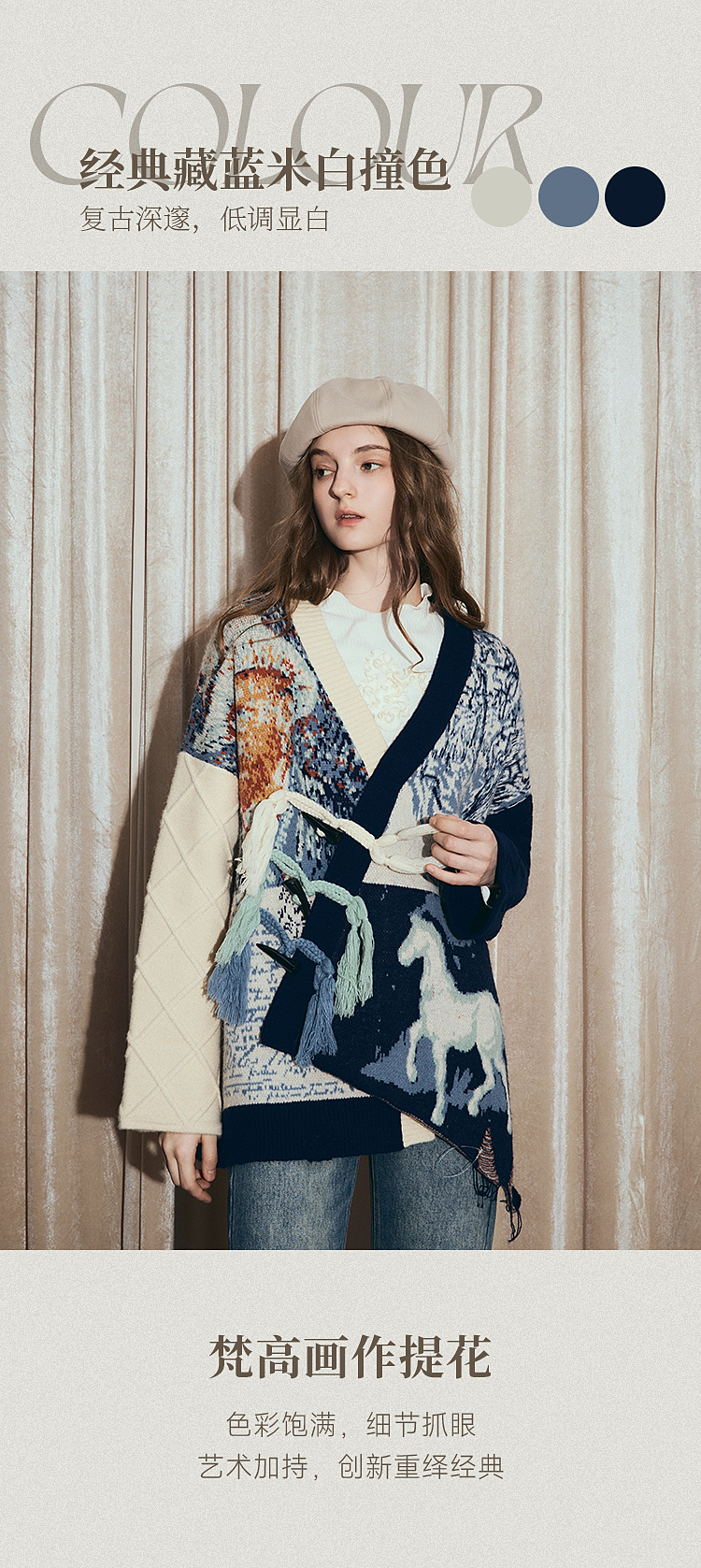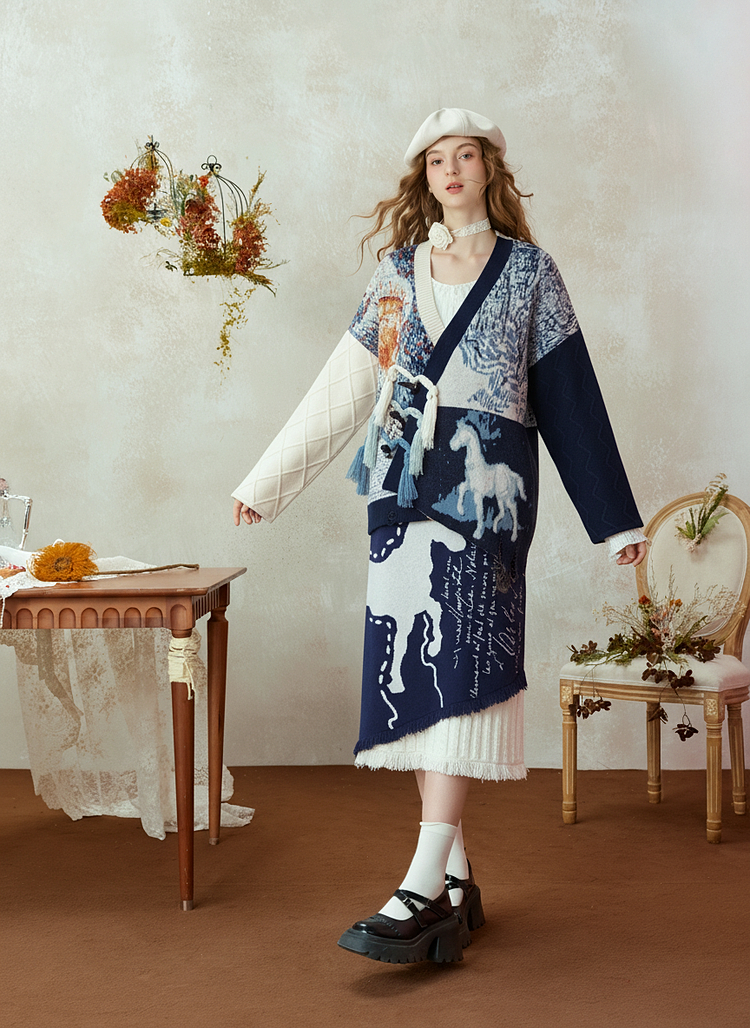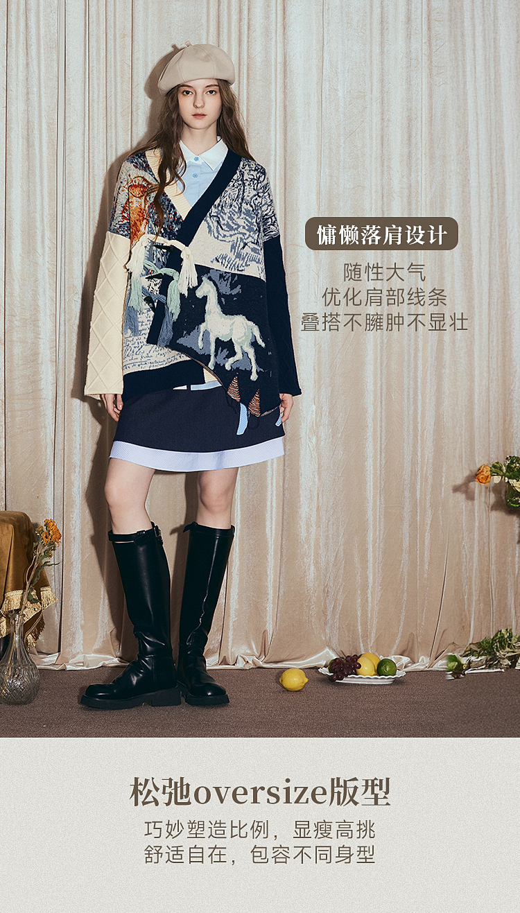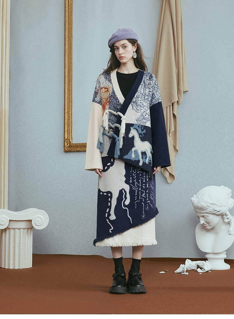 两三事梵高文艺悉尼海岸2025冬新款流苏盘扣不对称花色毛衣外套女