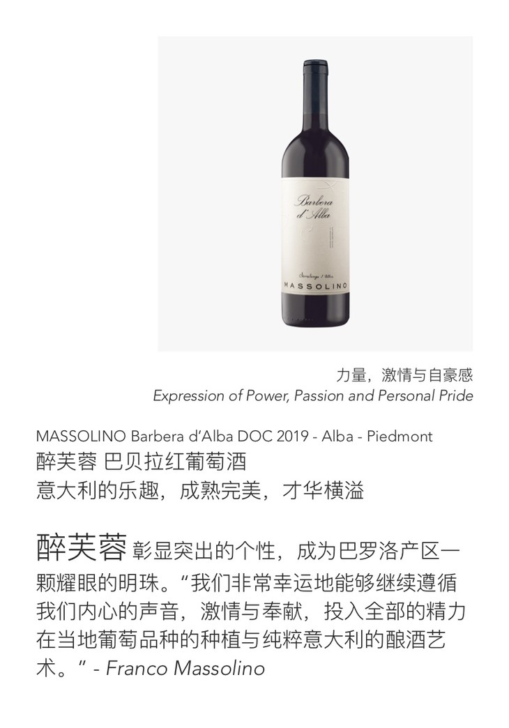 醉芙蓉 巴贝拉红葡萄酒 Massolino Barbera d’Alba DOC 2019